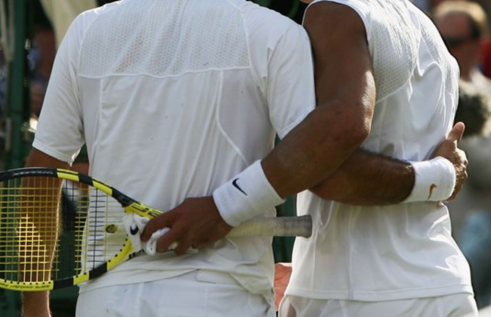Tenniskappinn Roger Federer frá Sviss stimplaði nafn sitt enn frekar í sögubækurnar í dag þegar hann vann sinn fimmta sigur í röð á Wimbledon mótinu eftir æsilegan og dramatískan úrslitaleik gegn Rafael Nadal. Federer jafnaði þar með árangur Björns Borg frá áttunda áratugnum. Federer vann úrslitaleikinn 7-6 4-6 7-6 2-6 og 6-2 og börðust þessir tveir bestu tennisleikarar heims í þrjár klukkustundir og 45 mínútur í stórkostlegum tennisleik í Lundúnum. Federer virtist vera með leikinn í hendi sér eftir að vinna sigur í fyrsta settinu, en sá spænski barðist til baka í tvígang og knúði fram oddasett. Federer féll á kné eftir sigurinn þar sem ljóst var að hann hefði jafnað stórkostlegan árangur Björns Borg frá árunum 1976-80, en Björn var einmitt á meðal áhorfenda í dag. Áhorfendur á mótinu risu úr sætum og hylltu báða spilara í lokin og Nadal gaf Federer eins góða keppni og hann hefur fengið á leið sinni til sigurs á þessum fimm árum. "Hver einasti sigur á þessu móti hefur verið mjög sérstakur fyrir mig, en að spila við mann eins og Nadal og ná að jafna met Björns er alveg einstakt," sagði Federer sem táraðist eftir átökin. "Nadal er frábær spilari og á eftir að verða á toppnum í mörg ár, svo ég nýt þess í hvert skipti sem ég næ að vinna hann núna - því hann á eftir að vinna alla leiki sem hann spilar einn daginn. Þetta var gríðarlega jafn leikur en ég hafði heppnina með mér í dag," sagði Federer. Smelltu á myndirnar hér fyrir neðan og sjáðu stærri myndir frá viðureigninni í dag, sem sýnd var beint á Sýn í fyrsta skipti í ár. AFPAFPAFPAFPNordicPhotos/GettyImages