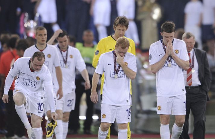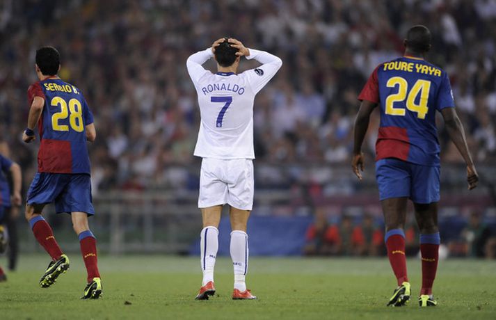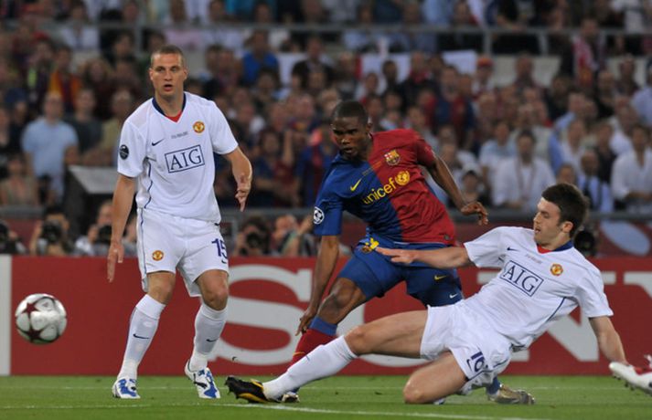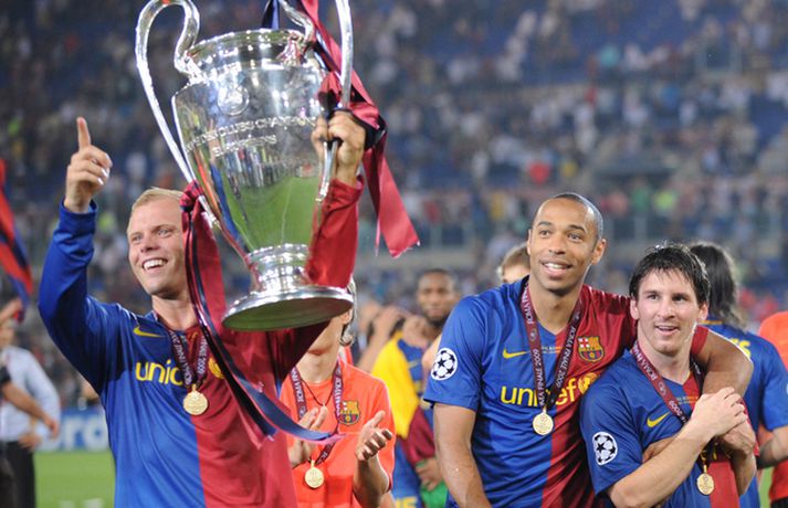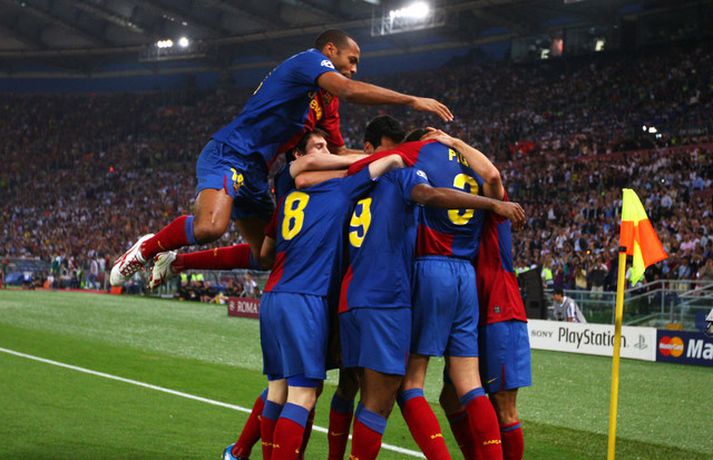 Barcelona varð Evrópumeistari í kvöld og um leið náði Eiður Smári Guðjohnsen áfanga sem maður sér vart nokkurn Íslendinga leika eftir síðar. Eiður Smári er fyrsti Íslendingurinn sem vinnur þessa keppni og sigurinn enn ein rósin í hans hnappagat. Hann er einnig spænskur meistari, spænskur bikarmeistari og svo varð hann enskur meistari með Chelsea á sínum tíma. Það var mikið stuð og mikil dramatík í Róm í kvöld eins og sjá má á myndunum hér að neðan. Eiður Smári lyftir Meistaradeildarbikarnum, fyrstur Íslendinga.Nordic Photos/Getty ImagesSamuel Eto´o skorar fyrsta mark leiksins.Ronaldo svekktur eftir að hafa klúðrað skoti.Guardiola fagnar með Messi en Rooney er svekktur.Henry bregður á leik með bikarinn.Leikmenn United svekktir með silfrið.Eiður og félagar renna sér að bikarnum.Leikmenn Barcelona fagna fyrra markinu.Messi fagnaði marki sínu með því að fara úr skónum og kyssa hann.