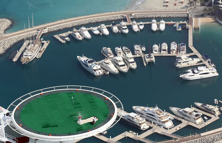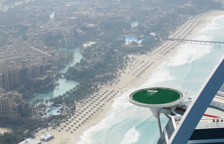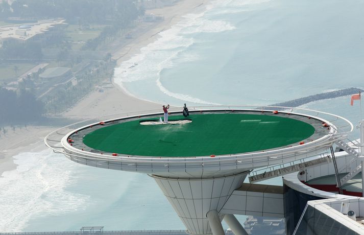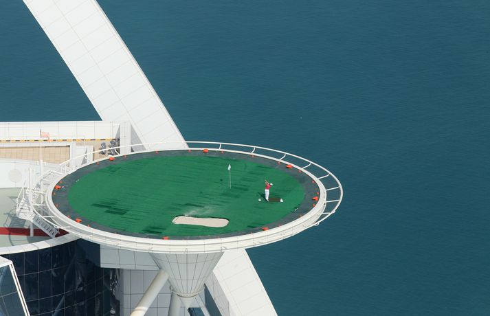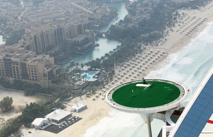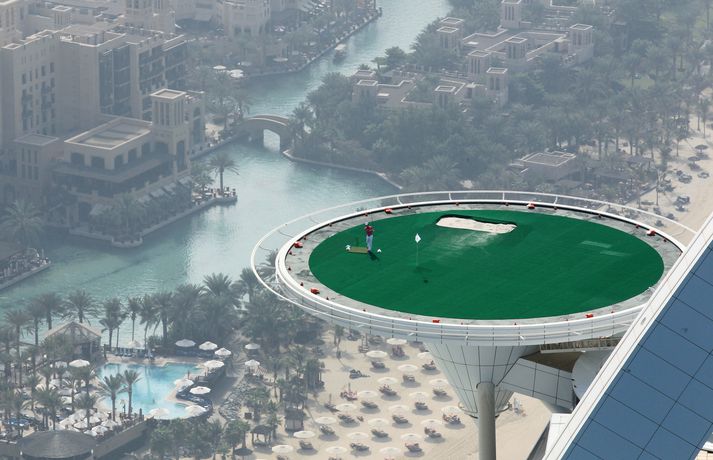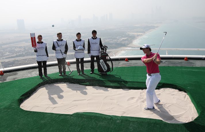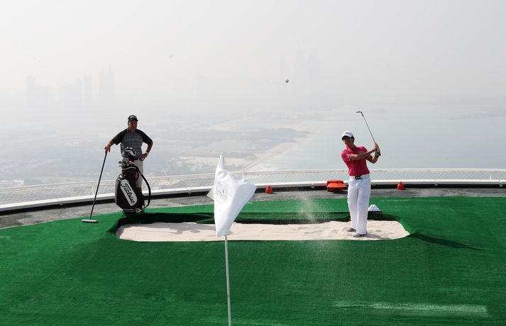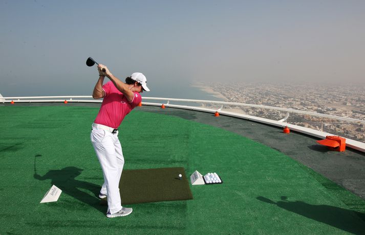 Hinn 22 ára gamli Norður-Íri, Rory McIlroy, hefur átt frábært ár innan sem utan vallar. Hann var sigursæll á vellinum og nældi sér í kærustu sem er besta tenniskona heims. Kappinn fagnaði góðu ári með því að spila golf upp á hinum fræga þyrlupalli á "Seglinu" svokallaða í Dúbaí. Sett var upp aðstaða fyrir McIlroy til þess að spila golf á hótelinu glæsilega og myndirnar sem fylgja eru stórbrotnar. Þær má sjá í albúminu hér að neðan.