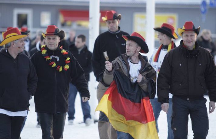 Áhorfendur eru farnir að streyma í keppnishöllina í Jönköping þar sem að keppni í milliriðli á HM í handbolta hefst í dag. Íslendingar leika gegn Þjóðverjum kl. 17.30 og Valgarður Gíslason ljósmyndari Fréttablaðsins og visir.is tók þessar myndir fyrir utan höllina í dag. Myndasyrpan - smelltu hér. Staðan í riðlunum og næstu leikir á HM vefnum á Visir.is Stuðningsmaður íslenska landsliðsins mættur á sævðið í Jönköping.Mynd/Valli