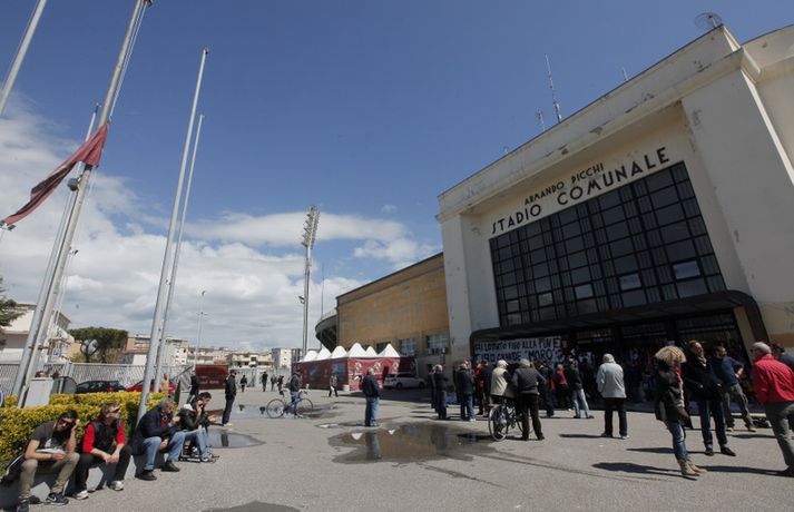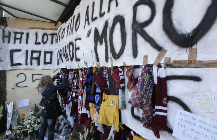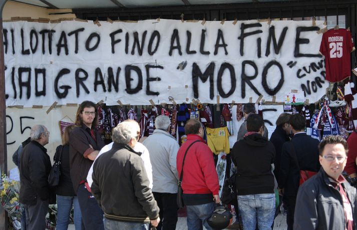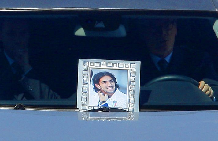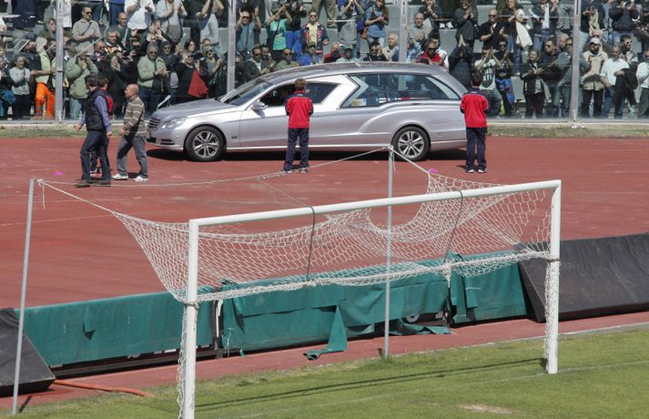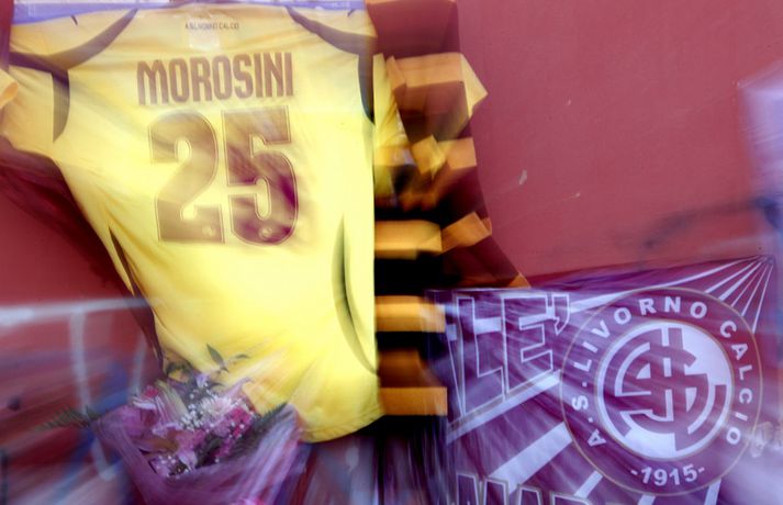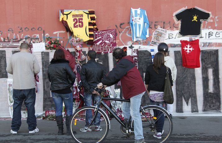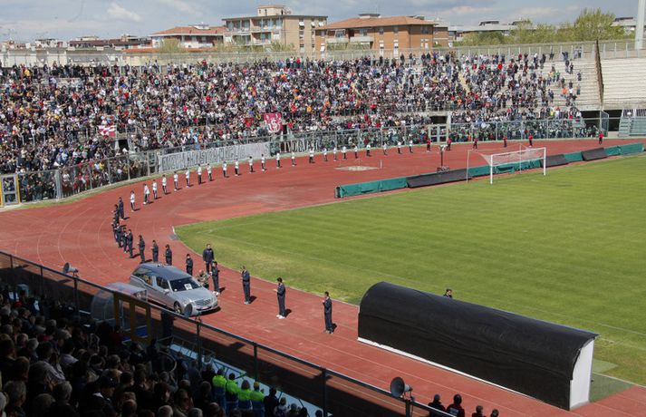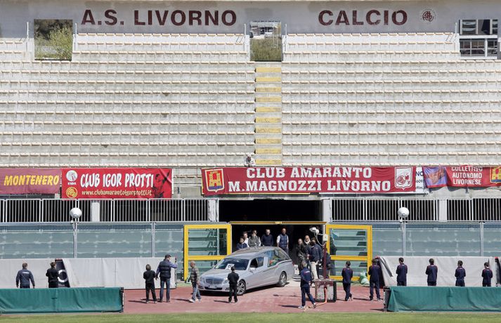 Morosini fékk heiðurslíkfylgd um heimavöll Livorno Óskar Ófeigur Jónsson skrifar 17. apríl 2012 19:30 Mynd/AFP Liðsfélagar Piermario Morosini og þúsundir stuðningsmanna Livorno minntust hans í dag þremur dögum eftir að hann fékk hjartaáfall og lést í miðjum leik Livorno og Pescara í ítölsku b-deildinni. Morosini verður jarðsunginn á morgun í heimabæ sínum Bergamo. Kistan hans Piermario Morosini var keyrð hring í kringum Armando Picchi leikvanginn við sérstaka viðhöfn í dag og á sama tíma stilltu liðsfélagar hans sér upp klæddir Livorno-treyjum númer 25 til heiðurs Morosini. Lag Livorno-liðsins var síðan leikið undir en stuðningsmenn félagsins fjölmenntu í stúkuna. Öllum leikjum á Ítalíu var frestað um helgina í kjölfar fréttanna af láti Piermario Morosini og ítalska sambandið hefur nú gefið það út að mínútuþögn verði fyrir alla leiki á Ítalíu fram á sunnudag. Piermario Morosini var 25 ára miðjumaður sem var hjá Livorno á láni frá Udinese. Hann lék með yngri landsliðum Ítala þar á meðal 18 leiki með 21 árs landsliðinu frá 2006 til 2009. Morosini dó tæpum mánuði eftir að tókst að bjarga Fabrice Muamba sem fékk hjartastopp í bikarleik Tottenham og Bolton á White Hart Lane. Eldri systir hans, sem er fötluð, á nú engan að en fær að búa hjá Antonio Di Natale, fyrirliða og aðalstjörnu Udinese-liðsins. Ítalski boltinn Mest lesið Harma rasíska og transfóbíska grein liðsfélaga Sveindísar Fótbolti Amad bjargaði stigi fyrir United Enski boltinn Alfreð hissa: Veit að Íslendingar geta mun betur Handbolti Gjöf frá mömmu vatt rækilega upp á sig Sport „Fannst þetta verða svartara og svartara“ Handbolti Andri Lucas var kóngurinn á King Power í dag Enski boltinn Segir sönginn um Jota á tuttugustu mínútu hafa áhrif á leik Liverpool Enski boltinn Haaland fór sem Jókerinn að versla bleyjur Enski boltinn Liverpool féll síðast þegar liðið tapaði fimm í röð Enski boltinn Arne Slot: „Þetta er síðasta spurningin sem ég átti von á“ Enski boltinn Fleiri fréttir Emelía innsiglaði sigurinn og liðið á toppnum Andri Lucas í beinni í Doc Zone: „Við setjum hann í skeytin“ Glódís Perla og félagar létu ekki áfall í byrjun stoppa sig Burnley - Arsenal | Toppliðið sækir nýliðana heim Nott. Forest - Man. United | Tekst United að vinna fjórða leikinn í röð? Andri Lucas var kóngurinn á King Power í dag Diljá norskur meistari með Brann Alexandra skoraði en hræðilegur fyrri hálfleikur eyðilagði allt Pablo og Óskar Örn inn í þjálfarateymi Hauka Liverpool féll síðast þegar liðið tapaði fimm í röð Fyrrum þjálfari ársins notaði gervigreindina til að hjálpa sér „Ég er ekki Schmeichel í dulargervi“ FH-ingar kveðja Kjartan Henry Arne Slot: „Þetta er síðasta spurningin sem ég átti von á“ 149 tyrkneskir dómarar í bann vegna veðmála Segir sönginn um Jota á tuttugustu mínútu hafa áhrif á leik Liverpool Harma rasíska og transfóbíska grein liðsfélaga Sveindísar Kóngarnir í Færeyjum: Töpuðu ekki leik allt tímabilið Haaland fór sem Jókerinn að versla bleyjur Fullkomin þrenna kom Lampard úr sjöunda himni Jóladagskráin klár: Hefðin brotin og aðeins einn leikur annan í jólum Sandra hélt áfram að fagna eftir landsleikina Ísland fær eitt lakara lið í sinn riðil Sjáðu besta liðið í föstum leikatriðum leika listir sínar Barcelona skuldar mest en Tottenham er númer tvö Tölur úr Bestu: Bjartur Bjarmi fór í flestar tæklingar af öllum Gísli semur við Skagamenn Óskar Smári tekur við Stjörnunni Mikilvægt fyrir United að hamra járnið meðan það er heitt Félagið í greiðslustöðvun en borgaði öll laun degi fyrr Sjá meira