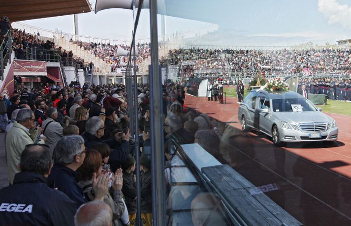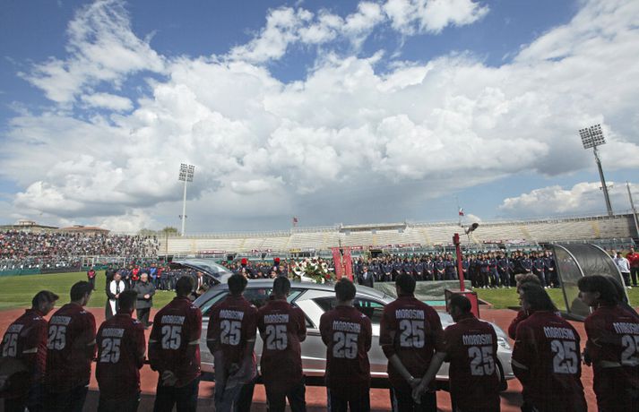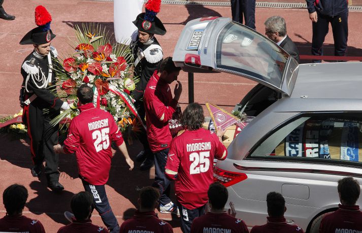 Liðsfélagar Piermario Morosini og þúsundir stuðningsmanna Livorno minntust hans í dag þremur dögum eftir að hann fékk hjartaáfall og lést í miðjum leik Livorno og Pescara í ítölsku b-deildinni. Morosini verður jarðsunginn á morgun í heimabæ sínum Bergamo. Kistan hans Piermario Morosini var keyrð hring í kringum Armando Picchi leikvanginn við sérstaka viðhöfn í dag og á sama tíma stilltu liðsfélagar hans sér upp klæddir Livorno-treyjum númer 25 til heiðurs Morosini. Lag Livorno-liðsins var síðan leikið undir en stuðningsmenn félagsins fjölmenntu í stúkuna. Öllum leikjum á Ítalíu var frestað um helgina í kjölfar fréttanna af láti Piermario Morosini og ítalska sambandið hefur nú gefið það út að mínútuþögn verði fyrir alla leiki á Ítalíu fram á sunnudag. Piermario Morosini var 25 ára miðjumaður sem var hjá Livorno á láni frá Udinese. Hann lék með yngri landsliðum Ítala þar á meðal 18 leiki með 21 árs landsliðinu frá 2006 til 2009. Morosini dó tæpum mánuði eftir að tókst að bjarga Fabrice Muamba sem fékk hjartastopp í bikarleik Tottenham og Bolton á White Hart Lane. Eldri systir hans, sem er fötluð, á nú engan að en fær að búa hjá Antonio Di Natale, fyrirliða og aðalstjörnu Udinese-liðsins.