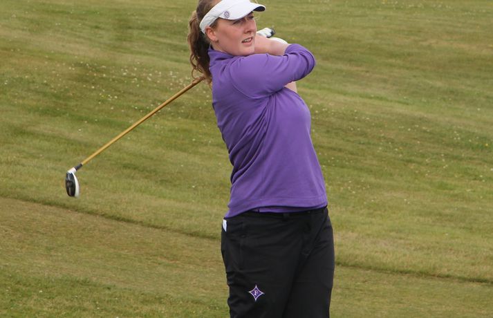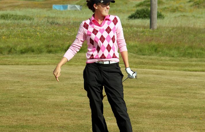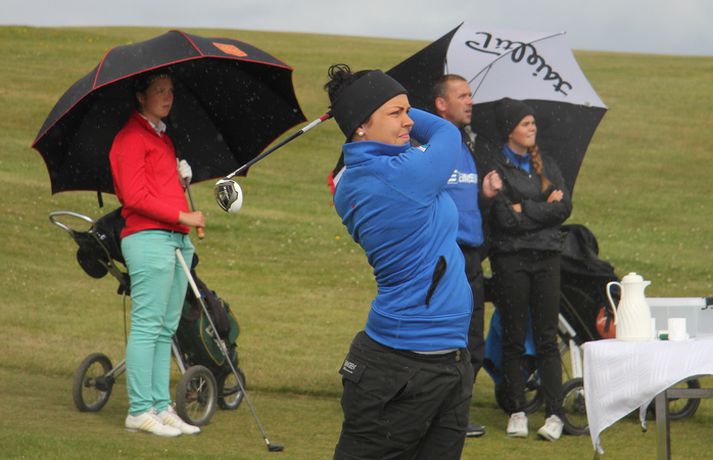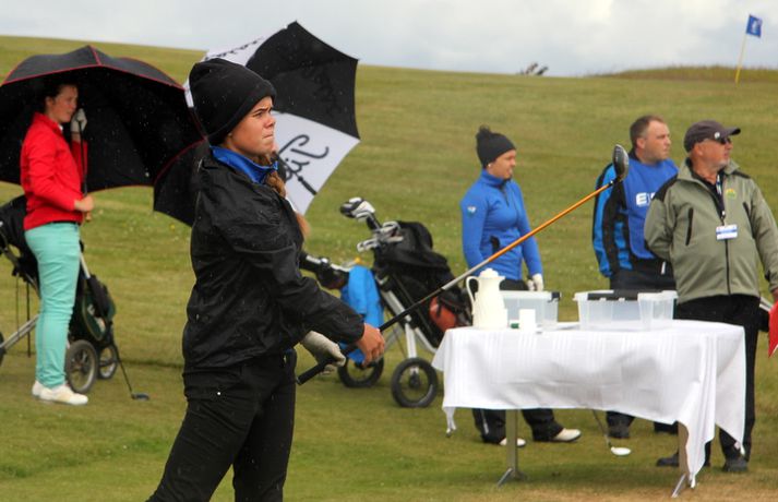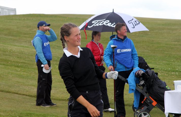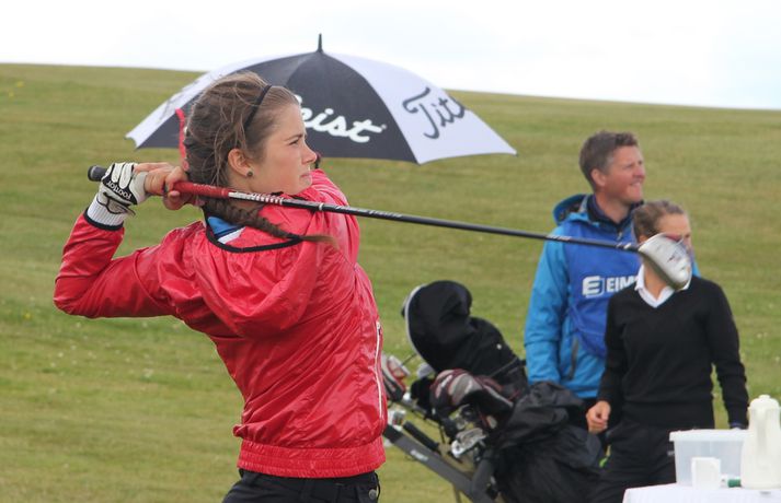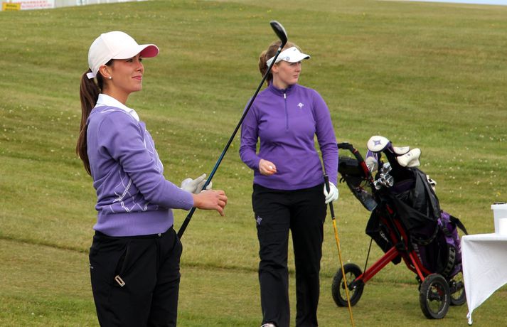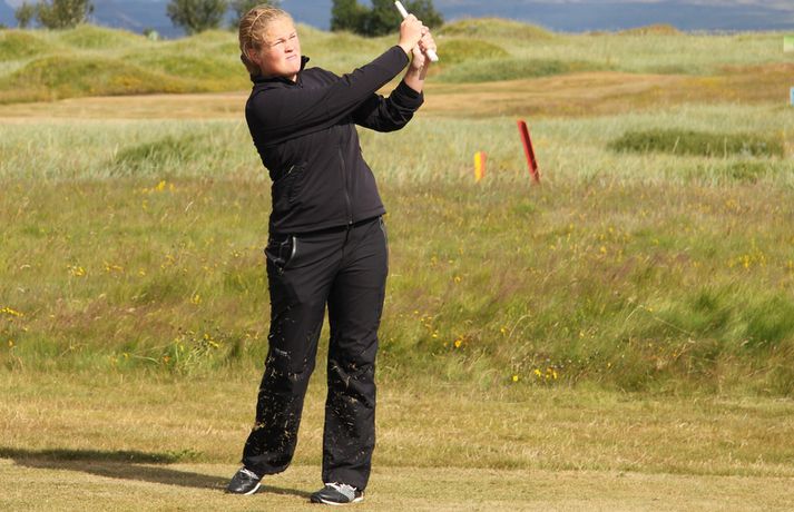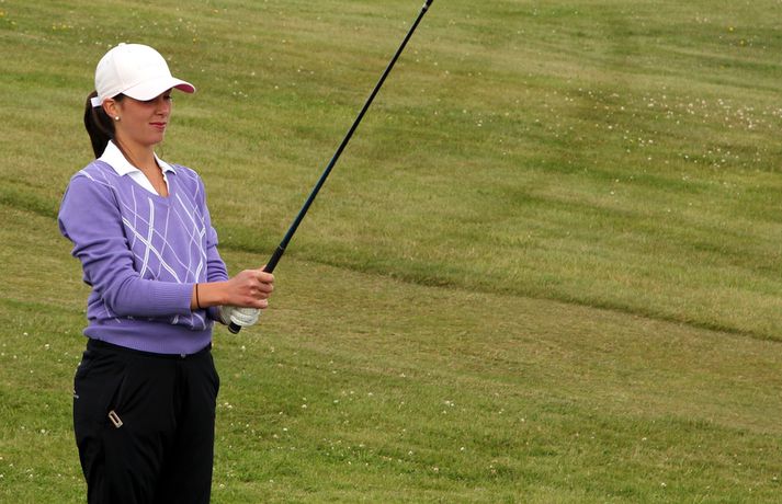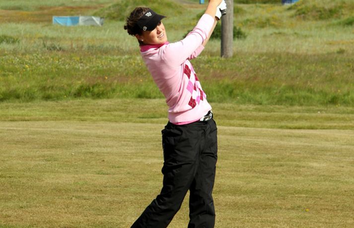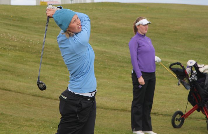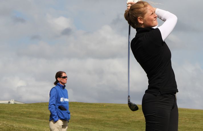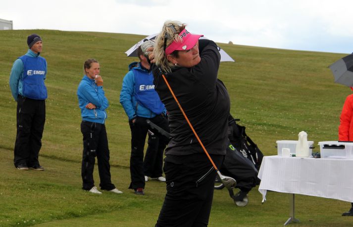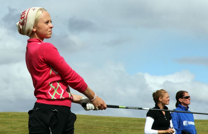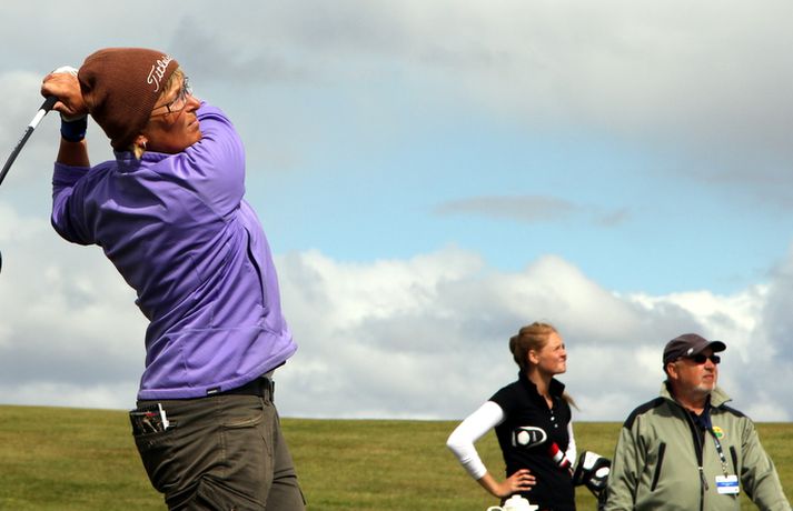 Mikil spenna í kvennaflokknum á Hellu | Valdís í efsta sæti Valdís Þóra Jónsdóttir úr Golfklúbbnum Leyni er í efsta sæti í kvennaflokki að loknum fyrsta keppnisdegi á Íslandsmótinu í höggleik á Eimskipsmótaröðinni. Valdís Þóra lék Strandarvöll á Hellu á einu höggi yfir pari eða 71 höggi. Guðrún Pétursdóttir úr GR og Tinna Jóhnnsdóttir úr Keili eru báðar á 73 höggum eða 3 höggum yfir pari vallar. 26. júlí 2012 21:40