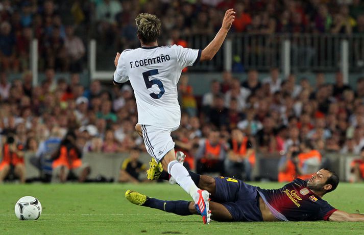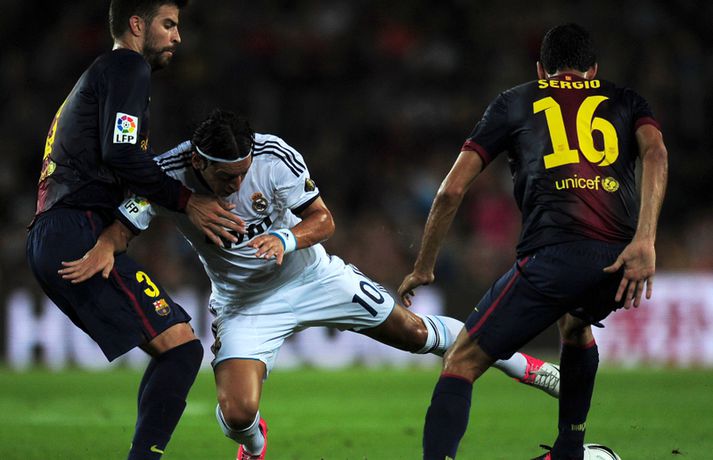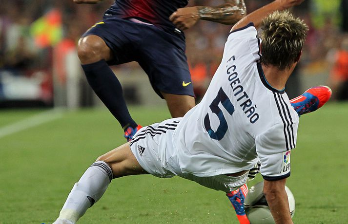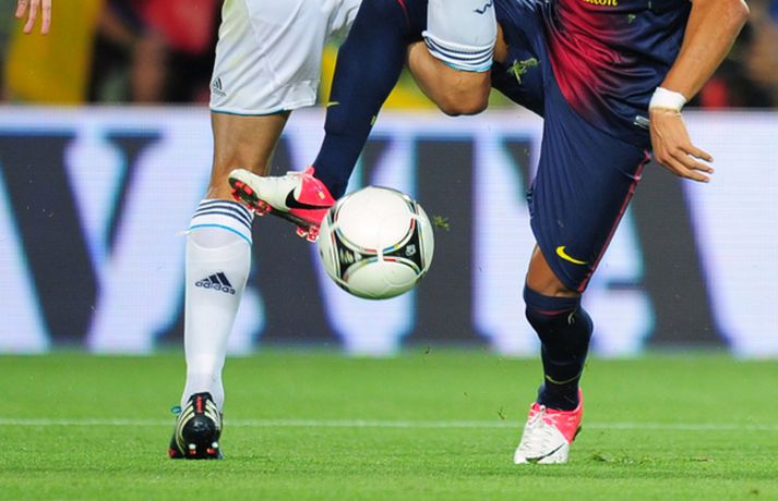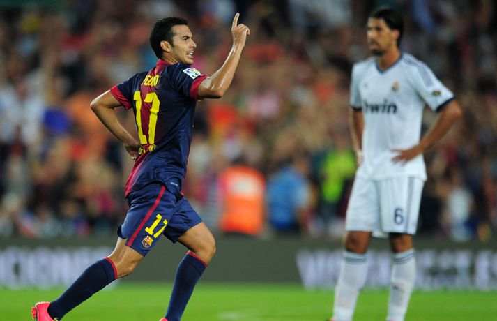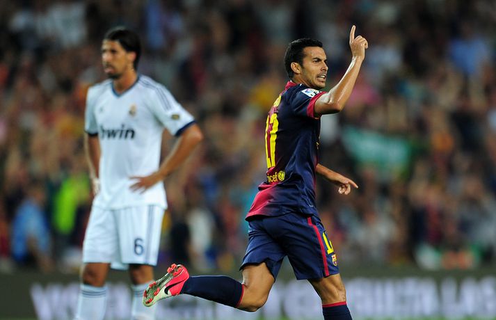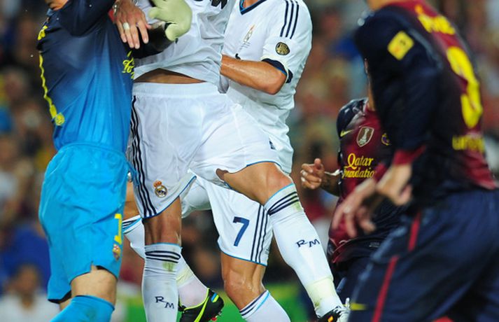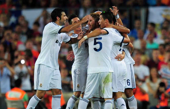 Barcelona og Real Madrid buðu upp á stórkostlega skemmtun í seinni hálfleik í kvöld þegar liðin mættust í fyrri leik sínum í spænska ofurbikarnum á Nývangi í Barcelona. Staðan var 0-0 þar til á 55. mínútu þegar Cristiano Ronaldo kom Real Madrid yfir. Barcelona tók þá öll völd á vellinum og svaraði með þremur mörkum frá þeim Pedro, Lionel Messi og Xavi. Angel Di Maria náði að minnka muninn fimm mínútum fyrir leikslok en það mark gæti orðið dýrmætt fyrir seinni leikinn á Bernabeu enda nægir Real nú bara 1-0 eða 2-1 sigur til að vinna spænska ofurbikarinn. Ljósmyndarar AFP voru mættir á Nou Camp í kvöld og tóku margar flottar myndir. Vísir hefur tekið nokkrar góðar saman í myndasyrpu og myndirnar má sjá í albúminu hér að neðan. Hægt er að sjá myndirnar stærri með því að smella á þær.