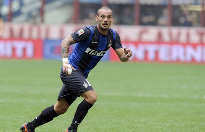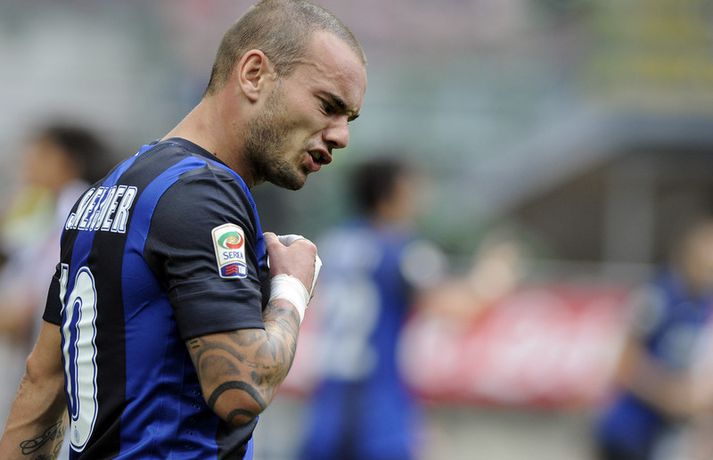 Hollenski fótboltamaðurinn Wesley Sneijder hefur verið að glíma við meiðsli síðan í lok september og hefur því getað einbeitt sér að öðrum hlutum eins og skrifa inn á twitter-síðu. Forrráðamenn Internazionale er ekki ánægðir með það og hafa nú bannað Hollendingnum að tjá sig inn á samskiptasíðunni. Sneijder var búinn að safna sér yfir milljón fylgjendum á síðunni og hafði hingað til sloppið við einhver vandræði vegna skrifa sinna. Kona hans er hinsvegar enn á fullu inn á twitter og það var hún sem skýrði þar frá banni eiginmannsins. „Eiginmaður minn, @sneijder101010, má ekki lengur skrifa inn á twitter. Þetta er ákvörðun félagsins og hann má ekki einu sinni hrósa liðinu þar. Ég er leið yfir þessu enda hefur hann alltaf skilað sínu besta til félagsins. Þetta er skrýtið en í lagi. Allir munu síðan sjá Wesley komast aftur á sigurbraut með Inter," skrifaði eiginkona hans Yolanthe Cabau van Kasbergen en þau hafa verið gift síðan í júlí 2010. Wesley Sneijder meiddist aftan í læri í leik á móti Chievo í lok september og hefur ekkert spilað með Inter síðan.