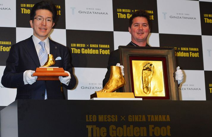 Japanir eru hrifnir af Argentínumanninum Lionel Messi eins og restin af heiminum og nú er hægt að kaupa nákvæma eftirlíkingu af vinstri fæti Messi í Tókíó. Styttan er úr gulli og er metin á um 3,5 milljónir punda eða 662 milljónir íslenskra króna. Rodrigo Messi, bróðir Leo Messi, var viðstaddur þegar gullsmiðurinn Ginza Tanaka afhjúpaði nýju styttuna. "Þetta er einstakt listaverk. Það mótar fyrir hverri einustu línu í fætunum. Þetta er magnað," sagði Rodrigo. Ginza Tanaka ferðaðist til Spánar í lok síðasta árs og fékk að taka mót af vinstri fæti Lionel Messi. Hluti af ágóðanum rennur til góðgerðastofnunnar Messi sem ætlar síðan að styðja við bakið á þeim börnum sem urðu illa úti í jarðskjálftanum og flóðbylgjunni í Japan í mars 2011.