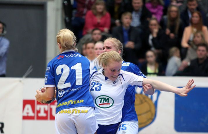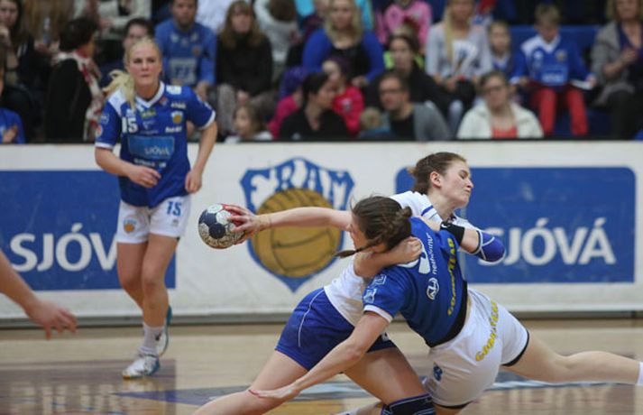 Umfjöllun, viðtöl og myndir: Fram - Stjarnan 20-21 Henry Birgir Gunnarsson skrifar 25. apríl 2013 13:15 Stjarnan fagnar. Mynd/Daníel Stjarnan er komin með 1-0 forskot í rimmunni gegn Fram í úrslitum N1-deildar kvenna. Stjarnan stal fyrsta leiknum í Safamýrinni í dag. Leikurinn var jafn og dramatískur. Bæði lið mættu vel stemmd til leiks. Spiluðu grimma vörn og sóknarleikur beggja liða í basli strax frá upphafi. Eftir því sem leið á hálfleikinn náðu Fram-stúlkur frumkvæðinu og Stjarnan náði ekki að skora í heilar 13 mínútur. Fram nýtti sér það ekki nægilega vel og Stjarnan kom til baka og jafnaði. Mistök beggja liða voru fjölmörg í hálfleiknum og leikurinn hreinlega illa spilaður af beggja hálfu. Leikurinn þó í járnum og munaði einu marki í leikhléi, 11-10. Sama spenna hélt áfram í síðari hálfleik. Stjarnan þó að elta en í stöðunni 17-14 snéru þær leiknum sér í hag. Skoruðu fimm mörk í röð og náðu tveggja marka forskoti, 17-19. Þá tók Fram leikhlé. Það skilaði sínu því Fram skoraði næstu tvö mörk og jafnaði leikinn. Lokakaflinn var því æsispennandi. Jóna Margrét kom Stjörnunni yfir með frábæru skoti er 20 sekúndur voru eftir af leiknum. Fram tók leikhlé til að kortleggja lokasóknina. Hún gekk ekki upp og Elísabet tók neyðarskot úr aukakasti er sekúnda var eftir. Það var varið og Stjarnan fagnaði. Elísabet annars best í Fram-liðinu og Sunna einnig drjúg. Jóna Margrét aftur hetja Stjörnunnar og Sunneva varði oft á tíðum frábærlega. Jóna Margrét: Verður einhver að vera hetjanÞað fer að verða daglegt brauð hjá Jónu Margréti Ragnarsdóttur að vera hetja Stjörnunnar. Hún skaut liðinu í úrslitin og skoraði svo sigurmarkið í dag með frábæru skoti. "Það þarf einhver að taka það að sér að vera hetjan," sagði Jóna Margrét og hló við. "Þetta hefur bara spilast svona. Ég var að hitta í dag þannig að það var kannski bara ágætt að ég tók af skarið núna." Jóna Margrét átti heilt yfir flottan leik en hún vildi sem minnst gera úr eigin frammistöðu. "Ég er bara í frábæru liði. Ég get ekki skorað nema félagar mínir spili mig uppi og dragi í sig menn. Ég er heppin að vera í frábæru liði." Það var lengi vel mikið basl á sóknarleiknum hjá Stjörnunni en í stöðunni 17-14 snéru þær leiknum sér í hag. "Þá förum við að mæta almennilega á boltann. Við vorum búnar að vera mjög staðar fram að því. Við fengum líka Esther í gang sem var geðveikt mikilvægt." Stjarnan steig stórt skref í átt að titlinum í dag. Búin að stela útileik en Jóna er alveg róleg. "Við erum litla liðið í þessari rimmu þannig að það er engin pressa á okkur. Þessi umræða um heimaleikjaréttin er samt svo mikið bull. Þetta er bara spurning um dagsform," sagði Jóna og hrósaði svo fjölskyldu sinni fyrir góða mætingu. "Það var öll ættin hérna. Þetta var eins og á ættarmóti. Ég átti svona 300 manns í stúkunni." Halldór: Stella fékk ekki næga verndHalldór Jóhann Sigfússon, þjálfari Fram, var þungur á brún eftir leikinn. "Við gefum eftir undir lokin og fáum á okkur allt of ódýr mörk. Við hefðum átt að nýta meðbyrinn og klára leikinn. Þetta var svo jafn leikur og þær voru heppnari en við í lokin," sagði Halldór. Halldór var mjög óhress með dómarana í síðari hálfleik og hvæsti nokkrum sinnum á þá. Var hann mjög ósáttur við þeirra framlag? "Ég ætla ekkert að tjá mig um þá. Það er eðlilegt að það sé aðeins líf í leiknum. Hver sá sem horfði á leikinn verður að dæma um það sjálfur," sagði Halldór. Stella Sigurðardóttir fékk óblíðar móttökur frá varnarmönnum Stjörnunnar. Hvað fannst Halldóri um þá meðferð sem hún fékk? "Þetta er eðlileg meðferð en ég er ósáttur við að Stjörnunni hafi ekki verið refsað meira fyrir þessi brot. Ég var ekki ánægður með þá vernd sem hún fékk en ég ætla ekkert að væla yfir því hvernig það var. Við töpuðum þessu samt ekki á dómgæslunni. Það er alveg klárt."Jóna var frábær í dag.Mynd/DaníelÞað var tekið hraustlega á Stellu í dag.Mynd/Daníel Olís-deild kvenna Mest lesið „Örugglega nokkrir Fantasy-þjálfarar ósáttir“ Enski boltinn „Það verður hundleiðinlegt að spila við Val“ Íslenski boltinn „Haaland er þetta góður“ Enski boltinn Kærastan tók eftir því að eitthvað var að Handbolti Tilþrif 5. umferðar: Jukic stal senunni Körfubolti Lygilega jafnt á toppnum eftir sigur AC Milan Fótbolti Dagskráin í dag: Sú elsta og virtasta, enska úrvalsdeildin og Extra Sport Ítalinn hoppaði upp fyrir Alcaraz eftir sigur í París Sport Viðtökurnar á Anfield munu ekki breyta neinu Fótbolti Uppgjörið: Þýskaland - Ísland 29-31 | Svöruðu skellinum með frábærum sigri Handbolti Fleiri fréttir Uppgjörið: Þýskaland - Ísland 29-31 | Svöruðu skellinum með frábærum sigri Kærastan tók eftir því að eitthvað var að KA/Þór gerði jafntefli við botnliðið Valskonur unnu 24 marka sigur og ÍR upp í annað sætið „Fannst þetta verða svartara og svartara“ Alfreð hissa: Veit að Íslendingar geta mun betur Andri kallaður inn í hópinn fyrir meiddan Hauk Arnór Snær snýr aftur heim Besta handboltadeild heims missir aðalstyrktaraðila sinn Grafalvarleg staða: „Þurfum að fara í sársaukafullar aðgerðir“ ÍR áfram eftir sigur í Mosfellsbæ Uppgjörið: Þýskaland - Ísland 42-31 | Þrot í Þýskalandi Tilkynnti um óléttu og nýjan samning á sama tíma Patrekur hættur eftir dapurt gengi Stjörnunnar Rekinn fyrir ummæli sín um krabbameinssjúka handboltagoðsögn Janus Daði myndaður í heimsókn hjá Barcelona Epicbet sýni handboltann í leyfisleysi: „Enda ólöglegar síður“ Teitur inn í landsliðið Gísli bjó til meira en þri
