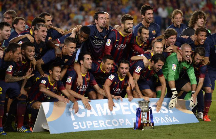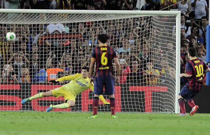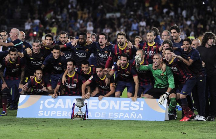 Messi klikkaði á víti en Barca vann samt fyrsta titilinn Óskar Ófeigur Jónsson skrifar 28. ágúst 2013 23:00 Mynd/AFP Barcelona landaði fyrsta titli tímabilsins í kvöld þegar liðið gerði markalaust jafntefli við Atlético Madrid á heimavelli í seinni leik liðanna um spænska ofurbikarinn. Barcelona vann Ofurbikarinn á fleiri mörkum skoruðum á útivelli en Atlético Madrid endaði leikinn níu á móti ellefu því tveir leikmenn liðsins fengu að líta rauða spjaldið á lokamínútunum. Lionel Messi gat tryggt Barcelona sigur í leiknum þegar hann tók víti á 89. mínútu leiksins en skaut þá í slá. Barcelona vann ofurbikarinn á endanum á fleiri mörkum skoruðum á útivelli. Brasilíumaðurinn Filipe Luís fékk rauða spjaldið á 81. mínútu fyrir brot á Daniel Alves og Tyrkinn Arda Turan fór sömu leið í uppbótartíma. Brasilíumaðurinn Neymar tryggði Barcelona 1-1 jafntefli í fyrri leiknum á heimavelli Atlético eftir að David Villa, fyrrum leikmaður Barcelona, hafði komið sínum mönnum yfir í fyrri hálfleiknum. Þetta mark Neymar tryggði því Barcelona fyrsta titilinn eftir að hann kom til félagsins en Barcelona var að vinna spænska ofurbikarinn í fimmtánda sinn þar af í fjórða sinn á síðustu fimm árum. Lionel Messi og Neymar voru báðir í byrjunarliði Barcelona og spiluðu allan leikinn. Þetta er fyrsti leikurinn þar sem þeir spila 90 mínútur saman. Messi átti ekki góðan dag og ýtir þetta undir kenningar manna að þeir geti ekki báðir blómstrað á sama tíma. Spænski boltinn Mest lesið Kristófer Acox kallar sig glæpamann Körfubolti Svona var blaðamannafundur Arnars Fótbolti Rooney að kenna að Liverpool er komið á sigurbrautina á ný? Enski boltinn Arnar Gunnlaugsson las yfir vælandi fýlupúkum hjá Real Madrid Fótbolti Mál Alberts truflar landsliðið ekki Fótbolti Littler kjörinn kynþokkafyllsti íþróttamaður heims Sport Hópurinn fyrir lokaleikina: Hörður og Jóhann snúa aftur Fótbolti „Ég myndi ekki óska neinum þess að lenda í þessu“ Fótbolti Besta tenniskona heims tekur þátt í nýrri „Baráttu kynjanna“ Sport Fékk faðmlag frá konu Diogo Jota í miðju maraþoni Enski boltinn Fleiri fréttir Dældi fyrri afrekum inn á Instagram eftir vonbrigðin Valdi Isak en ekki Gyökeres í fyrsta landsliðshópinn sinn Leiðir Breiðabliks og Damir skilja Mál Alberts truflar landsliðið ekki Stuðningsmenn Bröndby enn á ný í vandræðum Vonar að Jóhann og Hörður gefi jafn mikið af sér og Aron Orri Steinn lengra frá því að ná þessum leikjum en þeim í síðasta glugga Hópurinn fyrir lokaleikina: Hörður og Jóhann snúa aftur Svona var blaðamannafundur Arnars Rooney að kenna að Liverpool er komið á sigurbrautina á ný? Ánægð með að mæta Íslandi „Ég myndi ekki óska neinum þess að lenda í þessu“ Fékk faðmlag frá konu Diogo Jota í miðju maraþoni Arnar Gunnlaugsson las yfir vælandi fýlupúkum hjá Real Madrid Sjáðu sigurmark Liverpool á móti Real Madrid og mörkin hjá Arsenal í Prag „Við viljum koma Haukum á fótboltakortið“ Ógnaði leikmanni Tottenham með byssu út á götu Þurfti að kaupa nýjan iPhone fyrir alla í liðinu Segir Amorim ekki geta gert kraftaverk Arsenal jafnaði rúmlega aldargamalt félagsmet Jafnteflin ríkjandi í Meistaradeildinni í kvöld Liverpool vann risaslaginn Meistararnir lágu á heimavelli Sneypuför danskra til Lundúna Natasha semur við nýliða Grindavíkur/Njarðvíkur Slavia Prag engin fyrirstaða fyrir Arsenal Ráku lærlinga sem fögnuðu marki í beinni Falla fleiri gleðitár hjá fjölskyldu Viktors í kvöld? David Beckham aðlaður: „Ég gæti ekki verið stoltari“ Fram líka fljótt að finna nýja ást Sjá meira