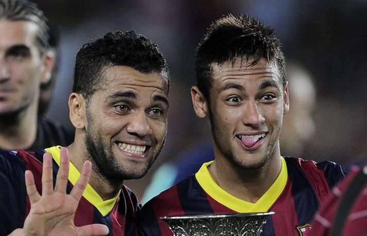 Barcelona landaði fyrsta titli tímabilsins í kvöld þegar liðið gerði markalaust jafntefli við Atlético Madrid á heimavelli í seinni leik liðanna um spænska ofurbikarinn. Barcelona vann Ofurbikarinn á fleiri mörkum skoruðum á útivelli en Atlético Madrid endaði leikinn níu á móti ellefu því tveir leikmenn liðsins fengu að líta rauða spjaldið á lokamínútunum. Lionel Messi gat tryggt Barcelona sigur í leiknum þegar hann tók víti á 89. mínútu leiksins en skaut þá í slá. Barcelona vann ofurbikarinn á endanum á fleiri mörkum skoruðum á útivelli. Brasilíumaðurinn Filipe Luís fékk rauða spjaldið á 81. mínútu fyrir brot á Daniel Alves og Tyrkinn Arda Turan fór sömu leið í uppbótartíma. Brasilíumaðurinn Neymar tryggði Barcelona 1-1 jafntefli í fyrri leiknum á heimavelli Atlético eftir að David Villa, fyrrum leikmaður Barcelona, hafði komið sínum mönnum yfir í fyrri hálfleiknum. Þetta mark Neymar tryggði því Barcelona fyrsta titilinn eftir að hann kom til félagsins en Barcelona var að vinna spænska ofurbikarinn í fimmtánda sinn þar af í fjórða sinn á síðustu fimm árum. Lionel Messi og Neymar voru báðir í byrjunarliði Barcelona og spiluðu allan leikinn. Þetta er fyrsti leikurinn þar sem þeir spila 90 mínútur saman. Messi átti ekki góðan dag og ýtir þetta undir kenningar manna að þeir geti ekki báðir blómstrað á sama tíma.