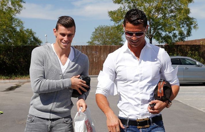 Það var skemmtileg stund á bílastæði Real Madrid í morgun þegar tveir dýrustu leikmenn knattspyrnusögunnar hittust í fyrsta skipti hjá félaginu. Cristiano Ronaldo var dýrasti leikmaður heims er Real keypti hann frá Man. Utd. Það met var síðan slegið á dögunum er Real greiddi Tottenham 16 milljarða króna fyrir Gareth Bale. Það fór vel á með þeim félögum en heimurinn bíður spenntur eftir því að sjá þá spila saman. Það gerist líklega um næstu helgi er Real Madrid spilar gegn Villarreal. Bæði Marcelo og Fabio Coentrao meiddust í landsleikjum og því gæti vel farið svo að Bale spili sinn fyrsta leik í bakvarðarstöðu.
