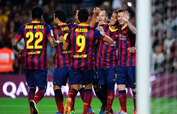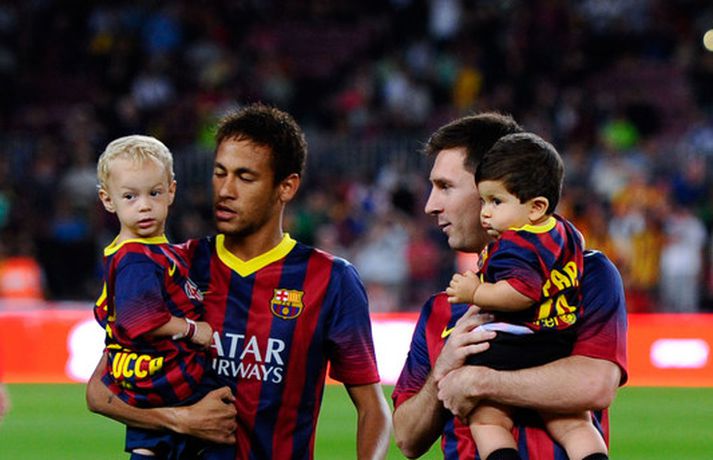 Neymar og Messi skoruðu báðir í sigri Barcelona Óskar Ófeigur Jónsson skrifar 24. september 2013 17:30 Lionel Messi og Neymar með syni sína fyrir leikinn, Davi Lucca (Neymar) og Thiago (Messi). Nordicphotos/Getty Barcelona hélt áfram sigurgöngu sinni í spænsku úrvalsdeildinni í kvöld þegar liðið vann 4-1 heimasigur á Real Sociedad í sjöttu umferð tímabilsins. Barca er með fullt hús og 22 mörk í fyrstu sex leikjum sínum. Neymar skoraði sitt fyrsta deildarmark í kvöld og þetta var ennfremur fyrsti leikur liðsins þar sem hann og Lionel Messi skora báðir. Barcelona byrjaði af krafti og eftir aðeins átta mínútur var Neymar búinn að skora eftir sendingu Dani Alveg og leggja upp skallamark fyrir Lionel Messi. Sergio Busquets skoraði þriðja markið á 23. mínútu eftir að Messi hafi skömmu áður skotið í bæði slá og stöng. Yfirburðir Barcelona voru miklir og þeir fóru kæruleysislega með nokkur úrvalsfæri eftir snilldar samleik þar sem Neymar, Andrés Iniesta og Messi voru vanalega í fararbroddi. Messi náði ekki að bæta við mörkum þrátt fyrir ákjósanlega færi en er kominn með sjö mörk í fyrstu sex umferðunum. Það leit út fyrir að Barcelona ætlaði hreinlega að niðurlægja liðsmenn Real Sociedad en gestirnir gáfust ekki upp og náðu að bjarga aðeins andlitinu með góðum seinni hálfleik. Alberto De La Bella náði að minnka muninn í 3-1 á 64. mínútu og setja smá spennu í leikinn en Marc Bartra innsiglaði sigurinn á 77. mínútu eftir stoðsendingu frá Lionel Messi. Spænski boltinn Mest lesið Kristófer Acox kallar sig glæpamann Körfubolti Svona var blaðamannafundur Arnars Fótbolti Rooney að kenna að Liverpool er komið á sigurbrautina á ný? Enski boltinn Arnar Gunnlaugsson las yfir vælandi fýlupúkum hjá Real Madrid Fótbolti Mál Alberts truflar landsliðið ekki Fótbolti Littler kjörinn kynþokkafyllsti íþróttamaður heims Sport Hópurinn fyrir lokaleikina: Hörður og Jóhann snúa aftur Fótbolti „Ég myndi ekki óska neinum þess að lenda í þessu“ Fótbolti Besta tenniskona heims tekur þátt í nýrri „Baráttu kynjanna“ Sport Fékk faðmlag frá konu Diogo Jota í miðju maraþoni Enski boltinn Fleiri fréttir Dældi fyrri afrekum inn á Instagram eftir vonbrigðin Valdi Isak en ekki Gyökeres í fyrsta landsliðshópinn sinn Leiðir Breiðabliks og Damir skilja Mál Alberts truflar landsliðið ekki Stuðningsmenn Bröndby enn á ný í vandræðum Vonar að Jóhann og Hörður gefi jafn mikið af sér og Aron Orri Steinn lengra frá því að ná þessum leikjum en þeim í síðasta glugga Hópurinn fyrir lokaleikina: Hörður og Jóhann snúa aftur Svona var blaðamannafundur Arnars Rooney að kenna að Liverpool er komið á sigurbrautina á ný? Ánægð með að mæta Íslandi „Ég myndi ekki óska neinum þess að lenda í þessu“ Fékk faðmlag frá konu Diogo Jota í miðju maraþoni Arnar Gunnlaugsson las yfir vælandi fýlupúkum hjá Real Madrid Sjáðu sigurmark Liverpool á móti Real Madrid og mörkin hjá Arsenal í Prag „Við viljum koma Haukum á fótboltakortið“ Ógnaði leikmanni Tottenham með byssu út á götu Þurfti að kaupa nýjan iPhone fyrir alla í liðinu Segir Amorim ekki geta gert kraftaverk Arsenal jafnaði rúmlega aldargamalt félagsmet Jafnteflin ríkjandi í Meistaradeildinni í kvöld Liverpool vann risaslaginn Meistararnir lágu á heimavelli Sneypuför danskra til Lundúna Natasha semur við nýliða Grindavíkur/Njarðvíkur Slavia Prag engin fyrirstaða fyrir Arsenal Ráku lærlinga sem fögnuðu marki í beinni Falla fleiri gleðitár hjá fjölskyldu Viktors í kvöld? David Beckham aðlaður: „Ég gæti ekki verið stoltari“ Fram líka fljótt að finna nýja ást Sjá meira