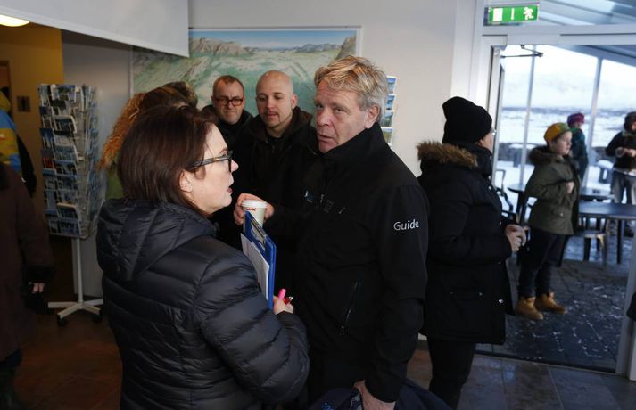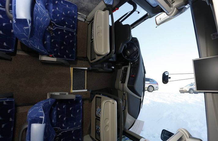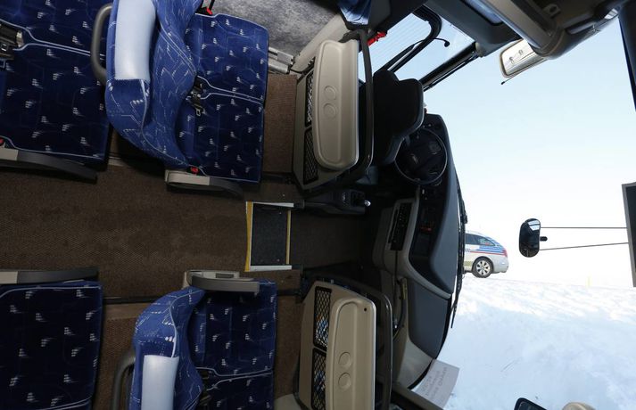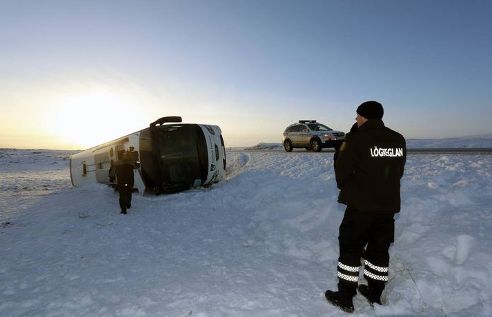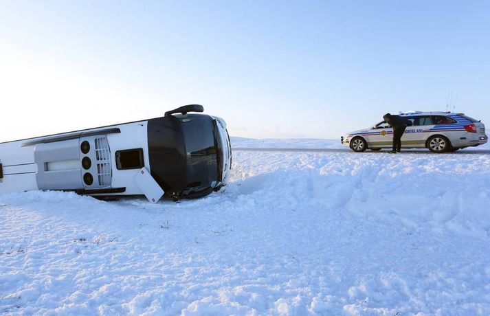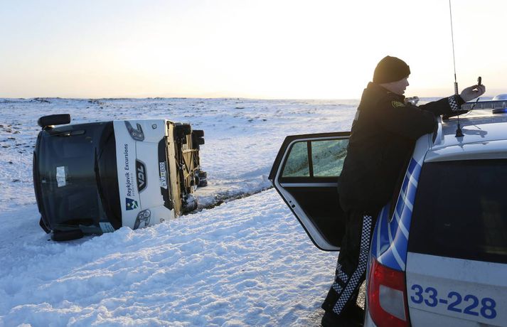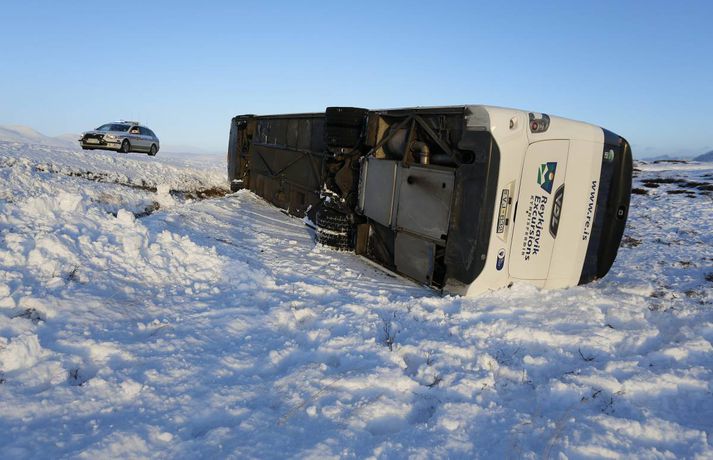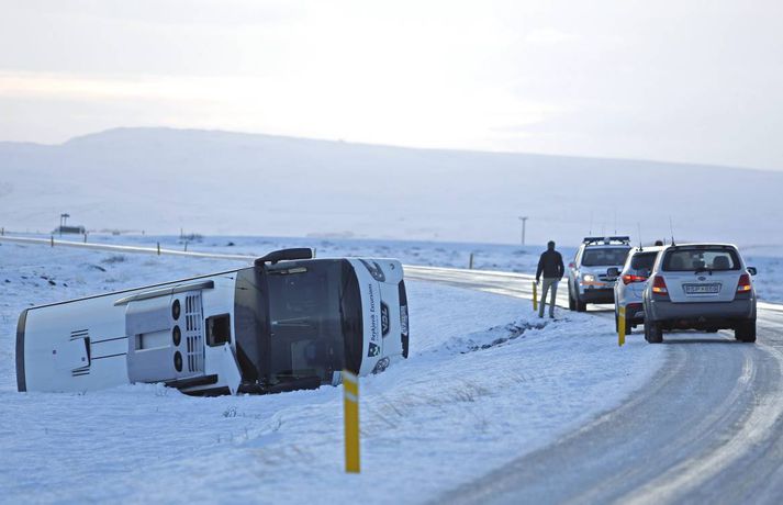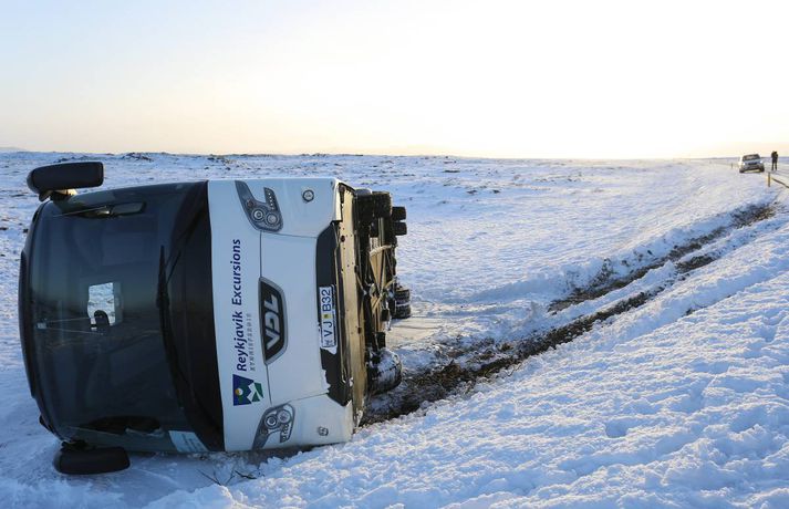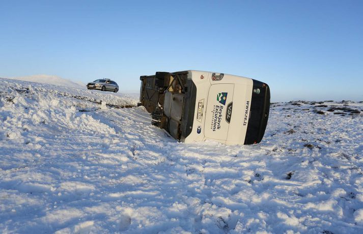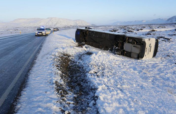 Rúta valt við Öxará - 49 manns um borð Kristján Hjálmarsson og Fanney Birna Jónsdóttir skrifar 19. nóvember 2013 14:14 Rúta með 49 manns fór á hliðina við Öxará á Þingvöllum rétt í þessu. Samkvæmt skeyti frá neyðarlínunni urðu ekki mikil slys á fólki. Farþegarnir eru allir erlendir ferðamenn. Slysið átti sér stað á veginum rétt fyrir neðan Brúsastaði, sem er síðasti bærinn áður en komið er að sjálfum þjóðgarðinum. Mikil hálka hefur verið á veginum til Þingvalla og hvasst er í veðri. „Það er argandi hálka hérna alveg frá Grafningi niður að þjóðgarði,“ segir Einar Ásgeir Sæmundsen, frá þjóðgarðinum á Þingvöllum í samtali við Vísi. Farþegarnir eru allir komnir út úr rútunni en fimm sjúkrabílar og einn lögreglubíll eru komnir á svæðið. „Allir farþegarnir eru komnir í skjól og þeir bera sig furðu vel. Aðeins tveir eru með minni háttar áverka, annars er þetta vel sloppið,“ segir Einar.Mynd/Stefán ÁrniRútan rannn út af veginum eins og sjá má á myndinni.Myndir/ Valli og Stefán Árni Veður Mest lesið „Því miður er verklagið þannig“ Innlent Reyndu að fá flugmann Maduros til að aðstoða við handtöku hans Erlent Ökumaður stöðvaður með snjófargan á framrúðunni Innlent Andrés ekki lengur prins og látinn yfirgefa heimili sitt Erlent Viðbrögð hjólreiðamannsins að einhverju leyti skiljanleg Innlent Fjárhagsstaðan alvarleg og tímabundin ráðning ráðgjafans ekki endurnýjuð Innlent Öldungadeildin samþykkir að ógilda tollaákvarðanir Trump Erlent Opnun Brákarborgar frestað enn á ný Innlent Hvasst, hlýtt og von á asahláku eða glerhálku Veður Fastur heima í þrjá daga út af engum mokstri Innlent Fleiri fréttir Ökumaður stöðvaður með snjófargan á framrúðunni „Því miður er verklagið þannig“ Opnun Brákarborgar frestað enn á ný Ögmundur Ísak ráðinn til þingflokks Sjálfstæðisflokksins Viðbrögð hjólreiðamannsins að einhverju leyti skiljanleg Fjárhagsstaðan alvarleg og tímabundin ráðning ráðgjafans ekki endurnýjuð Formannskosningu Pírata frestað Fastur heima í þrjá daga út af engum mokstri Þurfa mögulega að fresta formannskosningu vegna formgalla Flughálka í kortunum, breytingar hjá bönkunum og formaður Pírata Reyna að lokka íslenska lækna heim Óvenjulegir smáskjálftar reyndust sprengingar Ein hinna reknu segir konunum kastað fyrir ljónin Fylgjast með smáskjálftum við Bláa lónið Kirkjuþing skorar á stjórnvöld að hækka sóknargjald Ósammála ráðherra um að atkvæðajafnvægi sé mannréttindamál Ungir innflytjendur á Íslandi ekki jafn jaðarsettir og í Svíþjóð Leita til UNESCO vegna Vonarskarðs og kæra kynjahalla Aukin verðbólga áhyggjuefni og asahláka í kortunum Spyr hvort ökumenn myndu keyra á gangandi á götunni Séra Flosi Magnússon fallinn frá Að jafnaði tilkynnt um tólf kynferðisbrot í hverri viku Var ofurölvi þegar hann hljóp yfir Reykjanesbraut „Auðvitað slær þetta mig ekki vel“ Fundi slitið án árangurs og nýr ekki boðaður „Fyrstu þrjú árin sem ég var veik voru algjört helvíti“ Vill sjá byggingakrana í Úlfarsárdal á næsta ári Reikna með flughálum vegum Fagnar aðgerðum en telur húsnæðispakkann „fremur rýran“ Úrskurðarnefnd klofin en framkvæmdaleyfi stendur Sjá meira