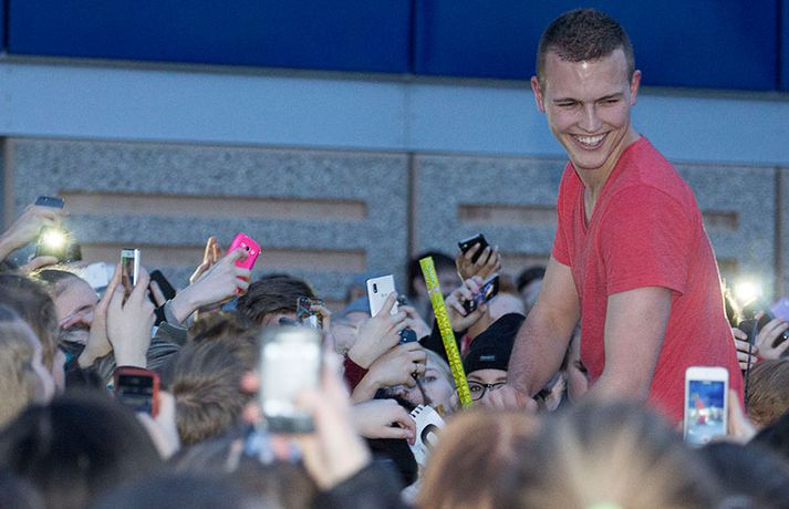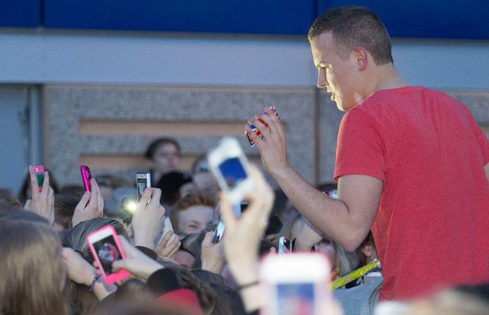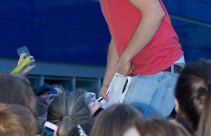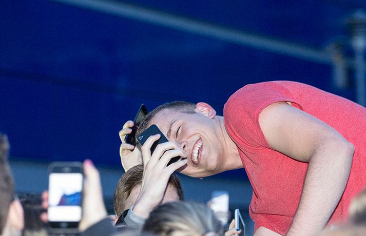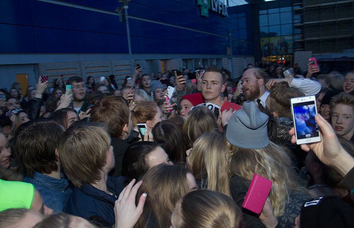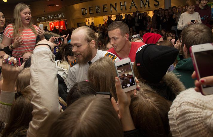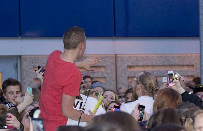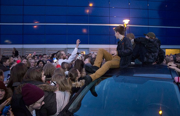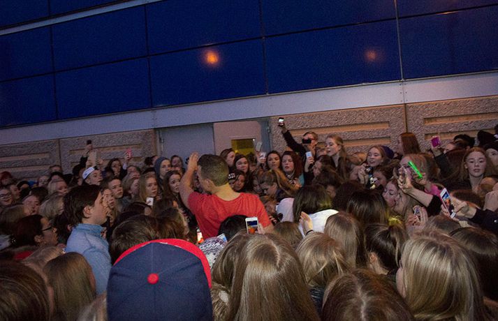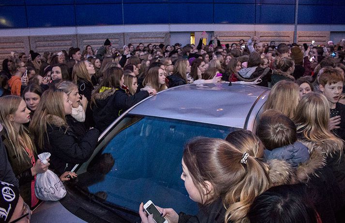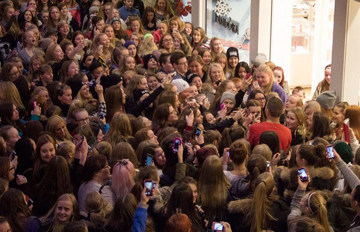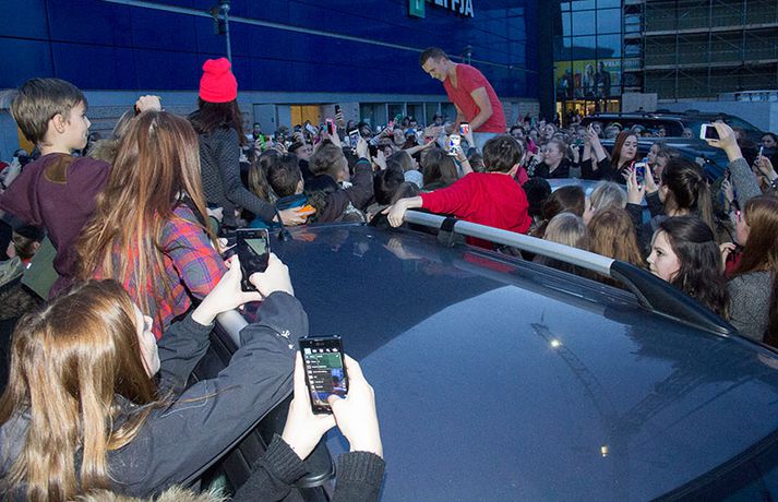 Miklar skemmdir urðu á bílum og vitni segja gríðarlegt öngþveiti hafa skapast þegar mikill fjöldi unglinga safnaðist saman í Smáralind um klukkan fjögur í dag til að bera Vine-stjörnurnar Jerome Jarre og Nash Grier augum. Vine er samfélagsmiðill þar sem notendur deila stuttum myndböndum en Jerome er með eina og hálfa milljón fylgjenda á miðlinum. Andri Marinó Karlsson, ljósmyndari Vísis, var í Smáralind. „Ég mætti klukkan hálf fjögur en Jerome ætlaði að mæta klukkan fjögur. Klukkan fjögur var hálf Smáralind troðfull af unglingum. Jerome kom með öðrum manni og síðan myndaðist gríðarleg múgæsing. Það var ótrúlegur hávaði og öskur. Öryggisvörður sem var á svæðinu réði ekkert við mannfjöldann," segir Andri. Hann segir hvorki vera hægt að hreyfa legg né lið í þvögunni. „Þeim var ýtt fram og til baka og það var ekki hægt að hreyfa sig. Ég sá síðan börn detta inn í jólatréð og þarna heyrðist í grátandi börnum sem kom síðan í ljós að höfðu slasast eitthvað. Síðan barst þvagan út í gegnum starfsmannaútgang sem öryggisvörðurinn opnaði. Öryggisstarfsólk í Smáralind reyndi að hafa stjórn á þvögunni en það var ekki möguleiki að gera það," segir Andri.„Þetta var algjör martröð" „Þegar komið var út á bílastæðið norðanmegin stökk fólk upp á bíla sem skemmdust. Jerome stóð með Nash uppi á einum bílnum og það voru ótrúleg öskur og læti. Krakkarnir tóku síðan allir upp símana sína og voru að taka þetta upp. Síðan komst Jerome inn um lítinn inngang á Smáralind og lögreglan kom fljótlega eftir þetta." „Það var ekki hægt að komast neitt, þetta var algjör martröð og ég er eiginlega ennþá í sjokki," segir Andri Marinó Karlsson. Jerome Jarre er búinn að vera á landinu seinustu daga og hefur birt nokkur myndbönd frá dvöl sinni á landinu á Vine-aðgangi sínum. Hann hafði boðað komu sína í Smáralindina á Vine aðgangi sínum, með fyrrgreindum afleiðingum. Fjöldi mynda og myndbanda eru á samfélagsvefunum af atburðinum, en hér má líta eitt þeirra.Nánar verður fjallað um málið í kvöldfréttum Stöðvar 2Jerome Jarre er búinn að vera á landinu seinustu daga.Af Vine síðu Jerome