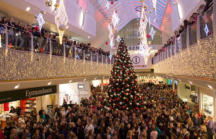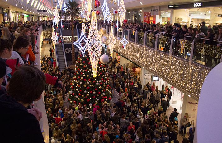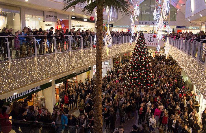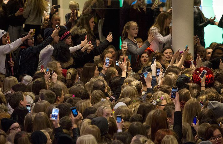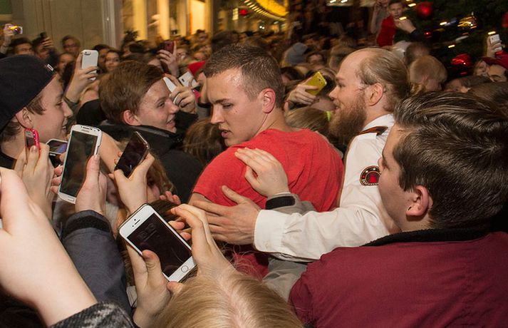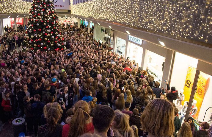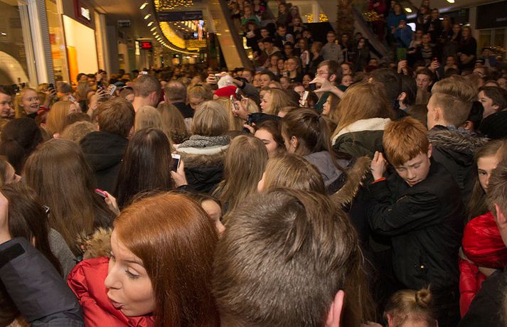 Börn slösuðust í öngþveiti í Smáralind Jóhannes Stefánsson skrifar 5. janúar 2014 17:12 Skemmdir urðu á eignum og fólk slasaðist í mannmergðinni í Smáralind. Andri Marinó Karlsson Miklar skemmdir urðu á bílum og vitni segja gríðarlegt öngþveiti hafa skapast þegar mikill fjöldi unglinga safnaðist saman í Smáralind um klukkan fjögur í dag til að bera Vine-stjörnurnar Jerome Jarre og Nash Grier augum. Vine er samfélagsmiðill þar sem notendur deila stuttum myndböndum en Jerome er með eina og hálfa milljón fylgjenda á miðlinum. Andri Marinó Karlsson, ljósmyndari Vísis, var í Smáralind. „Ég mætti klukkan hálf fjögur en Jerome ætlaði að mæta klukkan fjögur. Klukkan fjögur var hálf Smáralind troðfull af unglingum. Jerome kom með öðrum manni og síðan myndaðist gríðarleg múgæsing. Það var ótrúlegur hávaði og öskur. Öryggisvörður sem var á svæðinu réði ekkert við mannfjöldann," segir Andri. Hann segir hvorki vera hægt að hreyfa legg né lið í þvögunni. „Þeim var ýtt fram og til baka og það var ekki hægt að hreyfa sig. Ég sá síðan börn detta inn í jólatréð og þarna heyrðist í grátandi börnum sem kom síðan í ljós að höfðu slasast eitthvað. Síðan barst þvagan út í gegnum starfsmannaútgang sem öryggisvörðurinn opnaði. Öryggisstarfsólk í Smáralind reyndi að hafa stjórn á þvögunni en það var ekki möguleiki að gera það," segir Andri.„Þetta var algjör martröð" „Þegar komið var út á bílastæðið norðanmegin stökk fólk upp á bíla sem skemmdust. Jerome stóð með Nash uppi á einum bílnum og það voru ótrúleg öskur og læti. Krakkarnir tóku síðan allir upp símana sína og voru að taka þetta upp. Síðan komst Jerome inn um lítinn inngang á Smáralind og lögreglan kom fljótlega eftir þetta." „Það var ekki hægt að komast neitt, þetta var algjör martröð og ég er eiginlega ennþá í sjokki," segir Andri Marinó Karlsson. Jerome Jarre er búinn að vera á landinu seinustu daga og hefur birt nokkur myndbönd frá dvöl sinni á landinu á Vine-aðgangi sínum. Hann hafði boðað komu sína í Smáralindina á Vine aðgangi sínum, með fyrrgreindum afleiðingum. Fjöldi mynda og myndbanda eru á samfélagsvefunum af atburðinum, en hér má líta eitt þeirra.Nánar verður fjallað um málið í kvöldfréttum Stöðvar 2Jerome Jarre er búinn að vera á landinu seinustu daga.Af Vine síðu Jerome Tengdar fréttir Hver er Jerome Jarre? Jerome Jarre gerði allt vitlaust í Smáralindinni í dag, en hver er maðurinn? 5. janúar 2014 18:55 Jerome miður sín vegna uppákomunnar Vine-stjarnan Jerome Jarre biður aðdáendur sína afsökunar á Twitter aðgangi sínum vegna múgæsingsins í Smáralind. 5. janúar 2014 18:02 Mest lesið Ástæða fyrir því að genaumræðan hafi ekki náð mikilli útbreiðslu Innlent Veðurvaktin: Biðja fólk að halda sig heima í kvöld Veður Hlýni á föstudag og snjórinn geti horfið í næstu viku Veður Karlmaður lést í Bláa lóninu Innlent Færeyingar marka leið fyrir risastór neðansjávargöng Erlent Ráðgjafinn ráðinn tveimur dögum eftir að grennslast var fyrir um málið Innlent Stærsti fellibylur í sögu Jamaíka Erlent Ungur Miðflokksmaður gengst við rasisma og segir af sér Innlent Flugmaðurinn sem fórst millilenti oft í Reykjavík Innlent Biðu í fjóra tíma úti á braut og aðra fjóra við farangursbeltin Innlent Fleiri fréttir Ástæða fyrir því að genaumræðan hafi ekki náð mikilli útbreiðslu Ráðgjafinn ráðinn tveimur dögum eftir að grennslast var fyrir um málið „Alvöru“ jólasveinn gisti á Hótel Rangá Vesturbæjarlaug opnuð enn eina ferðina eftir viðgerðir Verklagi ábótavant og krefur ríkislögreglustjóra skýringa Mæla með því að farþegar reiði sig ekki á tímaáætlanir Snjókoman mikla, ábótavant verklag ríkislögreglustjóra og jólasveinamót Karlmaður lést í Bláa lóninu Biðu í fjóra tíma úti á braut og aðra fjóra við farangursbeltin Kærðu umdeildar framkvæmdir allt of seint Skellt í lás í sundlaugum borgarinnar vegna veðurs Reglur brotnar og þjónusta sem bjóða ætti út Þarf að borga bætur þrátt fyrir breytingar á hlaupahjólinu Hvatt til varúðar vegna snjóflóðahættu á suðvesturhorninu Meiri kvika en í síðasta gosi Eldur í blokk við Ljósheima Flugmaðurinn sem fórst millilenti oft í Reykjavík Halla leiðir krabbameinsráð ráðherra Snjókomumet og umferðaröngþveiti Segir sameiginlegum gildum Norðurlanda ógnað Fjölmargir farþegar fastir í flugvélum á Keflavíkurflugvelli Ungur Miðflokksmaður gengst við rasisma og segir af sér Sturlað ástand og United vettlingar prjónaðir í bílnum Mesta snjódýpt í Reykjavík sem mælst hefur í október Viðbragðsaðilar í mikilli hættu vegna bíla á sumardekkjum Bílar út af veginum á Reykjanesbraut Vill heimila Samkeppniseftirlitinu að ráðast í húsleitir Snjókoman rétt að byrja Píratar berjist gegn „rísandi bylgju lýðskrums og fasisma“ Skvísur geti virkað sem hálfgerðir þroskaþjófar Sjá meira