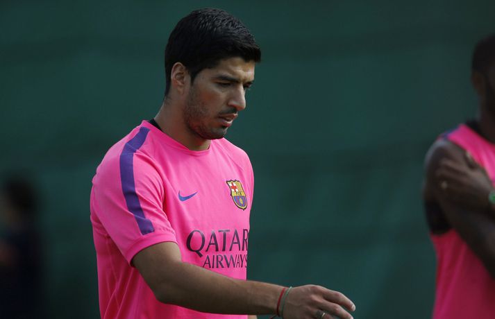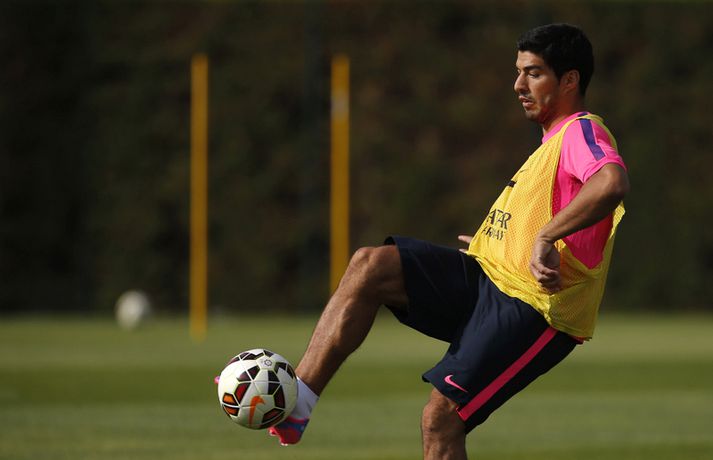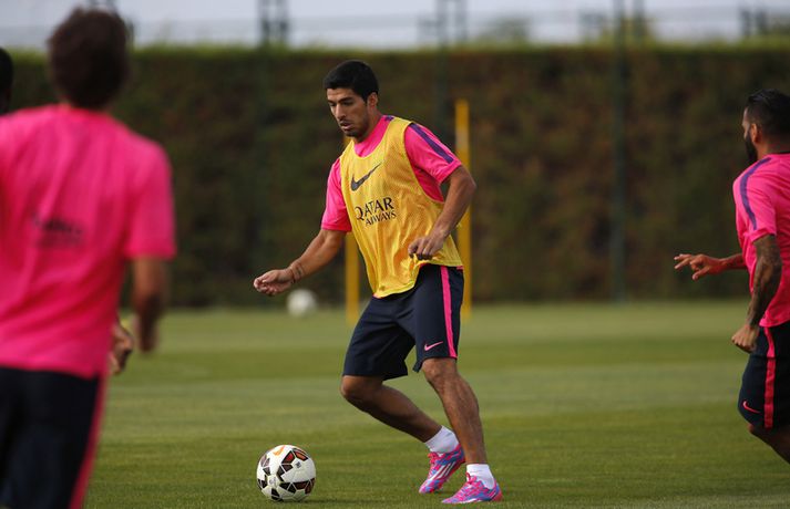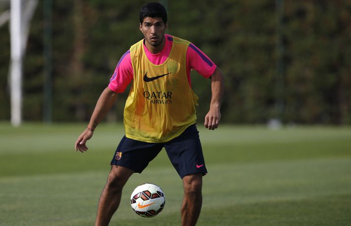 Luis Suárez fékk í gær leyfi til að æfa með sínu nýja félagi Barcelona en FIFA hafði áður bannað honum að koma nálægt öllum fótbolta í fjóra mánuði vegna bitsins fræga á HM í Brasilíu. Barcelona keypti Luis Suárez frá Liverpool 11.júlí síðastliðinn og borgaði fyrir hann í kringum 75 milljónir punda eða rúmlega 14,5 milljarða íslenskra króna. Alþjóða íþróttadómstóllinn hafnaði reyndar áfrýjun Úrúgvæmannsins en Suárez var dæmdur í fjögurra mánaða og níu landsleikja bann af FIFA fyrr í sumar fyrir að bíta Giorgio Chiellini í leik Úrúgvæ og Ítalíu. Lengd leikbannsins hélst óbreytt en Suárez fékk hinsvegar leyfi til að æfa með Barcelona-liðinu en í fyrri úrskurði FIFA var kveðið á að um honum væri óheimilt að taka þátt í öllum knattspyrnutengdum viðburðum. Suárez var fljótur að nýta sér það og mætti á sína fyrstu æfingu með Barcelona-liðinu í morgun. Hann má hinsvegar ekki spila með liðnu fyrr en 26. október næstkomandi en fyrsti leikur hans gæti orðið El Clasico á móti Real Madrid. Hér fyrir neðan má sjá tilkynningu á twitter-síðu Börsunga þar sem Suárez er mættur brosandi á sína fyrstu æfingu.Vísir/AP. @luis16suarez ready for his first Barça training session #fcblive pic.twitter.com/rIYtskmCQu— FC Barcelona (@FCBarcelona) August 15, 2014