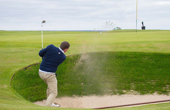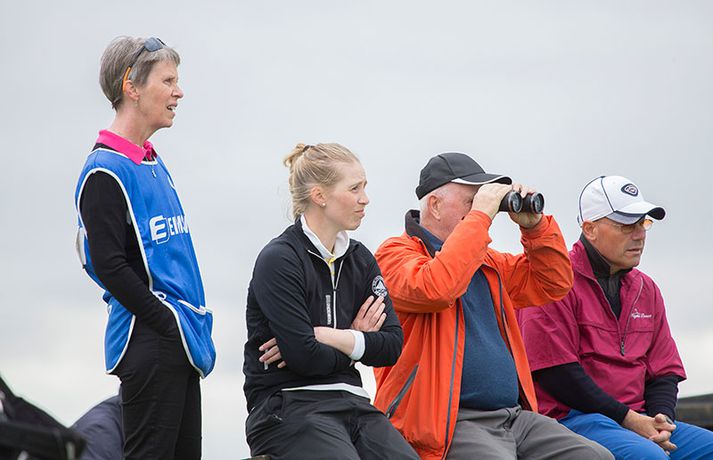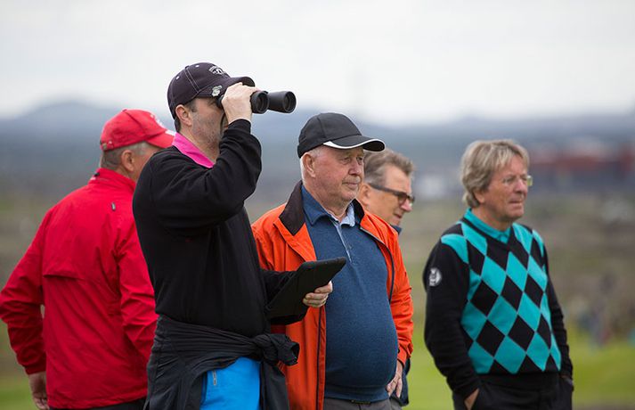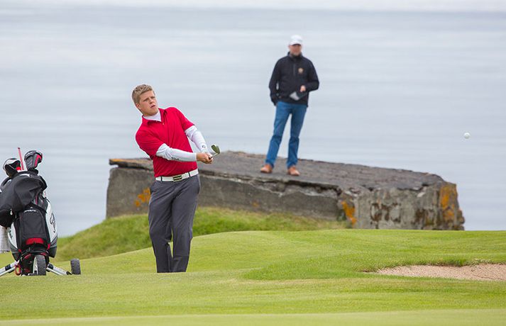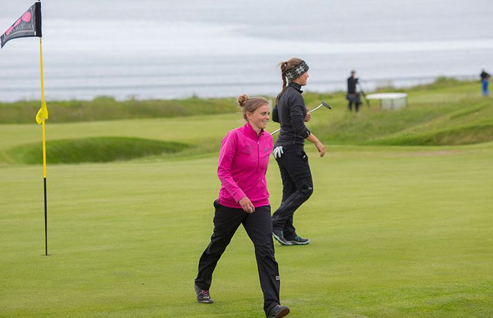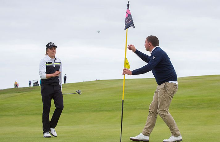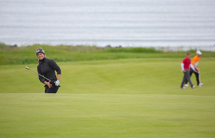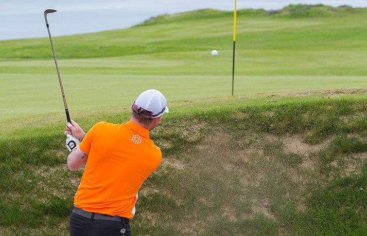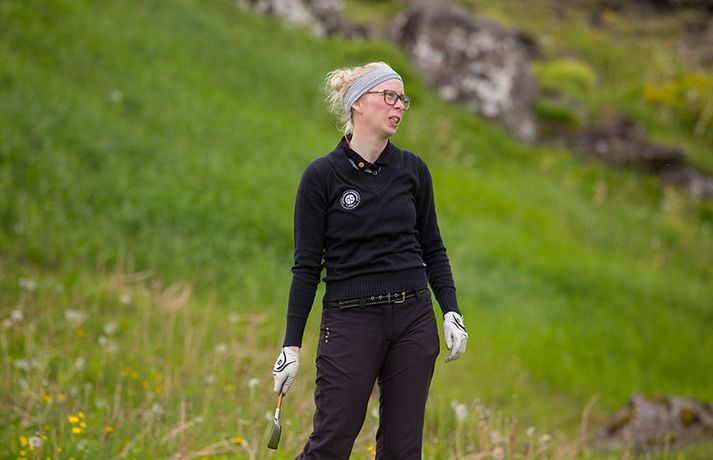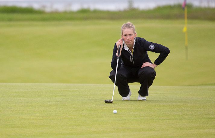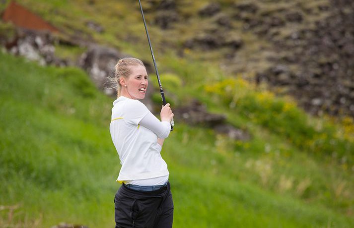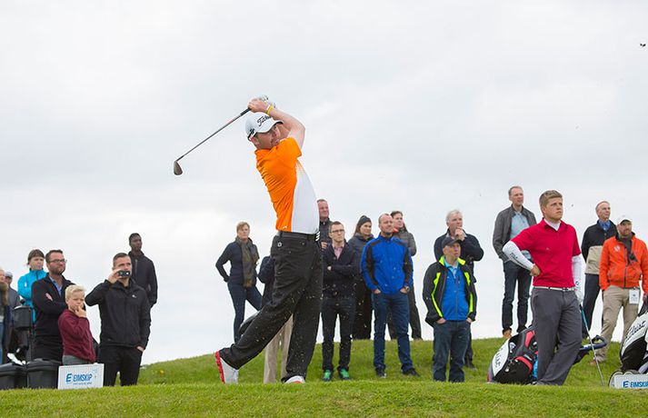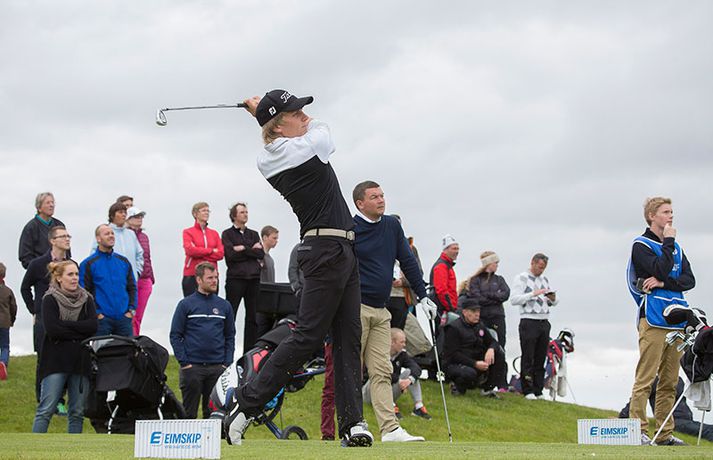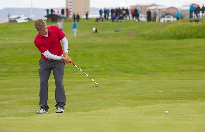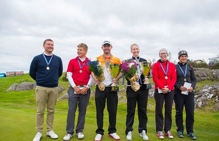 Kristján Þór Einarsson og Tinna Jóhannsdóttir stóðu uppi sem sigurvegarar á Íslandsmótinu í holukeppni sem fór fram við kjöraðstæður á Hvaleyrarvelli í Hafnarfirði. Kristján Þór, sem keppir fyrir Kjöl í Mosfellsbæ, hafði betur gegn Bjarka Péturssyni frá Golfklúbbi Borgarness í úrslitum en Tinna, sem keppti á heimavelli, vann Karen Guðnadóttur úr Golfklúbbi Suðurnesja.Daníel Rúnarsson, ljósmyndari 365, tók meðfylgjandi myndir á Hvaleyrarvelli um helgina. „Ég náði að bæta mig með hverjum hring eftir því sem leið á mótið,“ sagði Kristján Þór í samtali við Fréttablaðið en óhætt er að fullyrða að hann hafi farið erfiða leið að titlinum. Í fjórðungsúrslitum lagði hann Birgi Leif Hafþórsson, margfaldan Íslandsmeistara í höggleik, að velli og Harald Franklín Magnús, sem nýlega komst í átta manna úrslit á Opna breska áhugamannamótinu, í undanúrslitum. „Birgir Leifur er líklega besti kylfingur sem Ísland hefur átt og árangurinn sem Haraldur Franklín náði úti var frábær. Bjarki hefur svo spilað frábært golf alla helgina og ég held að hafi farið erfiðustu leiðina sem möguleg var, með fullri virðingu fyrir öðrum,“ sagði Kristján Þór. Kristján Þór lýsti á dögunum óánægju sinni með þá ákvörðun landsliðsþjálfarans Úlfars Jónssonar að velja hann ekki í landslið Íslands fyrir Evrópukeppni landsliða sem fer fram í Finnlandi í byrjun næsta mánaðar. „Hann segir mér óbeint að ég eigi ekkert heima í landsliðinu því ég á barn og er með annað á leiðinni. Hann telur að metnaðurinn sé ekki í golfinu,“ sagði Kristján Þór í umræddu viðtali við Vísi þann 20. júní síðastliðinn. „Ég kom virkilega „mótiveraður“ inn í þetta mót og vildi senda ákveðin skilaboð. Það gekk eftir með þessum sigri,“ segir Kristján Þór sem reiknar ekki með því að fá símtal frá landsliðsþjálfaranum eftir árangur helgarinnar. „Ég þarf bara að bíða og sjá. En ég hef litla trú á því,“ sagði Kristján en hann vildi ekki tjá sig um viðbrögð Úlfars sem sagði málið á sínum tíma vera „leiðinlegan misskilning“ og að hann hefði ekkert á móti Kristjáni. Næsta mót Kristjáns verður meistaramót Kjalar eftir tvær vikur en að því loknu hefur hann undirbúning fyrir Íslandsmótið í höggleik sem fer fram dagana 24.-27. júlí. „Það er enginn vafi á því að ég stefni að sigri á landsmótinu en ég verð svo bara að bíða og sjá til hvernig ágústmánuður verður hjá mér. Við eigum von á barni þá og framhaldið ræðst af því,“ sagði Kristján Þór að lokum.