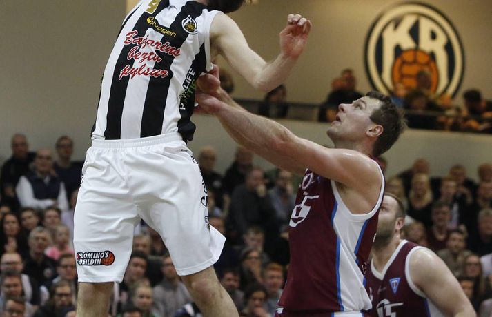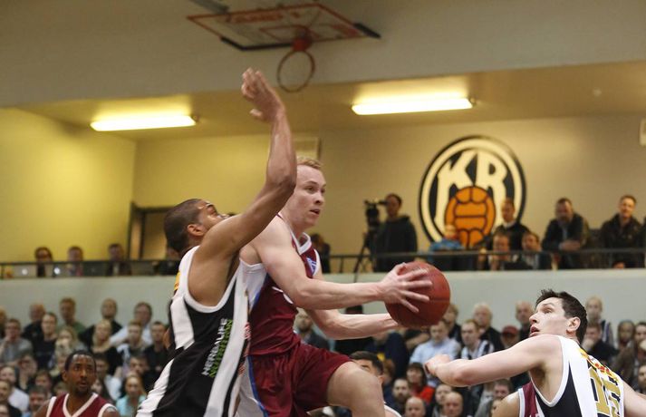 Umfjöllun, viðtöl og myndir: KR - Tindastóll 94-74 | Meistararnir komust í 1-0 með 20 stiga sigri Tómas Þór Þórðarson í DHL-höllinni skrifar 20. apríl 2015 20:45 Michael Craion fer upp á móti Darrel Flake í leiknum í kvöld. vísir/valli Íslandsmeistarar KR eru komnir í 1-0 í einvígi sínu gegn Tindastóli í lokaúrslitum Dominos-deildar karla í körfubolta. KR vann 20 stiga sigur á heimavelli sínum í kvöld, 94-74. Fyrir leik urðu Stólarnir fyrir áfalli þegar í ljós kom að Myron Dempsey, miðherji liðsins, treysti sér ekki til að spila. Hann fékk högg á augað á æfingu og sér ekki nógu vel. Með þessu varð ljóst að einhver annar þurfti að dekka Michael Craion og þar varð fyrir valinu Darrel Flake. Flake hefur verið í aukahlutverki hjá Stólunum í vetur og var ekki tilbúinn í þessa baráttu. Craion skoraði fimm stig og tók sjö fráköst bara í fyrsta leikhluta á meðan Flake, sem spilaði ríflega sex mínútur í fyrsta fjórðungi, skoraði hvorki stig né tók frákast. Craion réð ríkjum undir körfunni í kvöld og skoraði í heildina 21 stig og tók 16 fráköst, þar af fimm sóknarfráköst sem flest öll skiluðu stigum fyrir KR. Bara í fyrri hálfleik var KR-liðið búið að taka 14 sóknarfráköst og Craion kominn í tvennu með 12 stigum og 11 fráköstum. Þegar uppi var staðið tók KR 61 frákast á móti 29 fráköstum gestanna. Sóknarfráköst KR (23) voru fleiri en varnarfráköst Tindastóls (21). Til að bæta gráu ofan á svart meiddist Flake undir lok fyrri hálfleiks og spilaði ekkert í þeim síðari. Stólarnir mega ekki við meiðslum hans og Dempseys ef þeir ætla að ráða við hávaxið lið KR. Tindastóll hélt í við KR til að byrja með en leiðir skildu í öðrum leikhluta sem meistararnir unnu, 29-12. Staðan í hálfleik var 51-31 fyrir heimamenn, 20 stiga munur. Brynjar Þór Björnsson fór hamförum í fyrri hálfleik og skoraði 19 stig. Hann hitti úr fjórum þriggja stiga skotum af fimm í fyrri hálfleik auk þess sem hann tók átta fráköst. Hann kólnaði í síðari hálfleik.Svavar Atli Birgisson og Brynjar Þór Björnsson brosmildir í kvöld.vísir/valliVarnarleikur KR var alveg frábær. Stólarnir áttu mjög erfitt með að finna sér skotfæri. Helgi Freyr Margeirsson reyndi einn dans-þrist sem var til vitnisburðar um hveru sterk vörn heimamanna var. Eini sem eitthvað náði að skora var Helgi Rafn Viggósson sem endaði í 18 stigum, en Darrel Lewis skoraði ekki nema sex stig í kvöld. Hann var í strangri gæslu Darra Freys Hilmarssonar sem sannaði gæði sín í vörninni enn og aftur. Mestur varð munurinn 31 stig um miðjan þriðja leikhluta, 85-54. Stólarnir létu þó ekki alveg valta yfir sig og sýndu karkater með að minnka muninn. Tindastólsliðið verður aldrei sakað um að spila ekki með hjartanu en það var langt frá því að vera nóg í kvöld. KR-ingar virkuðu mjög hungraðir í kvöld og virðist sem svo að tvíframlengdi oddaleikurinn gegn Njarðvík á föstudagskvöldið hafi kveikt í liðinu. Það keyrði upp völlinn allan leikinn, sama hversu forystan var mikil, og leikmenn heimamanna börðu sér á brjóst og mótmæltu dómum allt þar til yfir lauk. Minni spámenn fóru að tínast inn á völlinn eftir því sem á leið fjórða leikhluta enda var þetta aldrei leikur í seinni hálfleik. Pavel, Craion og Helgi fengu fína hvíld sem og Darrel Lewis hjá Tindastóli sem Israel Martin tók frekar snemma af velli. Brynjar Þór var stigahæstur KR-inga með 22 stig og tók 12 fráköst, en Craion skoraði 21 stig og tók 16 frákast. Eins og alltaf var gott framlag frá Helga Má (14 stig, 4 fráköst) og Darra (13 stig, 6 fráköst). Næsti leikur fer fram í Síkinu á Sauðárkróki á fimmtudaginn, en þar þurfa Stólarnir að svara fyrir sig.KR-Tindastóll 94-74 (22-19, 29-12, 21-21, 22-22)KR: Brynjar Þór Björnsson 22/12 fráköst, Michael Craion 21/16 fráköst/7 varin skot, Helgi Már Magnússon 14/4 fráköst, Darri Hilmarsson 13/6 fráköst, Björn Kristjánsson 6/5 fráköst, Finnur Atli Magnússon 5/5 fráköst, Þórir Guðmundur Þorbjarnarsson 4, Pavel Ermolinskij 3/6 fráköst/7 stoðsendingar, Þorgeir Kristinn Blöndal 2, Ingvaldur Magni Hafsteinsson 2, Darri Freyr Atlason 2, Vilhjálmur Kári Jensson 0.Tindastóll: Helgi Rafn Viggósson 18/10 fráköst, Pétur Rúnar Birgisson 11/9 stoðsendingar, Svavar Atli Birgisson 8, Ingvi Rafn Ingvarsson 8, Sigurður Páll Stefánsson 6, Helgi Freyr Margeirsson 6, Darrel Keith Lewis 6/7 fráköst, Viðar Ágústsson 5, Darrell Flake 4, Finnbogi Bjarnason 2, Hannes Ingi Másson 0.Michael Craion hefur góðar gætur á Darrel Flake.vísir/valliCraion: Viljum klára þetta í þremur leikjum Michael Craion var fljótur af velli í kvöld og sat einmanna ofan á boltageymslu þegar blaðamaður Vísis hitti á hann eftir leikinn. "Ég er ánægður með að við komum sterkir í þennan leik og kláruðum þetta með sigri," sagði Craion yfirvegaður að vanda. Craion þurfti ekki að glíma við Myron Dempsey undir körfunni í kvöld og virtist ekki hafa mikið fyrir hlutunum. "Þetta var ekki auðvelt. Þeir börðust og létu mig finna fyrir því en ég var undirbúinn fyrir allt," sagði Craion. "Við reyndum að koma með ákefðina frá síðustu leikjum og það tókst," bætti hann við. Craion sagði Stólanna ekki hafa boðið upp á neitt nýtt í kvöld. Þeir voru bara Tindastóll. "Þeir komu ekkert á óvart. Þeir létu bara finna fyrir sér eins og við bjuggumst við," sagði Craion sem hefur verið að glíma við meiðsli í úrslitakeppninni. "Ég er ekkert meiddur. Mér líður vel og er klár í slaginn í næstu tvo leiki. Okkur langar að klára þetta í þremur leikjum," sagði Michael Craion.Helgi Már Magnússon ræðir við Jón Guðmundsson dómara.vísir/valliFinnur Freyr: Vorum búnir að gleyma leiknum sama 
