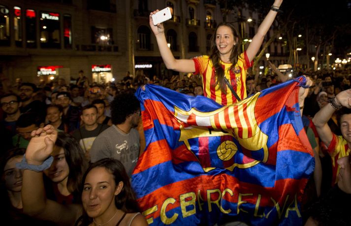 Barcelona tryggði sér spænska meistaratitilinn í 23. sinn í gær þegar liðið vann 1-0 útisigur á fráfarandi meisturum í Atlético Madrid. Barcelona vann titilinn síðast 2013 en lenti í 2. sæti bæði 2012 og 2014. Börsungar unnu hann aftur á móti þrjú ár í röð frá 2009 til 2011. Lionel Messi skoraði eina mark leiksins á Vicente Calderón leikvanginum í gær og tryggði Barcelona þar með sjöunda meistaratitilinn síðan að Messi fór að spila með aðalliði félagsins. Börsungar eru ekki hætti því þeir geta enn unnið þrennuna. Framundan er bikarúrslitaleikur á móti Athletic Bilbao og úrslitaleikur Meistaradeildarinnar á móti ítalska liðinu Juventus. Stuðningsfólk Barcelona fjölmennti á Römbluna í gærkvöldi og fagnaði fyrsta titlinum á tímabilinu og það má sjá myndir af fögnuði þeirra hér fyrir neðan.Vísir/GettyVísir/GettyVísir/GettyVísir/GettyVísir/GettyVísir/GettyVísir/GettyVísir/Getty