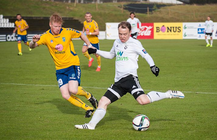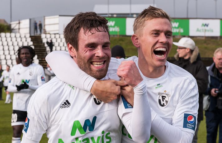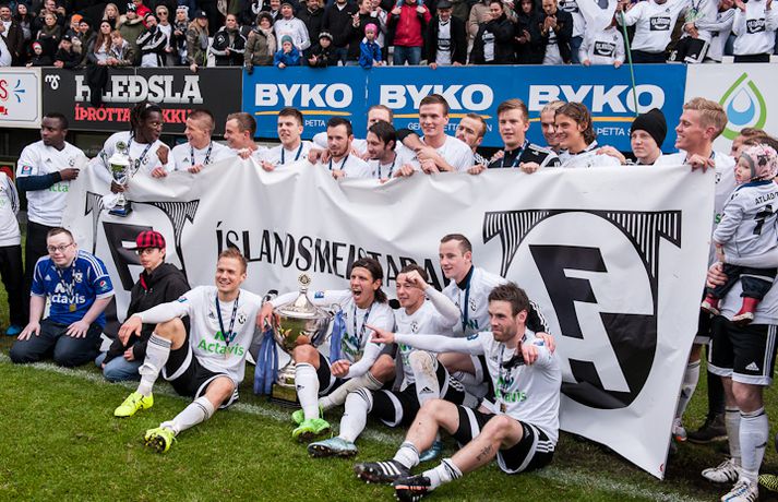 FH er Íslandsmeistari árið 2015 eftir 2-1 sigur á Fjölni á heimavelli í dag. Þetta er sjöundi Íslandsmeistaratitilinn í sögu FH en þeir hafa allir unnist á síðustu 12 árum. Sigurganga FH-inga á undangengnum árum er einstök en liðið hefur ekki lent neðar en í 2. sæti síðan 2003. FH-ingar, sem flestir ef ekki allir spáðu Íslandsmeistaratitlinum fyrir mót, lentu í krísu um mitt sumar þegar þeir duttu út úr bikarkeppninni, Evrópudeildinni og töpuðu svo 1-3 fyrir KR á heimavelli í 12. umferð. Með sigrinum náðu KR-ingar tveggja stiga forskoti á FH. En þá fóru FH-ingar í gang og spiluðu betur með hverjum leiknum. Þeir unnu sjö leiki í röð og komust í dauðafæri til að vinna titilinn. Hafnfirðingar klúðruðu því gegn helstu keppinautunum í Breiðabliki í síðustu umferð en þeir létu tækifærið í dag sér ekki úr greipum ganga. Þeir þurftu þó að hafa fyrir því að innbyrða sigur gegn sterku Fjölnisliði. Staðan í hálfleik var markalaus en á 51. mínútu kom Atli Guðnason FH yfir með sínu áttunda deildarmarki í sumar. Fjölnismenn voru ekki hættir og á 69. mínútu jafnaði Kennie Chopart, einn besti leikmaður seinni umferðar Íslandsmótsins, metin með sínu sjötta marki í síðustu níu leikjum. Markið kveikti aftur á heimamönnum og þeir fóru að herja á vörn Fjölnis á nýjan leik. Pétur Viðarsson, sem færði Fjölnismönnum markið á silfurfati, átti skot á 78. mínútu sem var bjargað á línu og mínútu síðar skoraði Emil Pálsson markið dýrmæta sem tryggði FH sigurinn þegar hann stýrði skoti Jonathans Hendrickx í netið af stuttu færi. Emil var þarna að skora gegn sínum gömlu félögum en hann lék sem lánsmaður með Fjölni fyrri hluta tímabilsins. Emil spilaði vel fyrir Grafarvogsliðið en enn betur fyrir FH og kórónaði sitt besta tímabil á ferlinum með því að skora sigurmarkið í dag.Atli Guðnason skoraði fyrra mark FH.vísir/þórdísFH var meira með boltann í fyrri hálfleik eins og við mátti búast. Heimamenn byrjuðu leikinn af miklum krafti og strax á 6. mínútu þurfti Ólafur Páll Snorrason að bjarga á línu gegn sínum gömlu félögum eftir skot Atla Guðnasonar í kjölfar hornspyrnu Jérémys Serwy. FH-ingar áttu fleiri hættulegar sóknir en varnarleikur gestanna úr Grafarvoginum var sterkur. Bergsveinn Ólafsson og Jonathan Neftalí höfðu vökult auga með Steven Lennon fyrir framan þá voru Guðmundur Böðvar Guðjónsson og Hans Viktor Guðmundsson duglegir. Fjölnismenn stóðust þessa miklu pressu FH-inga í upphafi og komust alltaf betur og betur inn í leikinn og náðu upp meira spili. Þeir sköpuðu sér þó engin teljandi færi. Aron Sigurðarson átti ágætis skot eftir góða sókn sem Róbert Örn Óskarsson varði en annað var það ekki. FH-ingar minntu aftur á sig á 33. mínútu þegar Bergsveinn bjargaði skoti Lennons á línu eftir aukaspyrnu Davíðs Þórs Viðarssonar sem fór í varnarmann. Tíu mínútum síðar komst Emil í gott skotfæri en Neftalí henti sér fyrir skot hans. Staðan var markalaus í hálfleik en FH á mann í sínum röðum sem heitir Atli Guðnason og hann kom Hafnfirðingum yfir á 51. mínútu með lúmsku skoti undir Steinar Örn Gunnarsson í marki Fjölnis. FH-ingar voru sterkari aðilinn næstu mínúturnar og stjórnuðu miðjunni með Davíð Þór Viðarsson sem besta mann. Hann braut niður sóknir Fjölnis og byrjaði sóknir FH. Það er það sem Davíð gerir best og það sem hefur gert hann að þeim frábæra leikmanni sem hann er. Fjölnismenn jöfnuðu metin nánast upp úr þurru á 69. mínútu. Guðmundur Böðvar átti þá sendingu inn á teiginn, Pétur skallaði frá en beint á Chopart sem stýrði boltanum af öryggi í netið. Vel gert hjá Danunum sem hefur reynst Fjölni þvílíkur happafengur síðan hann kom til liðsins um mitt mót. Í stað þess að liggja eftir sem rotaðir risu FH-ingar á fætur og hófu aftur að sækja á gestina. Og eins og svo oft áður í sumar endaði pressa FH með marki. Fjölnismenn höfðu 11 mínútur til að jafna en höfðu ekki erindi sem erfiði. Þórir Guðjónsson fékk besta færi þeirra en skaut beint á Róbert sem átti fremur náðugan dag í markinu. Fleiri urðu mörkin ekki og fögnuður FH-inga í leikslok var ósvikinn.Heimir: Það býr mikill karakter í FH-liðinu Heimir Guðjónsson stýrði FH-ingum til sjöunda Íslandsmeistaratitilsins í sögu félagsins í dag þegar Hafnfirðingar lögðu Fjölni að velli, 2-1, á heimavelli sínum. Heimir hefur tekið þátt í að vinna alla þessa sjö meistaratitla, fyrst sem fyrirliði, svo sem aðstoðarþjálfari og loks sem þjálfari. Hann segir þennan titil sætan þótt hann toppi ekki þann fyrsta sem FH vann árið 2004. "2004-titilinn verður alltaf sá sætasti í mínum huga. Þá var ég fyrirliði og þetta var fyrsti titilinn í sögu FH. Það var stórkostlegt. En þessi kemst nálægt því, þetta er alltaf jafn skemmtilegt," sagði Heimir. Fjölnismenn spiluðu vel í dag og létu FH-inga hafa mikið fyrir hlutunum. "Fjölnir er með frábært lið en mér fannst við vera með undirtökin og fannst þeir ekki skapa mikið," sagði Heimir en Fjölnismenn jöfnuðu metin á 69. mínútu þegar Kennie Chopart skoraði sitt sjötta mark í sumar. En FH-ingar sýndu styrk og komust aftur yfir þegar Emil Pálsson stýrði skoti Jonathan Hendrickx í markið. "Við lærðum af Blikaleiknum og eftir að þeir jöfnuðu komum við sterkir til baka, tókum yfir leikinn og kláruðum dæmið. "Það er frábær karakter í FH-liðinu, við erum búnir að sýna það í allt sumar. Við höfum oft lent undir og við höfum klárað leikina á lokamínútunum," sagði Heimir sem er sáttur með sumarið í heild þótt hann hefði viljað fara einni umferð lengra í forkeppni Evrópudeildarinnar. "Þetta hefur veri