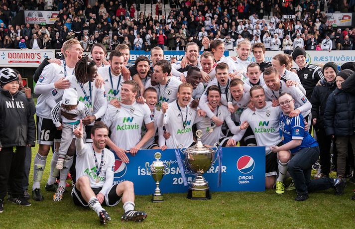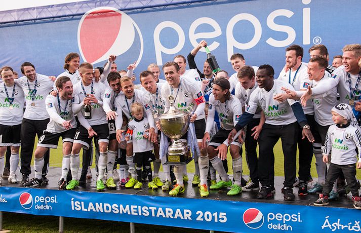 Umfjöllun, viðtöl, einkunnir og myndir: FH - Fjölnir 2-1 | Biðin eftir þeim sjöunda á enda Ingvi Þór Sæmundsson í Kaplakrika skrifar 26. september 2015 17:45 vísir/þórdís FH er Íslandsmeistari árið 2015 eftir 2-1 sigur á Fjölni á heimavelli í dag. Þetta er sjöundi Íslandsmeistaratitilinn í sögu FH en þeir hafa allir unnist á síðustu 12 árum. Sigurganga FH-inga á undangengnum árum er einstök en liðið hefur ekki lent neðar en í 2. sæti síðan 2003. FH-ingar, sem flestir ef ekki allir spáðu Íslandsmeistaratitlinum fyrir mót, lentu í krísu um mitt sumar þegar þeir duttu út úr bikarkeppninni, Evrópudeildinni og töpuðu svo 1-3 fyrir KR á heimavelli í 12. umferð. Með sigrinum náðu KR-ingar tveggja stiga forskoti á FH. En þá fóru FH-ingar í gang og spiluðu betur með hverjum leiknum. Þeir unnu sjö leiki í röð og komust í dauðafæri til að vinna titilinn. Hafnfirðingar klúðruðu því gegn helstu keppinautunum í Breiðabliki í síðustu umferð en þeir létu tækifærið í dag sér ekki úr greipum ganga. Þeir þurftu þó að hafa fyrir því að innbyrða sigur gegn sterku Fjölnisliði. Staðan í hálfleik var markalaus en á 51. mínútu kom Atli Guðnason FH yfir með sínu áttunda deildarmarki í sumar. Fjölnismenn voru ekki hættir og á 69. mínútu jafnaði Kennie Chopart, einn besti leikmaður seinni umferðar Íslandsmótsins, metin með sínu sjötta marki í síðustu níu leikjum. Markið kveikti aftur á heimamönnum og þeir fóru að herja á vörn Fjölnis á nýjan leik. Pétur Viðarsson, sem færði Fjölnismönnum markið á silfurfati, átti skot á 78. mínútu sem var bjargað á línu og mínútu síðar skoraði Emil Pálsson markið dýrmæta sem tryggði FH sigurinn þegar hann stýrði skoti Jonathans Hendrickx í netið af stuttu færi. Emil var þarna að skora gegn sínum gömlu félögum en hann lék sem lánsmaður með Fjölni fyrri hluta tímabilsins. Emil spilaði vel fyrir Grafarvogsliðið en enn betur fyrir FH og kórónaði sitt besta tímabil á ferlinum með því að skora sigurmarkið í dag.Atli Guðnason skoraði fyrra mark FH.vísir/þórdísFH var meira með boltann í fyrri hálfleik eins og við mátti búast. Heimamenn byrjuðu leikinn af miklum krafti og strax á 6. mínútu þurfti Ólafur Páll Snorrason að bjarga á línu gegn sínum gömlu félögum eftir skot Atla Guðnasonar í kjölfar hornspyrnu Jérémys Serwy. FH-ingar áttu fleiri hættulegar sóknir en varnarleikur gestanna úr Grafarvoginum var sterkur. Bergsveinn Ólafsson og Jonathan Neftalí höfðu vökult auga með Steven Lennon fyrir framan þá voru Guðmundur Böðvar Guðjónsson og Hans Viktor Guðmundsson duglegir. Fjölnismenn stóðust þessa miklu pressu FH-inga í upphafi og komust alltaf betur og betur inn í leikinn og náðu upp meira spili. Þeir sköpuðu sér þó engin teljandi færi. Aron Sigurðarson átti ágætis skot eftir góða sókn sem Róbert Örn Óskarsson varði en annað var það ekki. FH-ingar minntu aftur á sig á 33. mínútu þegar Bergsveinn bjargaði skoti Lennons á línu eftir aukaspyrnu Davíðs Þórs Viðarssonar sem fór í varnarmann. Tíu mínútum síðar komst Emil í gott skotfæri en Neftalí henti sér fyrir skot hans. Staðan var markalaus í hálfleik en FH á mann í sínum röðum sem heitir Atli Guðnason og hann kom Hafnfirðingum yfir á 51. mínútu með lúmsku skoti undir Steinar Örn Gunnarsson í marki Fjölnis. FH-ingar voru sterkari aðilinn næstu mínúturnar og stjórnuðu miðjunni með Davíð Þór Viðarsson sem besta mann. Hann braut niður sóknir Fjölnis og byrjaði sóknir FH. Það er það sem Davíð gerir best og það sem hefur gert hann að þeim frábæra leikmanni sem hann er. Fjölnismenn jöfnuðu metin nánast upp úr þurru á 69. mínútu. Guðmundur Böðvar átti þá sendingu inn á teiginn, Pétur skallaði frá en beint á Chopart sem stýrði boltanum af öryggi í netið. Vel gert hjá Danunum sem hefur reynst Fjölni þvílíkur happafengur síðan hann kom til liðsins um mitt mót. Í stað þess að liggja eftir sem rotaðir risu FH-ingar á fætur og hófu aftur að sækja á gestina. Og eins og svo oft áður í sumar endaði pressa FH með marki. Fjölnismenn höfðu 11 mínútur til að jafna en höfðu ekki erindi sem erfiði. Þórir Guðjónsson fékk besta færi þeirra en skaut beint á Róbert sem átti fremur náðugan dag í markinu. Fleiri urðu mörkin ekki og fögnuður FH-inga í leikslok var ósvikinn.Heimir: Það býr mikill karakter í FH-liðinu Heimir Guðjónsson stýrði FH-ingum til sjöunda Íslandsmeistaratitilsins í sögu félagsins í dag þegar Hafnfirðingar lögðu Fjölni að velli, 2-1, á heimavelli sínum. Heimir hefur tekið þátt í að vinna alla þessa sjö meistaratitla, fyrst sem fyrirliði, svo sem aðstoðarþjálfari og loks sem þjálfari. Hann segir þennan titil sætan þótt hann toppi ekki þann fyrsta sem FH vann árið 2004. "2004-titilinn verður alltaf sá sætasti í mínum huga. Þá var ég fyrirliði og þetta var fyrsti titilinn í sögu FH. Það var stórkostlegt. En þessi kemst nálægt því, þetta er alltaf jafn skemmtilegt," sagði Heimir. Fjölnismenn spiluðu vel í dag og létu FH-inga hafa mikið fyrir hlutunum. "Fjölnir er með frábært lið en mér fannst við vera með undirtökin og fannst þeir ekki skapa mikið," sagði Heimir en Fjölnismenn jöfnuðu metin á 69. mínútu þegar Kennie Chopart skoraði sitt sjötta mark í sumar. En FH-ingar sýndu styrk og komust aftur yfir þegar Emil Pálsson stýrði skoti Jonathan Hendrickx í markið. "Við lærðum af Blikaleiknum og eftir að þeir jöfnuðu komum við sterkir til baka, tókum yfir leikinn og kláruðum dæmið. "Það er frábær karakter í FH-liðinu, við erum búnir að sýna það í allt sumar. Við höfum oft lent undir og við höfum klárað