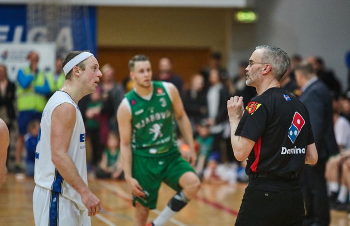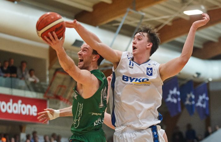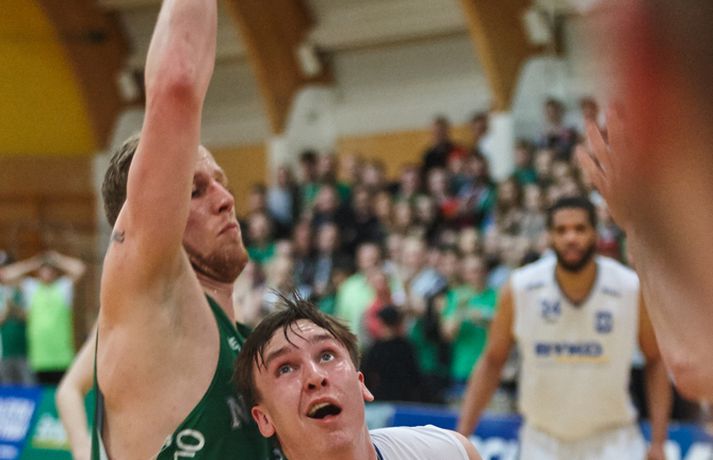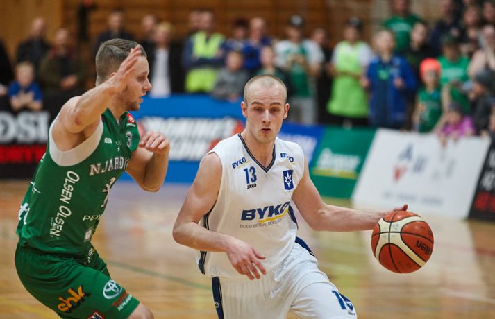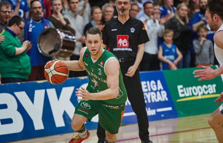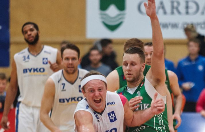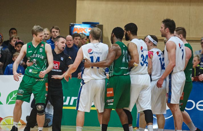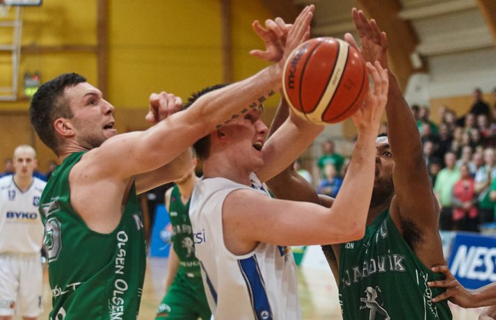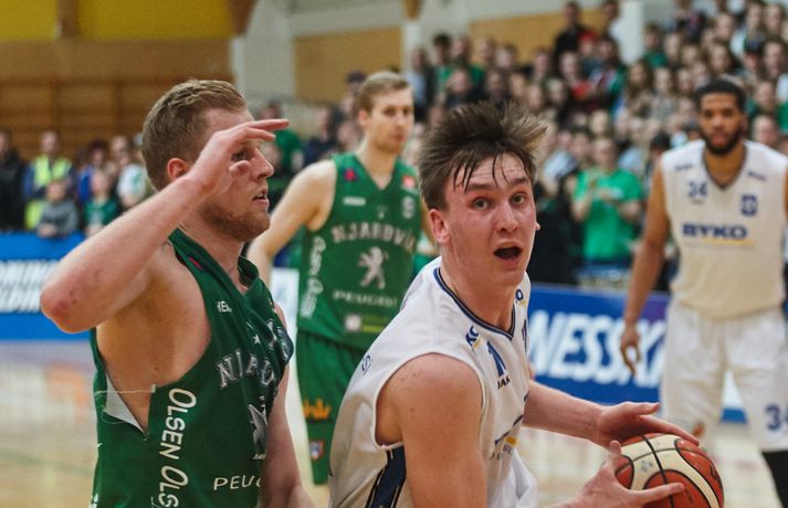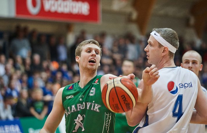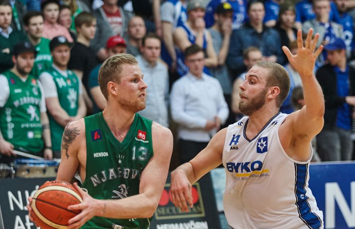 Njarðvík er komið í undanúrslit í Dominos-deild karla eftir magnaðan sigur, 79-75, á Stjörnunni í oddaleik liðanna í Ásgarði í kvöld. Spennan var mögnuð í kvöld og réðust úrslitin undir blálok leiksins. Jeremy Atkinson skoraði tuttugu stig fyrir Njarðvík í leiknum og Haukur Helgi Pálsson var með 19 stig.Anton Brink, ljósmyndari Vísis og Fréttablaðsins, var á leiknum í Ásgarði í kvöld og náði þessum skemmtilegu myndum hér fyrir ofan. Leikurinn hófst eins og allir leikir þessara liða í Ásgarði og var jafnt á öllum tölum til að byrja með. Liðin einfaldlega skiptust á að hafa eins og tveggja stig forskot. Justin Shouse stjórnaði sóknarleik Stjörnunnar vel og dreifðist stigaskor heimamanna töluvert í upphafi. Jeremy Atkinson var flottur í liði Njarðvíkinga og hafði gert sjö stig eftir tíu mínútna leik en staðan eftir 1. leikhlutann var 18-17 fyrir Njarðvíkinga. Haukur Helgi Pálsson, leikmaður Njarðvíkur, var á eldi í upphafi annars leikhluta og kom sér heldur betur í gírinn með körfu og þristi strax í upphafi fjórðungsins. Gestirnir náðu á þeim kafla ellefu stiga forskoti, 32-21, og útlitið bjart fyrir þá grænu. Justin Shouse hrökk þá í gang í liði Stjörnunnar og skoraði hvert stigið á fætur öðru þar til það munaði aðeins einu stigi á liðunum, 37-36, Njarðvíkingum í vil. Staðan í hálfleik var síðan 39-36 fyrir Njarðvík og leikurinn galopinn. Stjarnan gerðu fimm fyrstu stigin í síðari hálfleiknum og komst liðið því strax yfir 41-39. Í þriðja leikhlutanum var nánast jafnt á öllum tölum og vildi hvorugt liðið missa hvort annað of langt frá sér. Leikurinn spilaðist alveg eins og allir leikir í einvíginu, góðar varnir og langar sóknir. Staðan fyrir lokaleikhlutann var 55-54 fyrir heimamenn og allt á suðupunkti. Í fjórða leikhlutanum var allt á suðupunkti í Garðabænum og spennan í algjöru hámarki. Oddur Rúnar Kristjánsson, leikmaður Njarðvíkur, steig upp og setti þriggja stiga körfur á ótrúlega mikilvægum augnablikum og þegar fjórðungurinn var hálfnaður var staðan 68-62 fyrir Njarðvík. Gestirnir sýndu rosalega baráttu í síðasta leikhlutanum og það skilaði þeim tíu stiga forskoti, 73-63, þegar um þrjár mínútur voru eftir af leiknum. Þá settu aftur á móti heimamenn í fimmta gír og það tók þá eina mínútu að minnka muninn niður í þrjú stig, 75-72 fyrir Njarðvíkinga. Gríðarleg spenna var alveg fram á síðustu sekúndu en það voru gestirnir úr Njarðvík sem höfðu betur og fór Haukur Helgi Pálsson mikinn á lokaandartökum leiksins en hann setti niður vítaskot þegar allt var undir. Leiknum lauk frábærum sigri gestanna, 79-75.Stjarnan-Njarðvík 75-79 (17-18, 19-21, 19-15, 20-25)Stjarnan: Al'lonzo Coleman 24/12 fráköst/6 stoðsendingar, Justin Shouse 19/7 fráköst/8 stoðsendingar, Tómas Þórður Hilmarsson 9/14 fráköst, Tómas Heiðar Tómasson 9/5 fráköst, Marvin Valdimarsson 5, Ágúst Angantýsson 5, Arnþór Freyr Guðmundsson 2, Sæmundur Valdimarsson 2.Njarðvík: Jeremy Martez Atkinson 20/10 fráköst, Haukur Helgi Pálsson 19/10 fráköst/8 stoðsendingar, Oddur Rúnar Kristjánsson 13, Logi Gunnarsson 11, Maciej Stanislav Baginski 8, Hjörtur Hrafn Einarsson 5, Ólafur Helgi Jónsson 3. Haukur Helgi: Við vorum einfaldlega betri í þessu einvígiHaukur Helgi Pálsson var mikilvægur í kvöld.Vísir/Anton„Ég klikkaði á alltof mörgum vítum síðast og það var aldrei að fara gerast í kvöld,“ segir Haukur Helgi Pálsson, leikmaður Njarðvíkur, eftir leikinn. „Það héldu allir að við gætum ekki unnið þetta lið en við trúðum því allan tímann. Þeir spiluðu fast og eiga mikið hrós skilið eftir einvígið.“ Haukur segir einfaldlega að Njarðvíkingar hafi verið betri í þessu einvígi. Logi Gunnarsson kom inn í liðið fyrir síðasta leik en hann handabrotnaði í byrjun mars. „Ég væri bara grenjandi upp í sumarbústað ef þetta væri ég. Það er enginn maður eins og hann. Ég gæti ekki verið stoltari af samherja og svo ánægður að hafa spilað með honum á tímabilinu.“ Njarðvík mætir KR í undanúrslitunum. „Ég vildi alltaf mæta KR í úrslitakeppninni og það er að rætast.“ Hrafn: Myndi vilja halda áfram með þetta liðHrafn Kristjánsson, þjálfari Stjörnunnar.Vísir/Anton„Þetta er helvíti fúlt,“ segir Hrafn Kristjánsson, þjálfari Stjörnunnar, eftir leikinn. „Mér fannst við vera búnir að vinna okkur aftur inn í leikinn eftir slæman fyrri hálfleik. En við náðum ekki að fylgja þessu nægilega vel eftir.“ Stjörnumenn voru nokkuð óheppnir undir lokin og tapaði liðið boltanum á síðustu mínútunni á erfiðum tímapunkti. „Svona leikir ráðast ekki á einstaka atriðum og við hefðum bara átt að gera betur.“ Hrafn er að klára sinn tveggja ára samning við Stjörnuna. „Ég á eftir að setjast niður og ræða við stjórnina. Mér þykir vænt um þennan klúbb og vænt um þessa stráka og myndi gjarnan vilja halda áfram.“ Friðrik Ingi: Náðum að stilla spennustigið rétt„Ég er gríðarlega ánægður með leik liðsins og hvað við komum vel stemmdir,“ segir Friðrik Ingi Rúnarsson, þjálfari Njarðvíkur, eftir sigurinn. „Við gerðum bara andskoti vel hér í kvöld. Við settum niður mikilvæg víti á erfiðum tímapunkti. Við í þjálfarateyminu gerðum allt til að halda spennustiginu réttu fyrir leik og í leiknum.“ Friðrik er sérstaklega ánægður með varnarleik liðsins eftir leikinn í kvöld. „Hann var alveg frábær og lagði grunninn að þessum sigri í þessari seríu. Varnarleikur okkar hefur verið til mikilla fyrirmyndar í einvíginu í heild sinni og ég er gríðarlega ánægður með það.“ Friðrik þakkar Stjörnunni fyrir gott einvígi. „Þetta var frábært einvígi og ann