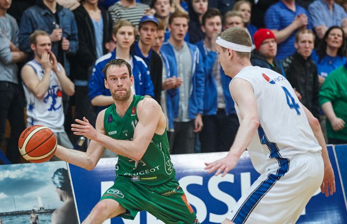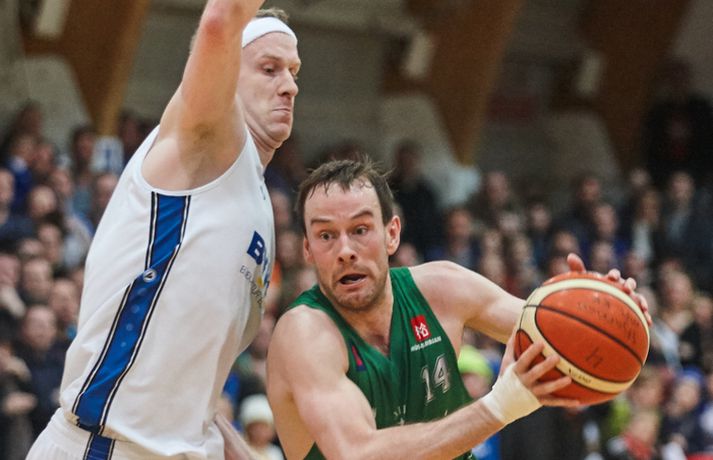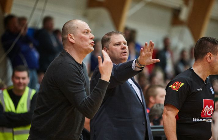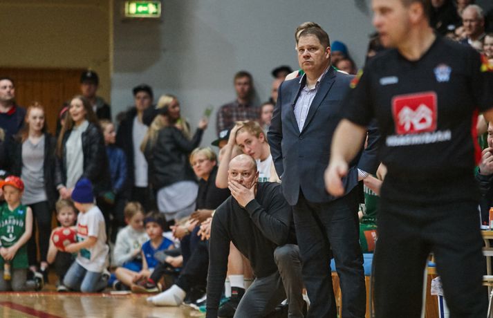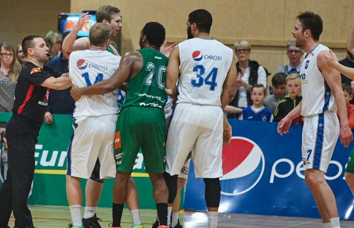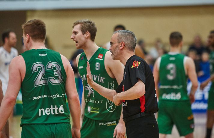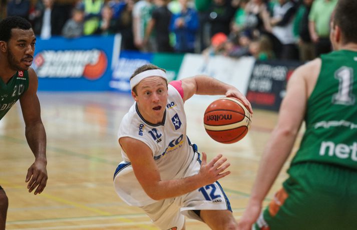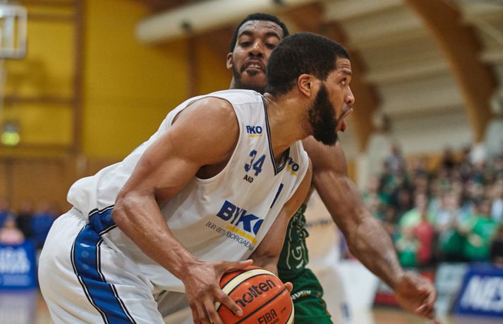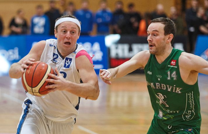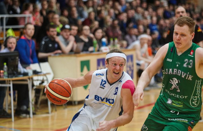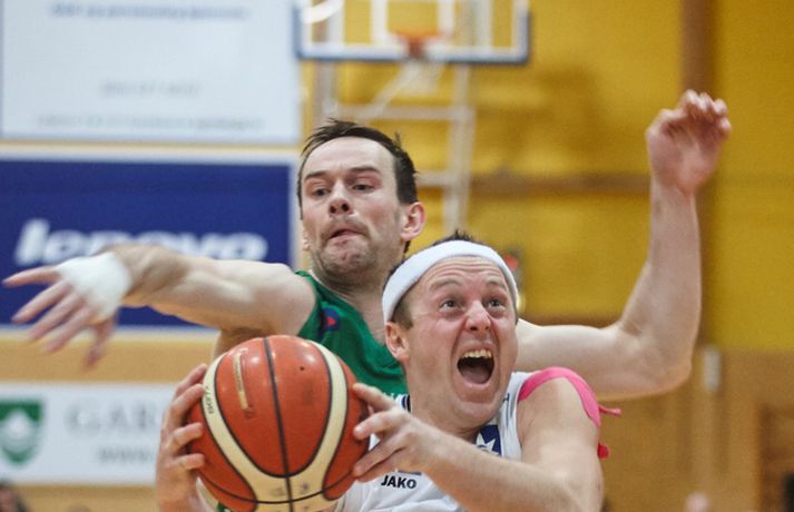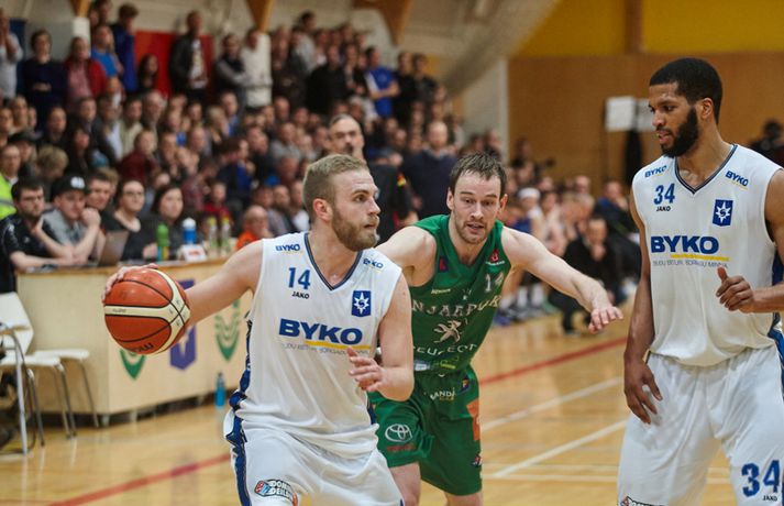 Njarðvík er komið í undanúrslit í Dominos-deild karla eftir magnaðan sigur, 79-75, á Stjörnunni í oddaleik liðanna í Ásgarði í kvöld. Spennan var mögnuð í kvöld og réðust úrslitin undir blálok leiksins. Jeremy Atkinson skoraði tuttugu stig fyrir Njarðvík í leiknum og Haukur Helgi Pálsson var með 19 stig.Anton Brink, ljósmyndari Vísis og Fréttablaðsins, var á leiknum í Ásgarði í kvöld og náði þessum skemmtilegu myndum hér fyrir ofan. Leikurinn hófst eins og allir leikir þessara liða í Ásgarði og var jafnt á öllum tölum til að byrja með. Liðin einfaldlega skiptust á að hafa eins og tveggja stig forskot. Justin Shouse stjórnaði sóknarleik Stjörnunnar vel og dreifðist stigaskor heimamanna töluvert í upphafi. Jeremy Atkinson var flottur í liði Njarðvíkinga og hafði gert sjö stig eftir tíu mínútna leik en staðan eftir 1. leikhlutann var 18-17 fyrir Njarðvíkinga. Haukur Helgi Pálsson, leikmaður Njarðvíkur, var á eldi í upphafi annars leikhluta og kom sér heldur betur í gírinn með körfu og þristi strax í upphafi fjórðungsins. Gestirnir náðu á þeim kafla ellefu stiga forskoti, 32-21, og útlitið bjart fyrir þá grænu. Justin Shouse hrökk þá í gang í liði Stjörnunnar og skoraði hvert stigið á fætur öðru þar til það munaði aðeins einu stigi á liðunum, 37-36, Njarðvíkingum í vil. Staðan í hálfleik var síðan 39-36 fyrir Njarðvík og leikurinn galopinn. Stjarnan gerðu fimm fyrstu stigin í síðari hálfleiknum og komst liðið því strax yfir 41-39. Í þriðja leikhlutanum var nánast jafnt á öllum tölum og vildi hvorugt liðið missa hvort annað of langt frá sér. Leikurinn spilaðist alveg eins og allir leikir í einvíginu, góðar varnir og langar sóknir. Staðan fyrir lokaleikhlutann var 55-54 fyrir heimamenn og allt á suðupunkti. Í fjórða leikhlutanum var allt á suðupunkti í Garðabænum og spennan í algjöru hámarki. Oddur Rúnar Kristjánsson, leikmaður Njarðvíkur, steig upp og setti þriggja stiga körfur á ótrúlega mikilvægum augnablikum og þegar fjórðungurinn var hálfnaður var staðan 68-62 fyrir Njarðvík. Gestirnir sýndu rosalega baráttu í síðasta leikhlutanum og það skilaði þeim tíu stiga forskoti, 73-63, þegar um þrjár mínútur voru eftir af leiknum. Þá settu aftur á móti heimamenn í fimmta gír og það tók þá eina mínútu að minnka muninn niður í þrjú stig, 75-72 fyrir Njarðvíkinga. Gríðarleg spenna var alveg fram á síðustu sekúndu en það voru gestirnir úr Njarðvík sem höfðu betur og fór Haukur Helgi Pálsson mikinn á lokaandartökum leiksins en hann setti niður vítaskot þegar allt var undir. Leiknum lauk frábærum sigri gestanna, 79-75.Stjarnan-Njarðvík 75-79 (17-18, 19-21, 19-15, 20-25)Stjarnan: Al'lonzo Coleman 24/12 fráköst/6 stoðsendingar, Justin Shouse 19/7 fráköst/8 stoðsendingar, Tómas Þórður Hilmarsson 9/14 fráköst, Tómas Heiðar Tómasson 9/5 fráköst, Marvin Valdimarsson 5, Ágúst Angantýsson 5, Arnþór Freyr Guðmundsson 2, Sæmundur Valdimarsson 2.Njarðvík: Jeremy Martez Atkinson 20/10 fráköst, Haukur Helgi Pálsson 19/10 fráköst/8 stoðsendingar, Oddur Rúnar Kristjánsson 13, Logi Gunnarsson 11, Maciej Stanislav Baginski 8, Hjörtur Hrafn Einarsson 5, Ólafur Helgi Jónsson 3. Haukur Helgi: Við vorum einfaldlega betri í þessu einvígiHaukur Helgi Pálsson var mikilvægur í kvöld.Vísir/Anton„Ég klikkaði á alltof mörgum vítum síðast og það var aldrei að fara gerast í kvöld,“ segir Haukur Helgi Pálsson, leikmaður Njarðvíkur, eftir leikinn. „Það héldu allir að við gætum ekki unnið þetta lið en við trúðum því allan tímann. Þeir spiluðu fast og eiga mikið hrós skilið eftir einvígið.“ Haukur segir einfaldlega að Njarðvíkingar hafi verið betri í þessu einvígi. Logi Gunnarsson kom inn í liðið fyrir síðasta leik en hann handabrotnaði í byrjun mars. „Ég væri bara grenjandi upp í sumarbústað ef þetta væri ég. Það er enginn maður eins og hann. Ég gæti ekki verið stoltari af samherja og svo ánægður að hafa spilað með honum á tímabilinu.“ Njarðvík mætir KR í undanúrslitunum. „Ég vildi alltaf mæta KR í úrslitakeppninni og það er að rætast.“ Hrafn: Myndi vilja halda áfram með þetta liðHrafn Kristjánsson, þjálfari Stjörnunnar.Vísir/Anton„Þetta er helvíti fúlt,“ segir Hrafn Kristjánsson, þjálfari Stjörnunnar, eftir leikinn. „Mér fannst við vera búnir að vinna okkur aftur inn í leikinn eftir slæman fyrri hálfleik. En við náðum ekki að fylgja þessu nægilega vel eftir.“ Stjörnumenn voru nokkuð óheppnir undir lokin og tapaði liðið boltanum á síðustu mínútunni á erfiðum tímapunkti. „Svona leikir ráðast ekki á einstaka atriðum og við hefðum bara átt að gera betur.“ Hrafn er að klára sinn tveggja ára samning við Stjörnuna. „Ég á eftir að setjast niður og ræða við stjórnina. Mér þykir vænt um þennan klúbb og vænt um þessa stráka og myndi gjarnan vilja halda áfram.“ Friðrik Ingi: Náðum að stilla spennustigið rétt„Ég er gríðarlega ánægður með leik liðsins og hvað við komum vel stemmdir,“ segir Friðrik Ingi Rúnarsson, þjálfari Njarðvíkur, eftir sigurinn. „Við gerðum bara andskoti vel hér í kvöld. Við settum niður mikilvæg víti á erfiðum tímapunkti. Við í þjálfarateyminu gerðum allt til að halda spennustiginu réttu fyrir leik og í leiknum.“ Friðrik er sérstaklega ánægður með varnarleik liðsins eftir leikinn í kvöld. „Hann var alveg frábær og lagði grunninn að þessum sigri í þessari seríu. Varnarleikur okkar hefur verið til mikilla fyrirmyndar í einvíginu í heild sinni og ég er gríðarlega ánægður með það.“ Friðrik þakkar Stjörnunni fyrir gott einvígi. „Þetta var frábært einvígi og ann