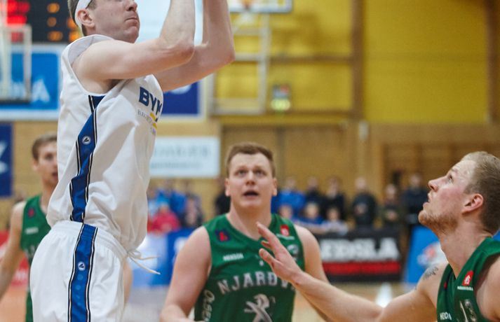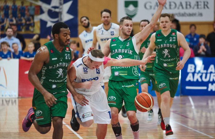 Umfjöllun, viðtöl og myndir: Stjarnan - Njarðvík 75-79 | Njarðvík í undanúrslit eftir spennuleik Stefán Árni Pálsson í Ásgarði skrifar 31. mars 2016 22:00 Njarðvík er komið í undanúrslit í Dominos-deild karla eftir magnaðan sigur, 79-75, á Stjörnunni í oddaleik liðanna í Ásgarði í kvöld. Spennan var mögnuð í kvöld og réðust úrslitin undir blálok leiksins. Jeremy Atkinson skoraði tuttugu stig fyrir Njarðvík í leiknum og Haukur Helgi Pálsson var með 19 stig.Anton Brink, ljósmyndari Vísis og Fréttablaðsins, var á leiknum í Ásgarði í kvöld og náði þessum skemmtilegu myndum hér fyrir ofan. Leikurinn hófst eins og allir leikir þessara liða í Ásgarði og var jafnt á öllum tölum til að byrja með. Liðin einfaldlega skiptust á að hafa eins og tveggja stig forskot. Justin Shouse stjórnaði sóknarleik Stjörnunnar vel og dreifðist stigaskor heimamanna töluvert í upphafi. Jeremy Atkinson var flottur í liði Njarðvíkinga og hafði gert sjö stig eftir tíu mínútna leik en staðan eftir 1. leikhlutann var 18-17 fyrir Njarðvíkinga. Haukur Helgi Pálsson, leikmaður Njarðvíkur, var á eldi í upphafi annars leikhluta og kom sér heldur betur í gírinn með körfu og þristi strax í upphafi fjórðungsins. Gestirnir náðu á þeim kafla ellefu stiga forskoti, 32-21, og útlitið bjart fyrir þá grænu. Justin Shouse hrökk þá í gang í liði Stjörnunnar og skoraði hvert stigið á fætur öðru þar til það munaði aðeins einu stigi á liðunum, 37-36, Njarðvíkingum í vil. Staðan í hálfleik var síðan 39-36 fyrir Njarðvík og leikurinn galopinn. Stjarnan gerðu fimm fyrstu stigin í síðari hálfleiknum og komst liðið því strax yfir 41-39. Í þriðja leikhlutanum var nánast jafnt á öllum tölum og vildi hvorugt liðið missa hvort annað of langt frá sér. Leikurinn spilaðist alveg eins og allir leikir í einvíginu, góðar varnir og langar sóknir. Staðan fyrir lokaleikhlutann var 55-54 fyrir heimamenn og allt á suðupunkti. Í fjórða leikhlutanum var allt á suðupunkti í Garðabænum og spennan í algjöru hámarki. Oddur Rúnar Kristjánsson, leikmaður Njarðvíkur, steig upp og setti þriggja stiga körfur á ótrúlega mikilvægum augnablikum og þegar fjórðungurinn var hálfnaður var staðan 68-62 fyrir Njarðvík. Gestirnir sýndu rosalega baráttu í síðasta leikhlutanum og það skilaði þeim tíu stiga forskoti, 73-63, þegar um þrjár mínútur voru eftir af leiknum. Þá settu aftur á móti heimamenn í fimmta gír og það tók þá eina mínútu að minnka muninn niður í þrjú stig, 75-72 fyrir Njarðvíkinga. Gríðarleg spenna var alveg fram á síðustu sekúndu en það voru gestirnir úr Njarðvík sem höfðu betur og fór Haukur Helgi Pálsson mikinn á lokaandartökum leiksins en hann setti niður vítaskot þegar allt var undir. Leiknum lauk frábærum sigri gestanna, 79-75.Stjarnan-Njarðvík 75-79 (17-18, 19-21, 19-15, 20-25)Stjarnan: Al'lonzo Coleman 24/12 fráköst/6 stoðsendingar, Justin Shouse 19/7 fráköst/8 stoðsendingar, Tómas Þórður Hilmarsson 9/14 fráköst, Tómas Heiðar Tómasson 9/5 fráköst, Marvin Valdimarsson 5, Ágúst Angantýsson 5, Arnþór Freyr Guðmundsson 2, Sæmundur Valdimarsson 2.Njarðvík: Jeremy Martez Atkinson 20/10 fráköst, Haukur Helgi Pálsson 19/10 fráköst/8 stoðsendingar, Oddur Rúnar Kristjánsson 13, Logi Gunnarsson 11, Maciej Stanislav Baginski 8, Hjörtur Hrafn Einarsson 5, Ólafur Helgi Jónsson 3. Haukur Helgi: Við vorum einfaldlega betri í þessu einvígiHaukur Helgi Pálsson var mikilvægur í kvöld.Vísir/Anton„Ég klikkaði á alltof mörgum vítum síðast og það var aldrei að fara gerast í kvöld,“ segir Haukur Helgi Pálsson, leikmaður Njarðvíkur, eftir leikinn. „Það héldu allir að við gætum ekki unnið þetta lið en við trúðum því allan tímann. Þeir spiluðu fast og eiga mikið hrós skilið eftir einvígið.“ Haukur segir einfaldlega að Njarðvíkingar hafi verið betri í þessu einvígi. Logi Gunnarsson kom inn í liðið fyrir síðasta leik en hann handabrotnaði í byrjun mars. „Ég væri bara grenjandi upp í sumarbústað ef þetta væri ég. Það er enginn maður eins og hann. Ég gæti ekki verið stoltari af samherja og svo ánægður að hafa spilað með honum á tímabilinu.“ Njarðvík mætir KR í undanúrslitunum. „Ég vildi alltaf mæta KR í úrslitakeppninni og það er að rætast.“ Hrafn: Myndi vilja halda áfram með þetta liðHrafn Kristjánsson, þjálfari Stjörnunnar.Vísir/Anton„Þetta er helvíti fúlt,“ segir Hrafn Kristjánsson, þjálfari Stjörnunnar, eftir leikinn. „Mér fannst við vera búnir að vinna okkur aftur inn í leikinn eftir slæman fyrri hálfleik. En við náðum ekki að fylgja þessu nægilega vel eftir.“ Stjörnumenn voru nokkuð óheppnir undir lokin og tapaði liðið boltanum á síðustu mínútunni á erfiðum tímapunkti. „Svona leikir ráðast ekki á einstaka atriðum og við hefðum bara átt að gera betur.“ Hrafn er að klára sinn tveggja ára samning við Stjörnuna. „Ég á eftir að setjast niður og ræða við stjórnina. Mér þykir vænt um þennan klúbb og vænt um þessa stráka og myndi gjarnan vilja halda áfram.“ Friðrik Ingi: Náðum að stilla spennustigið rétt„Ég er gríðarlega ánægður með leik liðsins og hvað við komum vel stemmdir,“ segir Friðrik Ingi Rúnarsson, þjálfari Njarðvíkur, eftir sigurinn. „Við gerðum bara andskoti vel hér í kvöld. Við settum niður mikilvæg víti á erfiðum tímapunkti. Við í þjálfarateyminu gerðum allt til að halda spennustiginu réttu fyrir leik og í leiknum.“ Friðrik er sérstaklega ánægður með varnarleik liðsins eftir leikinn í kvöld. „Hann var alveg frábær og lagði grunninn að þessum sigri í þessari seríu. Varnarleikur okkar hefur verið til mikilla fyrirmynd