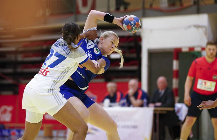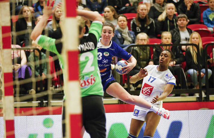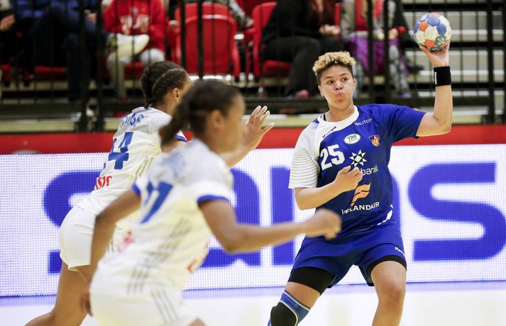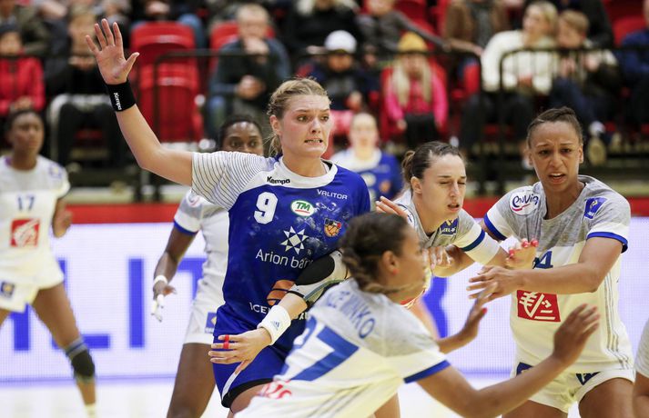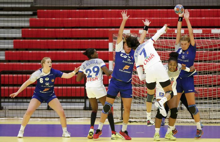 Umfjöllun, viðtöl og myndir: Ísland - Frakkland 16-30 | Aldrei möguleiki gegn Frökkum Ingvi Þór Sæmundsson í Valshöllinni skrifar 1. júní 2016 22:15 Íslenska liðið komst ekkert áleiðis í kvöld. vísir/eyþór Frakkland átti ekki í miklum vandræðum með að leggja Ísland að velli í undankeppni EM 2016 í Valshöllinni í kvöld. Lokatölur 16-30, franska liðinu í vil sem hefur unnið alla fimm leiki sína í riðli 7. Íslenska liðið er aftur á móti með tvö stig eftir einn sigur og fjögur töp. Ísland þarf að vinna Þýskaland í Stuttgart á sunnudaginn til að eiga möguleika á að komast í lokakeppni EM sem haldin verður í Svíþjóð í desember. Franska liðið er einfaldlega með sterkara lið en það íslenska og sýndi það í leiknum í kvöld. Eftir nokkuð jafnar upphafsmínútur seig franska liðið fram úr um miðjan fyrri hálfleik og eftir það var sigurinn aldrei í hættu. Líkt og í fyrri fjórum leikjunum í undankeppninni var sóknarleikurinn Íslands stærsta vandamálið. Íslenska liðið skoraði fjögur mörk á fyrstu 12 mínútum leiksins en aðeins þrjú það sem eftir lifði fyrri hálfleiks. Íslensku stelpunum gekk bölvanlega að koma skotum á markið en Amandine Leunaud í marki Frakka þurfti að glíma við helmingi færri skot en Íris Björk Símonardóttir í því íslenska í fyrri hálfleik. Franska vörnin var með allt á hreinu og sóknarmenn Íslands áttu nánast aldrei möguleika í stöðunni einn á einn. Þá sótti íslenska liðið ítrekað inn á miðjuna og línuspilið var lítið. Sólveig Lára Kjærnested minnkaði muninn í 4-5 þegar 12 mínútur voru liðnar af leiknum en Frakkar svöruðu með fjórum mörkum í röð og náðu fimm marka forystu, 4-9. Þegar íslenska liðið komst til baka var varnarleikurinn ágætur en það gerðist ekki nógu oft. Franska liðið skoraði fimm mörk eftir hraðaupphlaup í fyrri hálfleik á móti aðeins einu hjá því íslenska. Staðan í hálfleik var 7-15, Frökkum í vil. Gestirnir byrjuðu seinni hálfleikinn af krafti og náðu fljótlega 10 marka forystu, 8-18, og þá voru úrslitin í raun ráðin. Franska liðið var með undirtökin það sem eftir lifði leiks og hélt því íslenska í þægilegri fjarlægð. Frakkar juku muninn jafnt og þétt og unnu að lokum 14 marka sigur, 16-30. Karen Knútsdóttir var sú eina með lífsmarki í íslensku sókninni og skoraði sjö af 16 mörkum liðsins. Aðrir útispilarar Íslands áttu einfaldlega ekki röð í frönsku varnarmennina sem höfðu ekki mikið fyrir hlutunum í kvöld. Varnarleikur Íslands var þokkalegur og Íris Björk og Berglind Íris Hansdóttir geta verið nokkuð sáttar við sína frammistöðu. Íris Björk varði 11 skot og Berglind sjö eftir að hún kom inn á í seinni hálfleik.Ágúst stýrir íslenska kvennalandsliðinu í síðasta sinn á sunnudaginn.vísir/eyþórÁgúst: Alltof margar sem spiluðu undir getu Ágúst Jóhannsson stýrði íslenska kvennalandsliðinu í síðasta sinn á heimavelli þegar það tapaði stórt fyrir Frökkum í kvöld. Fjórtán mörkum munaði á liðunum en íslenska liðið átti aldrei möguleika í leiknum. „Varnarleikurinn var mjög góður og markvarslan líka. En því miður náðum við ekki að skapa okkur nógu mikið af hraðaupphlaupum upp úr þessum varnarleik,“ sagði Ágúst. „Í sóknarleiknum þurfum við framlag frá fleirum. Karen er afgerandi í sókninni og spilaði vel en við þurfum framlag frá fleiri leikmönnum. Það voru alltof margar sem spiluðu undir pari,“ bætti Ágúst við. Marga sterka leikmenn vantaði í íslenska liðið í kvöld og Ágúst segir það hafa haft sitt að segja. „Auðvitað sárvantar Ramune [Pekarskyte] og Rut [Jónsdóttur]. En það þýðir ekkert að væla yfir því, svona er staðan og við þurfum að byggja stelpurnar upp fyrir leikinn gegn Þýskalandi,“ sagði Ágúst sem var ósáttur við sóknarleikinn hjá íslenska liðinu í kvöld. „Við erum í vandræðum í stöðunni maður gegn manni og að koma boltanum á markið utan af velli. Það er áhyggjuefni og eitthvað sem við þurfum að laga fyrir leikinn á sunnudaginn,“ sagði Ágúst að lokum.Karen skoraði sjö af 16 mörkum Íslands í kvöld.vísir/eyþórKaren: Þurfum að leggja meira á okkur Karen Knútsdóttir segir að íslenska kvennalandsliðið í handbolta skorti líkamsstyrk til að glíma við bestu lið heims. „Mér finnst ég alltaf segja það sama eftir leiki, sóknarleikurinn varð okkur að falli. Það er auðvelt að standa í vörn og berjast og markverðirnir okkar eru góðir en við þurfum meiri hraða og snerpu til að geta gert eitthvað í sókninni,“ sagði Karen eftir tapið fyrir Frökkum í undankeppni EM 2016 í kvöld. „Við þurfum að draga menn í okkur og vinna stöðuna maður á móti manni en því miður erum við bara langt á eftir þar,“ bætti Karen við. Karenu finnst íslenska liðið hafa staðið í stað undanfarin ár og vill sjá breytingu þar á. „Við þurfum að fara að lyfta og hlaupa til að geta unnið svona þjóðir eins og Frakka og til að ná lengra. Við erum búnar að vera á sama stað í 2-3 ár, þetta er flatt og það er einhvern veginn ekkert að gerast hjá okkur,“ sagði Karen. Íslenska liðið komst á þrjú stórmót á skömmum tíma en nú eru fjögur ár liðin síðan það var síðast með í lokakeppni. „Auðvitað varð mikil breyting á liðinu og við misstum marga sterka leikmenn. Þetta tekur alveg tíma en það eru fjögur ár síðan við komust síðast á stórmót og það hefur kannski ekki verið mikil og markviss uppbygging í gangi. Við getum ekki endalaust afsakað okkur. Mér finnst við þurfa að leggja aðeins meira á okkur. „Okkur vantar því miður snerpu og styrk, eitthvað sem á að vera auðvelt að laga. Við erum með leikskil