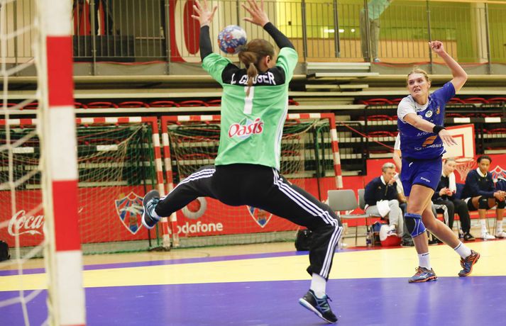 Frakkland átti ekki í miklum vandræðum með að leggja Ísland að velli í undankeppni EM 2016 í Valshöllinni í kvöld. Lokatölur 16-30, franska liðinu í vil sem hefur unnið alla fimm leiki sína í riðli 7. Íslenska liðið er aftur á móti með tvö stig eftir einn sigur og fjögur töp. Ísland þarf að vinna Þýskaland í Stuttgart á sunnudaginn til að eiga möguleika á að komast í lokakeppni EM sem haldin verður í Svíþjóð í desember. Franska liðið er einfaldlega með sterkara lið en það íslenska og sýndi það í leiknum í kvöld. Eftir nokkuð jafnar upphafsmínútur seig franska liðið fram úr um miðjan fyrri hálfleik og eftir það var sigurinn aldrei í hættu. Líkt og í fyrri fjórum leikjunum í undankeppninni var sóknarleikurinn Íslands stærsta vandamálið. Íslenska liðið skoraði fjögur mörk á fyrstu 12 mínútum leiksins en aðeins þrjú það sem eftir lifði fyrri hálfleiks. Íslensku stelpunum gekk bölvanlega að koma skotum á markið en Amandine Leunaud í marki Frakka þurfti að glíma við helmingi færri skot en Íris Björk Símonardóttir í því íslenska í fyrri hálfleik. Franska vörnin var með allt á hreinu og sóknarmenn Íslands áttu nánast aldrei möguleika í stöðunni einn á einn. Þá sótti íslenska liðið ítrekað inn á miðjuna og línuspilið var lítið. Sólveig Lára Kjærnested minnkaði muninn í 4-5 þegar 12 mínútur voru liðnar af leiknum en Frakkar svöruðu með fjórum mörkum í röð og náðu fimm marka forystu, 4-9. Þegar íslenska liðið komst til baka var varnarleikurinn ágætur en það gerðist ekki nógu oft. Franska liðið skoraði fimm mörk eftir hraðaupphlaup í fyrri hálfleik á móti aðeins einu hjá því íslenska. Staðan í hálfleik var 7-15, Frökkum í vil. Gestirnir byrjuðu seinni hálfleikinn af krafti og náðu fljótlega 10 marka forystu, 8-18, og þá voru úrslitin í raun ráðin. Franska liðið var með undirtökin það sem eftir lifði leiks og hélt því íslenska í þægilegri fjarlægð. Frakkar juku muninn jafnt og þétt og unnu að lokum 14 marka sigur, 16-30. Karen Knútsdóttir var sú eina með lífsmarki í íslensku sókninni og skoraði sjö af 16 mörkum liðsins. Aðrir útispilarar Íslands áttu einfaldlega ekki röð í frönsku varnarmennina sem höfðu ekki mikið fyrir hlutunum í kvöld. Varnarleikur Íslands var þokkalegur og Íris Björk og Berglind Íris Hansdóttir geta verið nokkuð sáttar við sína frammistöðu. Íris Björk varði 11 skot og Berglind sjö eftir að hún kom inn á í seinni hálfleik.Ágúst stýrir íslenska kvennalandsliðinu í síðasta sinn á sunnudaginn.vísir/eyþórÁgúst: Alltof margar sem spiluðu undir getu Ágúst Jóhannsson stýrði íslenska kvennalandsliðinu í síðasta sinn á heimavelli þegar það tapaði stórt fyrir Frökkum í kvöld. Fjórtán mörkum munaði á liðunum en íslenska liðið átti aldrei möguleika í leiknum. „Varnarleikurinn var mjög góður og markvarslan líka. En því miður náðum við ekki að skapa okkur nógu mikið af hraðaupphlaupum upp úr þessum varnarleik,“ sagði Ágúst. „Í sóknarleiknum þurfum við framlag frá fleirum. Karen er afgerandi í sókninni og spilaði vel en við þurfum framlag frá fleiri leikmönnum. Það voru alltof margar sem spiluðu undir pari,“ bætti Ágúst við. Marga sterka leikmenn vantaði í íslenska liðið í kvöld og Ágúst segir það hafa haft sitt að segja. „Auðvitað sárvantar Ramune [Pekarskyte] og Rut [Jónsdóttur]. En það þýðir ekkert að væla yfir því, svona er staðan og við þurfum að byggja stelpurnar upp fyrir leikinn gegn Þýskalandi,“ sagði Ágúst sem var ósáttur við sóknarleikinn hjá íslenska liðinu í kvöld. „Við erum í vandræðum í stöðunni maður gegn manni og að koma boltanum á markið utan af velli. Það er áhyggjuefni og eitthvað sem við þurfum að laga fyrir leikinn á sunnudaginn,“ sagði Ágúst að lokum.Karen skoraði sjö af 16 mörkum Íslands í kvöld.vísir/eyþórKaren: Þurfum að leggja meira á okkur Karen Knútsdóttir segir að íslenska kvennalandsliðið í handbolta skorti líkamsstyrk til að glíma við bestu lið heims. „Mér finnst ég alltaf segja það sama eftir leiki, sóknarleikurinn varð okkur að falli. Það er auðvelt að standa í vörn og berjast og markverðirnir okkar eru góðir en við þurfum meiri hraða og snerpu til að geta gert eitthvað í sókninni,“ sagði Karen eftir tapið fyrir Frökkum í undankeppni EM 2016 í kvöld. „Við þurfum að draga menn í okkur og vinna stöðuna maður á móti manni en því miður erum við bara langt á eftir þar,“ bætti Karen við. Karenu finnst íslenska liðið hafa staðið í stað undanfarin ár og vill sjá breytingu þar á. „Við þurfum að fara að lyfta og hlaupa til að geta unnið svona þjóðir eins og Frakka og til að ná lengra. Við erum búnar að vera á sama stað í 2-3 ár, þetta er flatt og það er einhvern veginn ekkert að gerast hjá okkur,“ sagði Karen. Íslenska liðið komst á þrjú stórmót á skömmum tíma en nú eru fjögur ár liðin síðan það var síðast með í lokakeppni. „Auðvitað varð mikil breyting á liðinu og við misstum marga sterka leikmenn. Þetta tekur alveg tíma en það eru fjögur ár síðan við komust síðast á stórmót og það hefur kannski ekki verið mikil og markviss uppbygging í gangi. Við getum ekki endalaust afsakað okkur. Mér finnst við þurfa að leggja aðeins meira á okkur. „Okkur vantar því miður snerpu og styrk, eitthvað sem á að vera auðvelt að laga. Við erum með leikskilninginn og hæfileikana,“ sagði Karen. En finnst henni að Ísland þurfi fleiri leikmenn í atvinnumennsku erlendis? „Ekkert endilega. Það er ekki atvinnumannaumhverfi hérna en þær þurfa kannski að æfa meira. Við e