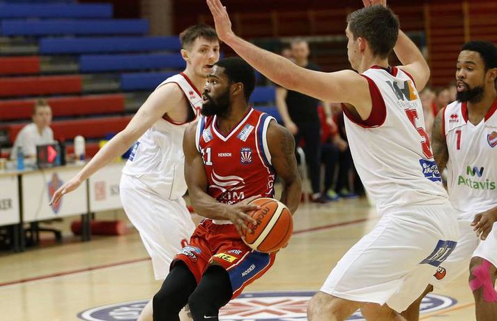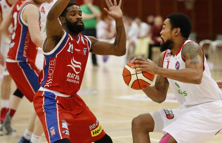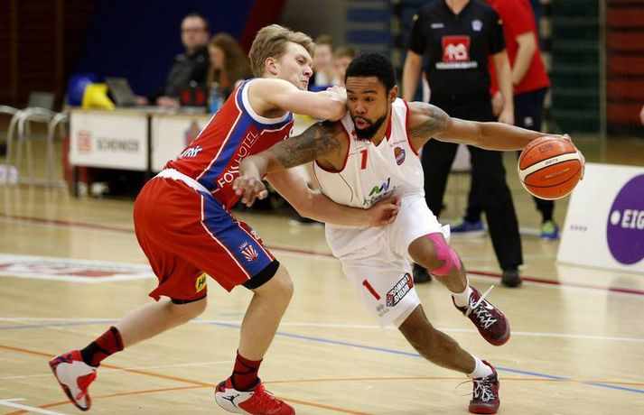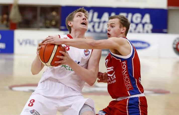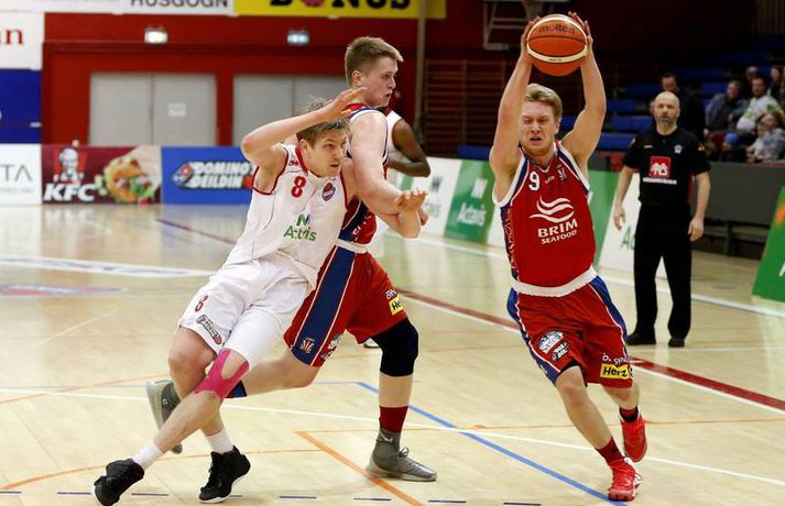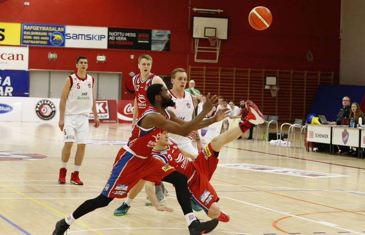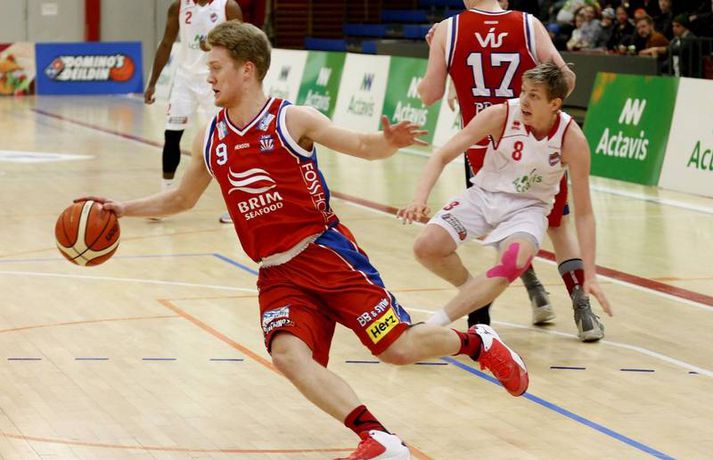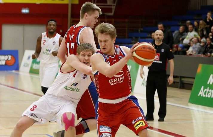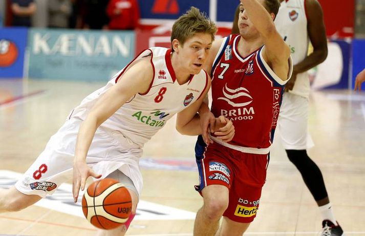 Haukar komust upp úr fallsæti í Domino's deild karla eftir 102-83 sigur á Snæfelli í Schenker-höllinni í Hafnarfirði í kvöld. Þetta var lífsnauðsynlegur sigur fyrir Hauka sem eru nú með jafn mörg stig og Skallagrímur (14) en eru sæti ofar sökum betri árangurs í innbyrðis viðureignum liðanna. Haukar eiga tvo mjög erfiða leiki eftir, gegn Stjörnunni og Tindastóli. Skallagrímur á aftur móti eftir að spila við Þór Þ. og Grindavík. Haukar byrjuðu leikinn af miklum krafti og skoruðu að vild gegn slakri vörn Snæfells. Heimamenn voru einnig með mikla yfirburði í frákastabaráttunni og skoruðu alls 36 stig eftir sóknarfráköst í leiknum í kvöld. Haukar leiddu með átta stigum, 31-23, eftir 1. leikhluta. Snæfell spilaði betur í 2. leikhluta og náði að minnka muninn niður í fjögur stig, 38-34. Þá kom frábær 14-2 kafli hjá Haukum sem voru 52-36 yfir í hálfleik. Hólmarar breyttu í pressuvörn í byrjun seinni hálfleiks og hún sló Haukana út af laginu. Snæfell skoraði níu fyrstu stig seinni hálfleiks og um miðjan 3. leikhluta minnkaði Geir Elías Úlfur Helgason muninn í þrjú stig, 53-50. Þá gáfu Haukar aftur í og juku muninn í 11 stig, 74-63. Heimamenn héldu uppteknum hætti í byrjun 4. leikhluta og kláruðu leikinn þá. Á endanum munaði 19 stigum á liðunum, 102-83.Af hverju unnu Haukar? Haukar byrjuðu leikinn af krafti og gáfu strax tóninn. Sóknarleikurinn gekk smurt undir stjórn Emils Barja sem var með 10 stoðsendingar í leiknum í kvöld. Haukar bognuðu tvisvar í leiknum en brotnuðu aldrei. Þeir stóðust áhlaup Snæfells í 2. og 3. leikhluta og náðu þá aftur að byggja upp gott forskot.Bestu menn vallarins: Emil stýrði sóknarleik Hauka af myndarskap; gaf 10 stoðsendingar og stal sjö boltum áður en hann fór af velli með fimm villur. Kristján Leifur Sverrisson var afar öflugur þær 23 mínútur sem hann spilaði. Hann skoraði 14 stig og tók 10 fráköst. Sherrod Wright gerði 25 stig og þá var Hjálmar Stefánsson frábær í 4. leikhluta þar sem hann skoraði 13 af 20 stigum sínum. Christian Covile var rólegur í fyrri hálfleik en fór í gang í þeim seinni og endaði með 29 stig. Þá átti Maciej Klimaszewski ágætis innkomu.Tölfræðin sem vakti athygli: Haukar unnu frákastabaráttuna 57-45 og skoruðu 36 stig eftir sóknarfráköst. Stigaskorið dreifðist vel hjá Haukum en fimm leikmenn liðsins skoruðu 14 stig eða meira í leiknum.Hvað gekk illa? Varnarleikur Snæfells var mjög slakur allan leikinn, ef frá er talinn fyrri hluti 3. leikhluta þegar pressuvörn liðsins gerði Haukum erfitt fyrir. Þá var sóknarleikur Snæfells full einhæfur en liðið hélt sig að mestu fyrir utan þriggja stiga línuna og tók alls 33 þriggja stiga skot í leiknum.Vilhjálmur: Skíðaferðin hafði engin áhrif á undirbúninginn Vilhjálmur Steinarsson stýrði Haukum gegn Snæfelli í kvöld ásamt Kristni Jónassyni en eins og frægt er orðið er Ívar Ásgrímsson, þjálfari liðsins, í skíðaferð erlendis. Vilhjálmur var að vonum ánægður með sigurinn þegar blaðamaður Vísis hitti hann að máli eftir leik. „Við stefndum alla vikuna að því að bæta sóknarleikinn. Við höfum spilað ágætis vörn í síðustu tveimur leikjum en sóknarleikurinn var svolítið dapur. Við ákváðum að breyta aðeins til, þetta voru öðruvísi æfingar og leikur því Ívar var í fríi. Við ákváðum breyta áherslunum aðeins og fá gleðina inn í þetta aftur. Það skilaði sér í kvöld,“ sagði Vilhjálmur. Haukar byrjuðu leikinn af miklum krafti en gekk erfiðlega að slíta sig frá Snæfelli. „Við áttum tvo slaka kafla en náðum sem betur fer að klóra okkur út úr því sem við höfum ekki gert í vetur. Við höfum misst þessa jöfnu leiki. Snæfell er með hörkulið og vel þjálfað og ég er mjög feginn að hafa klárað þetta,“ sagði Vilhjálmur. En hvernig var fyrir hann og Kristinn að koma inn í þetta og stýra liðinu í kvöld? „Við höfum þjálfað áður þótt við höfum ekki þjálfað meistaraflokk. Hann spilaði lengi með liðinu og ég kom inn í þetta þegar Pétur [Ingvarsson, fyrrverandi aðstoðarþjálfari] fór. Ferðin hans Ívar var löngu ákveðin,“ sagði Vilhjálmur. En hafði þessi fræga skíðaferð einhver áhrif á undirbúninginn fyrir leikinn í kvöld? „Nei, engin. Við vissum alveg í hvað stefndi og vorum búnir að undirbúa okkur,“ sagði Vilhjálmur að lokum.Ingi Þór: Byrjunarliðið var flatt Snæfell bíður enn eftir sínum fyrsta sigri í Domino's deild karla í karla. En hvað vantaði upp á gegn Haukum í kvöld að mati Inga Þórs Steinþórssonar, þjálfara liðsins? „Það vantaði svolítið mikið upp á. Mér fannst byrjunarliðið í heild sinni svolítið flatt á meðan þeir voru tilbúnir og vel stemmdir,“ sagði Ingi Þór eftir leik. „Við sættum okkur við að vera fyrir utan þriggja stiga línuna og sóttum ekki á körfuna. Um leið og við gerðum það var þetta jafn leikur. Byrjunin sat í okkur og það var slæmt að missa þá tvisvar frá sér. Munurinn var líka of mikill í fráköstunum, þeir voru miklu grimmari í þeim.“ Snæfell skoraði níu fyrstu stig 3. leikhluta og náði að minnka muninn í þrjú stig, 53-30. Nær komust gestirnir þó ekki. „Við gerðum mistök í færslum og þeir skoruðu svona stemmningskörfur,“ sagði Ingi Þór og beindi talinu að liði Hauka. „Það er skandall á hvaða stað þetta lið er í töflunni. Þeir eru með tvo Kana og fullt af gríðarlega góðum körfuboltamönnum. Það er skandall að þeir séu að berjast við fall, það er bara asnalegt. Ég ber virðingu fyrir strákunum í þessu liði og þeir eru miklu betri í körfubolta en þeir sýna,“ sagði Ingi sem sagði allt havaríið í kringum skíðaferð Ívars Ásgrímssonar, þjálfara Ha