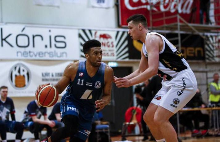 KR og Keflavík áttust við í fjögurra liða úrslitum Domino‘s deildar karla í kvöld í Vesturbænum. Þetta var fyrsti leikur liðanna en það lið sem vinnur þrjá leiki kemst í sjálfa úrslitarimmuna um titilinn eftirsótta.Ernir Eyjólfsson, ljósmyndari Fréttablaðsins og Vísis, var í Valshöllinni og tók meðfylgjandi myndir. KR átti í litlum erfiðleikum með lélega Keflvíkinga í kvöld og sigruðu örugglega 90-71 eftir að hafa leitt 46-41 í hálfleik. Fyrri hálfleikurinn var nokkuð jafn þó KR hafi verið með ákveðna yfirburði. Keflvíkingar náðu að halda sér inní leiknum á stoltinu en alveg ljóst að munurinn í hálfleik hefði auðveldlega geta verið meiri. Í seinni hálfleik kafsilgdu svo KR Keflavík; frábær varnarleikur liðsins hélt gestunum í járnum og skoraði Keflavík aðeins 14 stig í hlutanum. Það má segja að lokafjórðungurinn hafi aðeins verið formsatriði að spila, slíkur var munurinn á liðunum. Staðan 71-55 og engin merki um að gestirnir gætu brúað þennan mun. KR sleppti tökunum í nokkrar mínútur en svo herti liðið aftur tökin og slökkti mjög afgerandi á vonum Suðurnesjamanna. Þetta var leikur kattarins að músinni og ljóst að róðurinn verður sérlega erfiður fyrir Keflavík í þessari seríu. Hjá Keflavík var Amin Stevens bestur en langt frá því eins afgerandi og hans er von og vísa. Reggie Dupree átti spretti en aðrir langt frá sínu besta og liðsheildin ljósárum frá sínu besta. Hjá KR voru allir í sparifötunum; liðsheildin frábær og allir byrjunarliðsmenn liðsins góðir. Sigurður Þorvaldsson kom gríðarlega sterkur af bekknum, sem og Þórir Þorbjarnarson. Frábær liðsigur hjá frábæru liði. Nánar verður fjallað um leikinn síðar í kvöld.KR-Keflavík 90-71 (24-21, 22-20, 25-14, 19-16)KR: Darri Hilmarsson 18/8 fráköst, Brynjar Þór Björnsson 15/4 fráköst, Þórir Guðmundur Þorbjarnarson 14/9 fráköst, Philip Alawoya 11/4 fráköst, Sigurður Á. Þorvaldsson 11, Jón Arnór Stefánsson 10/5 stoðsendingar, Pavel Ermolinskij 4/6 fráköst/8 stoðsendingar, Snorri Hrafnkelsson 4, Vilhjálmur Kári Jensson 3.Keflavík: Amin Khalil Stevens 25/24 fráköst, Reggie Dupree 14/5 fráköst, Magnús Már Traustason 8, Hörður Axel Vilhjálmsson 8/5 stoðsendingar, Guðmundur Jónsson 8, Ágúst Orrason 6, Davíð Páll Hermannsson 2.vísir/ernirvísir/ernirvísir/ernirvísir/ernirvísir/ernirvísir/ernir