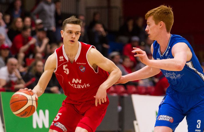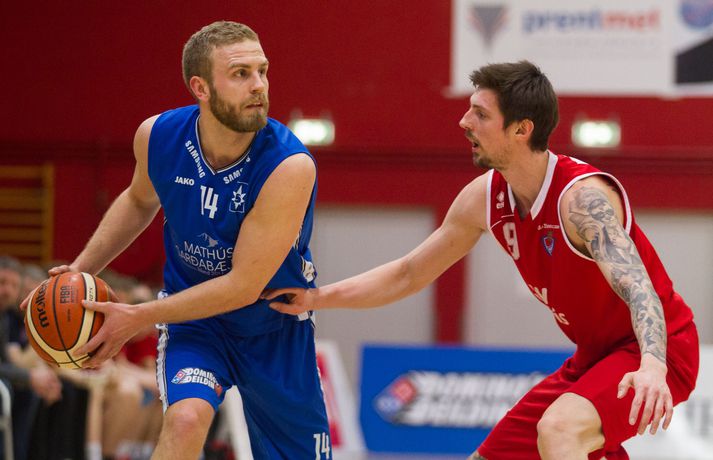 Umfjöllun, viðtöl og myndir: Haukar - Stjarnan 80-73 | Haukar skrefi nær deildarmeistaratitlinum Böðvar Sigurbjörnsson skrifar 1. mars 2018 23:15 Breki Gylfason og Tómas Þórður Hilmarsson eigast við í leiknum í dag vísir/bára Topplið Hauka í Domino's deild karla í körfubolta tók í kvöld á móti Stjörnunni frá Garðabæ á heimavelli sínum í Schenker höllinni að Ásvöllum í Hafnafirði. Í lið Hauka vantaði landsliðsmanninn Kára Jónsson sem varð fyrir því óláni að fingurbrotna á æfingu með íslenska landsliðinu í síðustu viku. Leikurinn fór rólega af stað hvað stigaskor varðar og einkenndist frekar af góðum varnarleik liðanna til að byrja með. Haukarnir náðu þó fljótlega undirtökunum í leiknum og voru ávallt einu skrefi á undan Stjörnuliðinu, í hálfleik leiddu heimamenn með þremur stigum. Þriðji leikhlutinn var fjörugur og mikið skorað í honum framan af, undir lok leikhlutans náðu Haukarnir aðeins að slíta sig frá gestunum og leiddu með átta stigum fyrir fjórða og síðasta leikhlutann. Fjórði leikhlutinn endurspeglaði í raun gang leiksins. Stjörnumenn reyndu hvað þeir gátu að ná Haukunum en sterkari heimamenn virtust ávallt eiga til svör við áhlaupum gestanna. Það fór þó svo að lokum að Haukarnir styrktu stöðu sína á toppi deildarinnar með góðum sigri á liði Stjörnunnar sem á í baráttu um sæti í úrslitakeppninni.Afhverju unnu Haukar? Liðsheildin var sterk og greinilegt að liðið ætlaði ekki að láta fjarveru Kára Jónssonar setja sig út af laginu. Liðið spilaði vel varnarlega og hitti úr skotunum sínum á mikilvægum augnablikum í leiknum.Hverjir stóðu upp úr? Í jöfnu á góðu liðið Hauka var Paul Anthony Jones frábær með 23 stig og 13 fráköst. Hann setti niður mikið af erfiðum skotum sem ekki margir leikmenn í þessari deild geta sett niður. Einnig voru Finnur Atli, Emil Barja og Haukur Óskarsson mjög góðir. Í liði Stjörnunnar bar Hlynur Elías Bæringsson af með 23 stig og 18 fráköst.Hvað gekk illa? Erlendu leikmönnum Stjörnunnar voru mislagðar hendur í þessum leik og í raun voru þeir bara slakir. Það er alveg ljóst að Stjarnan á heimtingu á því að atvinnumenn sem fengnir eru hingað til lands til að styrkja liðið skili betra dagsverki en þeir gerðu í leiknum í kvöld.Hvað gerist næst? Haukar geta tryggt sér deildarmeistaratitilinn með sigir á ÍR í Seljaskóla í Breiðholtinu, á meðan Stjarnan leikur mikilvægan leik á heimavelli á móti Keflavík sem gæti ráðið miklu um framhaldið fyrir liðið og sætaskipan í úrslitakeppninni.Haukar-Stjarnan 80-73 (18-14, 22-24, 22-16, 18-19) Haukar: Paul Anthony Jones III 23/13 fráköst, Haukur Óskarsson 15, Hjálmar Stefánsson 10, Emil Barja 10/5 fráköst/10 stoðsendingar, Finnur Atli Magnússon 10/12 fráköst/4 varin skot, Breki Gylfason 5/4 fráköst, Kristján Leifur Sverrisson 5/5 fráköst, Hilmar Pétursson 2.Stjarnan: Hlynur Elías Bæringsson 23/18 fráköst, Darrell Devonte Combs 16/5 fráköst, Tómas Þórður Hilmarsson 13/8 fráköst, Eysteinn Bjarni Ævarsson 8, Róbert Sigurðsson 6, Collin Anthony Pryor 6, Dúi Þór Jónsson 1.Paul Anthony Jones hinn þriðji í leiknum í kvöldvísir/báraÍvar: Við vissum að það þyrftu aðrir leikmenn að stíga upp í okkar liði „Við vissum það þegar Kári meiddist að það þyrftu aðrir að stíga upp og það gerðu menn hérna í kvöld, það voru margir að skora hjá okkur í kvöld og margir að gera góða hluti,“ sagði Ívar Ásgrímsson, þjálfari Hauka, eftir leikinn. Ívar sagði það ljóst að Kári yrði ekki meira með liðinu vegna fingurbrotsins fyrr en komið væri í úrslitakeppnina. „Það er alveg 100% að hann verður ekki meira með þangað til komið er í úrslitakeppnina, við ætlum að hvíla hann til að eiga hann góðan þar. Þó við mættum nota hann fyrr myndum við ekki gera það, við erum með gott lið sem mun skila þessu fyrir okkur þangað til að Kári kemur aftur inn í þetta með okkur í úrslitakeppninni,“sagði Ívar Ásgrímsson.Arnþór Freyr Guðmundsson og Haukur Óskarssonvísir/báraHrafn: Við vorum ekki nógu beittir, því miður „Það voru þarna nokkur mikilvæg augnablik í þessum leik þar sem við höfðum tækifæri til að koma okkur inn í þetta en það hreinlega tókst ekki. Á meðan þeir voru að setja sín skot voru okkar ekki að detta þegar það skipti mestu máli. Það voru margir leikmenn að stíga upp í þeirra liðið og setja stór skot, ég verð að hrósa þeim fyrir það,“ sagði Hrafn Kristjánsson, þjálfari Stjörnunnar, eftir leikinn. Hrafn gagnrýndi reglur deildarinnar um erlenda leikmenn eftir leikinn. Mörg lið eru í dag með tvo bandaríska leikmenn, enn aðeins einn leikmaður sem ekki er með íslenskan ríkisborgararétt má vera inn á vellinum í einu. „Nei, þetta er í rauninni alveg handónýtt og kannski má segja að þetta sé deildinni til minnkunar eins og þetta er núna. Það sýnir okkur hvað mörg lið eru komin í þetta, að vera með tvo Kana, að þetta er ekki að virka lengur eins og þetta er. Mér fannst 4 +1 gefa okkur alveg rosalega mikið til margra ára en nú er þetta farið að taka frá okkur. Ég held að deildin megi alveg við því að deildin skoða þessi mál.“ sagði Hrafn Kristjánsson þjálfari Stjörnunnar að lokum.Arnþór Freyr Guðmundsson.Vísir/BáraTómas Þórður Hilmarsson.Vísir/BáraHlynur Bæringsson.Vísir/BáraArnþór Freyr Guðmundsson.Vísir/BáraPaul Anthony Jones III.Vísir/BáraBreki Gylfason.Vísir/BáraHjálmar Stefánsson.Vísir/BáraHalldór Geir Jensson, dómari.Vísir/BáraDarrell Devonte Combs.Vísir/BáraHlynur Bæringsson.Vísir/BáraDarrel Devonte Combs.Vísir/BáraÍsak Ernir Kristinsson.Vísir/BáraRóbert Sigurðsson.Vísir/BáraJóhannes Páll Friðriksson, dó