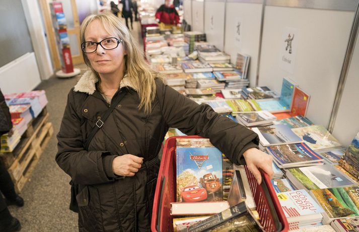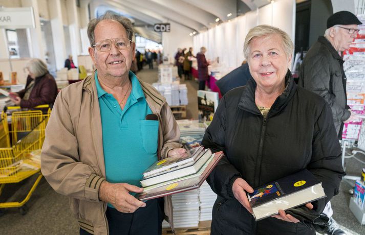 Maður lætur alltaf freistast Kolbrún Bergþórsdóttir skrifar 10. mars 2018 10:00 Hafsteinn og Anna eru ekki síst með börnin í huga við val sitt á bókum. „Við eigum nokkuð af bókum. Reyndar svo mikið að nú verðum við eiginlega að fara að hætta að kaupa þær, en þegar maður kemur á þennan markað lætur maður alltaf freistast,“ segir Hreinn Bergsveinsson sem mættur er á svæðið ásamt Valgerði Pálsdóttur. Meðal bóka sem vekja áhuga þeirra er ritsafn Þorsteins frá Hamri og barnabækur, þar á meðal Vaknaðu, Sölvi eftir Eddu Heiðrúnu Backman og Þórarin Eldjárn og Stígvélaði kötturinn. „Við erum með barnabarn sem verður þriggja ára nú í mars, heldurðu að hann verði ekki að fara að lesa,“ segir Hreinn kankvís. Hafsteinn Guðjónsson og Anna Helgadóttir eru einnig í bókakaupum og sömuleiðis með börnin í huga. „Það er mikilvægt að börn lesi,“ segir Anna og sýnir blaðamanni stafla af bókum um hinn skemmtilega Skúla skelfi. Orð að sönnu eftir Jón G. Friðjónsson er einnig í körfunni. „Ég hef gaman af slíkum bókum og kaupi þær oft,“ segir Hafsteinn. Anna valdi sér Snarkið í stjörnunum eftir Jón Kalman Stefánsson sem er höfundur sem hún hefur mikið dálæti á. Smásögur heimsins, Rómanska Ameríka er einnig með í bókakaupunum. „Við erum nýbúin að vera í Perú þannig að okkur finnst freistandi að lesa sögur frá þessum heimshluta,“ segja þau.Lifandi bækur Blaðamaður rekst á Svein Einarsson, fyrrverandi þjóðleikhússtjóra. Eiginkona hans, Þóra Kristjánsdóttir, er skammt frá niðursokkin í að skoða bækur. Sveinn segist hafa komið á bókamarkaðinn frá unga aldri. „Það er svo gaman að vera innan um bækur, þær eru svo lifandi.“ Hann segir þau hjón eiga mikið af bókum. „Reyndar svo margar að nú er ég kominn á það stig í lífinu að ég er að gefa bækur frá mér. Á seinni árum hef ég sagt við sjálfan mig þegar ég mæti á bókamarkaðinn: Nú kaupi ég ekkert því við eigum svo mikið af bókum, en hef alltaf svikið það. Alltaf geng ég út af markaðnum með fullt af bókum.“ Meðal bóka í kerrunni hjá Sveini er Orð að sönnu. „Ég hef svo gaman af orðaleikjum og spakmælum og er alltaf að geta mér þess til hvernig orðatiltæki hafa orðið til,“ segir hann. Ármann Schelander er að skoða bókina Eitt þúsund tungumál þegar blaðamaður ónáðar hann. Hann segist hafa mestan áhuga á fræðibókum og hefur þegar ákveðið að kaupa Jörund hundadagakonung eftir Sarah Bakewell og líklegt er að tungumálabókin verði sömuleiðis fyrir valinu. Hann segist einnig vel geta hugsað sér að kaupa bók um málvísindi. Katrín Ósk Þráinsdóttir segist yfirleitt mæta á markaðinn enda sé hún bókaormur. „Mér finnst líka gaman að gefa bækur,“ segir hún með fangið fullt af bókum, þar innan um eru þýddar erlendar skáldsögur sem hún ætlar meðal annars að gefa. Þar á meðal eru Undur eftir RJ Palacio og Ólæsinginn og Víga-Anders eftir Jonas Jonasson. „Svo er ég með bækur fyrir litlar frænkur sem búa erlendis, ég vil leggja mitt af mörkum til að halda íslenskunni að þeim. Ég hef áhuga á göngum og valdi mér 25 gönguleiðir á Þingvallasvæðinu og er svo með hjólabók fyrir manninn minn sem gæti nýst honum vel.“Bækur til fermingargjafa Baldur Þórhallsson og Felix Bergsson eru að sanka að sér bókum þegar blaðamaður mætir þeim. Baldur hefur verið bókaormur frá unga aldri. „Ég er alinn upp við Hellu á Rangárvöllum og þá biðum við krakkarnir alltaf spennt eftir því að bókamarkaðurinn væri opnaður á kaupfélagsloftinu. Bókamarkaðurinn stóð frá 1. desember fram yfir jól. Ég gat ekki beðið eftir að sjá nýjustu jólabækurnar, keypti kannski eina og pantaði aðrar í jólagjöf.“ „Við erum bæði að kaupa fyrir okkur sjálfa og bækur til gjafa,“ segir Felix sem segist iðulega mæta á bókamarkaðinn. Meðal þeirra bóka sem hann keypti fyrir sjálfan sig eru Egils sögur eftir Pál Valsson og Stuð vors lands eftir Dr. Gunna. Úr fjötrum – Saga Alþýðuflokksins eftir Guðjón Friðriksson er bók sem Baldur valdi sér ásamt bókinni Stríðið mikla eftir Gunnar Þór Bjarnason. Í körfunni eru einnig bækur sem þeir segja ætlaðar til fermingargjafa, þar á meðal Vísindabókin. Þóra Guðmundsdóttir er mætt á bókamarkaðinn ekki síst í þeim erindagjörðum að kaupa bækur til fermingargjafa. „Ég er ekki fylgjandi því að gefa einungis peninga í fermingargjöf,“ segir hún. „Mér finnst að það eigi að gefa bækur og kannski láta einhvern pening fylgja með. Til fermingargjafa hefur hún meðal annars valið draumaráðningabók, tilvitnanabók og Eitt þúsund tungumál, en blaðamaður sér einmitt nokkra gesti markaðarins skoða þá bók af miklum áhuga. „Unglingarnir eiga eftir að kíkja í þessar bækur einhvern tíma,“ segir Þóra af ákveðni.Í minningu mömmu Gerður Steinarsdóttir og Erlín Katla Birgisdóttir eru síðustu gestir markaðarins sem blaðamaður heilsar upp á. Erlín, sem segist lesa þó nokkuð, er að leita að bókum við hæfi. Hún á sína uppáhaldshöfunda og nefnir Yrsu Sigurðardóttur og Stefán Mána. Gerður er að kaupa barnabækur handa barnabörnunum. „Mér finnst gífurlega mikilvægt að þau lesi bækur. Ég byrja að lesa fyrir þau strax þegar þau eru kornung. Það skiptir öllu máli fyrir málþroska og orðaforða. Ég er líka með tvítyngd barnabörn og lykillinn að því að þau nái góðum tökum á íslensku er að þau lesi bækur á því máli,“ segir hún. Hin sívinsæla Pollýanna er meðal þeirra bóka sem hún hefur ákveðið að kaupa. „Það er í minningu mömmu sem var Pollýannan,“ segir hún. Blaðamaður og ljósmyndari kveðja markaðinn eftir að ljós