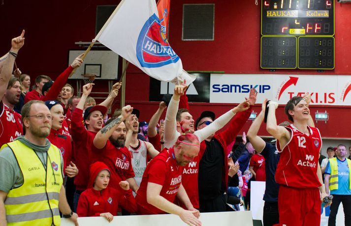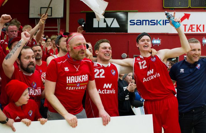 Kári Jónsson, Vilhjálmur Steinarsson og stuðningsmenn Hauka fagna í kvöld.