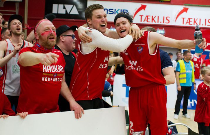 Kári Jónsson, Vilhjálmur Steinarsson og stuðningsmenn Hauka fagna í kvöld. vísir/bára