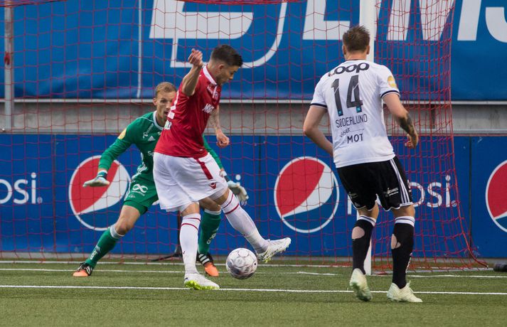 Skömmu síðar skapaðist stórhætta í teig Valsmanna. Hornspyrna rataði á kollinn á leikmanni þeirra norsku sem stýrði boltanum hárfínt framhjá marki Vals. Þar sluppu heimamenn með skrekkinn.