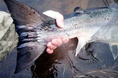 Þetta sést oft fyrst á veiðitölum frá austurbakka Hólsár sem er í raun neðsta svæðið í Eystri Rangá. Eftir heldur rólegan júlímánuð var holl að ljúka veiðum með 34 laxa sem er flott veiði. Á sama tíma er veiðin í Eystri Rangá að stíga hægt og rólega upp á við og eru núna að veiðast um það bil 40 laxar á dag. Það er greinilegt á neðri svæðunum að lax er að ganga inn af nokkrum krafti svo það er vonandi að ágústmánuður verði veiðimönnum góður þegar göngurnar fara að láta sjá sig. Stærsti laxinn sem við vitum af enn sem komið er af austurbakka Hólsár er 90 sm og er greinilega eins og myndinber með sér nýgengin í ána.
