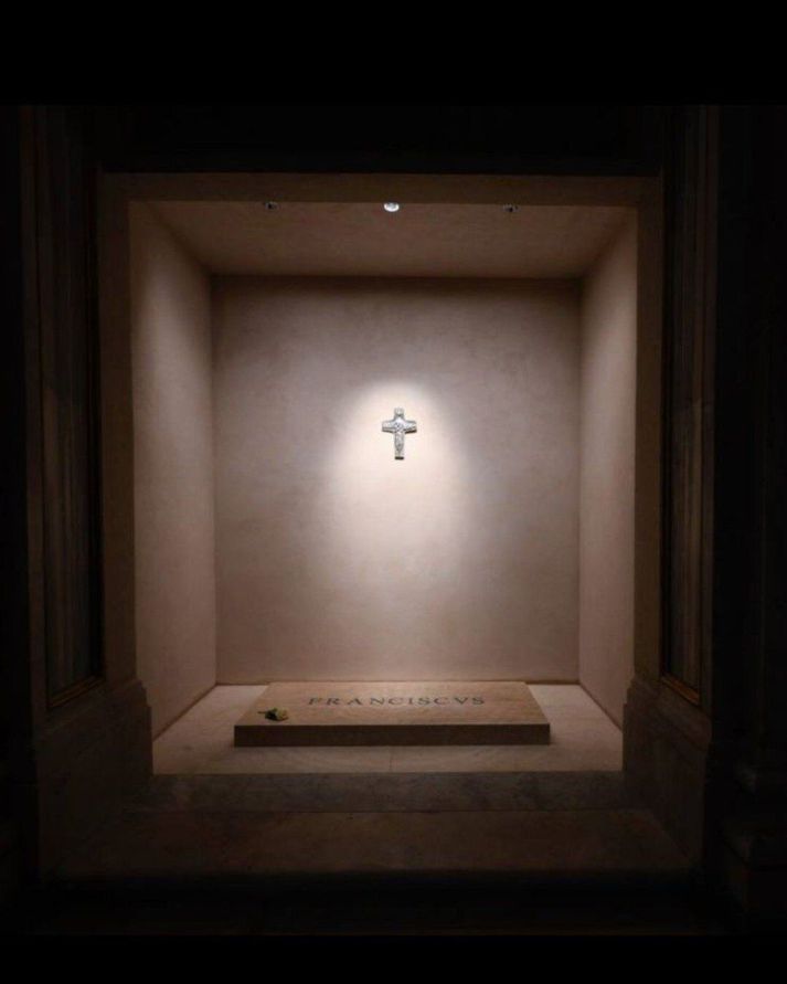 Frans páfi óskaði þess að vera grafinn í Stóru Maríukirkjunni í Róm, uppáhaldskirkjunni hans, þar sem hann baðst reglulega fyrir. Flestir forverar hans eru grafnir undir Péturskirkjunni í Páfagarði. Páfagarður birti í dag myndir af gröfinni, en búið var að leggja eina hvíta rós á legsteininn. Almenningur getur nú lagt leið sína að gröfinni, en í dag er annar dagur þriggja daga sorgarferlis kirkjunnar eftir útför páfans. Um fimmtíu þúsund manns voru viðstaddir útför páfans í gær, þar á meðal fjölmargir þjóðarleiðtogar. Um 200 þúsund manns til viðbótar voru á svæðinu við torgið þar sem útförin fór fram. Páfagarður Páfagarður Páfagarður