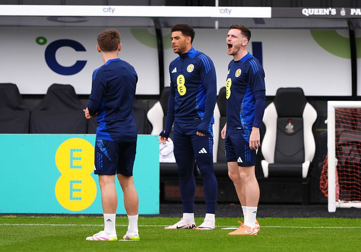 Valur Páll Eiríksson skrifar frá Glasgow Andrew Robertson er fyrirliði skoska liðsins en hann og Steve Clarke, landsliðsþjálfari, sátu fyrir svörum á sitthvorum blaðamannafundinum á Hampden Park í dag. Skoska liðið hafði fyrr um daginn æft á heimavelli hins sögufræga liðs Queen's Park, en sá völlur er við hlið þjóðarleikvangsins. Robertson var varla spurður út í annað en McTominay á fundinum og Clarke sömuleiðis spurður spjörunum úr. Það sama má segja um Arnar Gunnlaugsson, landsliðsþjálfara Íslands. Arnar var spurður af skoskum blaðamönnum um McTominay og sagði hann vera skell fyrir sig sem stuðningsmann Manchester United að horfa á eftir Skotanum til Ítalíu. McTominay með ítalska deildarbikarinn. Hann var valinn bestur í deildinni á fyrsta tímabili hans með liðinu.Elianton/Mondadori Portfolio via Getty Images McTominay flutti sig um set frá uppeldisfélaginu United til Napoli síðasta sumar. Hann hafði verið hálfgerð varaskeifa í Manchester-borg en óhætt er að segja að hann hafi fundið fjölina á Suður-Ítalíu. McTominay skoraði tólf mörk fyrir Napoli sem varð Ítalíumeistari á dögunum, var valinn bestu leikmaður tímabilsins og er gífurlega vinsæll í borginni fyrir vikið. Klippa: Andy Robertson um leikinn við Ísland Myndir af honum með vindil í kjaftinum í fagnaðarlátum í Napoli hafa vakið lukku, sem og myndir með nýkjörnum páfa sem bauð Ítalíumeisturunum til Vatíkansins. Robertson: Hann reif Serie A í sig Líkt og skoska pressan spurði Stöð 2 Sport Robertson út í framgang McTominay í viðtali á Hampden Park í dag. Robertson hafði hitað vel upp eftir að allar spurningar skosku blaðamannana á fundinum skömmu fyrir og stóð ekki á svörum. „Hann var ótrúlegur. Hann augljóslega reif Serie A í sig. Frammistaða hans var á hæsta stigi og hann á hrós skilið fyrir. Að vinna deildina er augljóslega mikilvægast en að hann sé valinn besti leikmaður deildarinnar hlýtur að vera sérstakt fyrir hann, sérlega í svona stórri deild,“ segir Robertson í samtali við Stöð 2 Sport. Robertson var hress á æfingu dagsins.Andrew Milligan/PA Images via Getty Images „Allt kredit á hann. Hann hefur verið frábær, verið geggjaður fyrir Skotland, fyrir Napoli og megi þetta halda áfram,“ bætir hann við um McTominay. Búast má við McTominay í toppstandi þegar Ísland mætir skoska liðinu á Hampden Park á morgun. Leikur Skotlands og Íslands er klukkan 18:45 annað kvöld. Leikurinn verður sýndur beint á Stöð 2 Sport og hefst útsending klukkan 18:20.