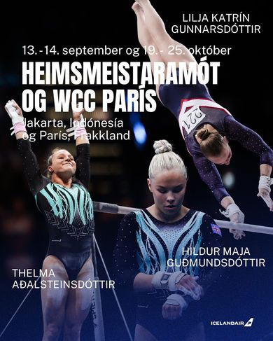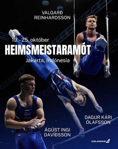 „Þeir eru búnir að hanna forrit, þannig að við getum bara verið hér á þessari eyju og gert okkar æfingar. Við tökum upp og svo eru dómarar einhvers staðar úti í heimi sem dæma þetta hjá okkur“ segir landsliðsþjálfarinn Róbert Kristmannsson. Karlalandslið Íslands á HM 2025.Fimleikasamband Íslands „Best væri náttúrulega að ferðast á öll mót, en það getur reynst kostnaðarsamt þannig að við erum að nýta þetta eins mikið og við mögulega getum. Þetta er nýtt af nálinni, búið að vera í kannski eitt og hálft eða tvö ár og við höfum tekið þátt í nokkrum svona mótum.“ Markmiðið að njóta Þrír landsliðsmenn og þrjár landsliðskonur mínu svo ferðast til Malasíu í næstu viku áður en leiðin liggur til Indónesíu þar sem heimsmeistaramótið mun fara fram, í höfuðborginni Jakarta, dagana 19. - 25. október. „Það eru allir frekar spenntir, að fara á stað sem maður myndi annars ekki ferðast til“ segir landsliðskonan Thelma Aðalsteinsdóttir. Kvennalandslið Íslands á HM 2025. Fimleikasamband Íslands „[Markmiðið] er að njóta þess að vera þarna. Það er ekkert undir þannig að við förum bara út og gerum okkar æfingar, það er alveg hægt að komast í úrslit en það eru rosalega margir að keppa þarna. Þannig að við bara gerum okkar og sjáum hvað gerist.“ Brjálað að gera en Balí bíður Samhliða fimleikaferlinum er Thelma í lyfjafræðinámi. Hún fer því beint úr verkefnaviku í háskólanum á heimsmeistaramótið í Indónesíu, en ætlar að slaka vel á eftir það. „Þetta er alveg frekar mikið og reynir mikið á hausinn, að vilja gera bæði hundrað prósent er erfitt og tekur dálítið á… Ég ætla að vera í viku á Balí eftir mótið og er mjög spennt fyrir því.“ Lilja frumsýndi í París Landsliðið keppti á heimsbikarmóti í París í Frakklandi í síðasta mánuði en þar framkvæmdi Ágúst Ingi Davíðsson stórglæsilega hringjaseríu, Atli Snær Valgeirsson var hársbreidd frá úrslitum, Hildur Maja Guðmundsdóttir framkvæmdi flotta æfingu á slá, Thelma Aðalsteinsdóttir tryllti höllina með frábærum gólfæfingum og erfiðri sláaræfingu, Lilja Katrín Gunnarsdóttir lokaði svo deginum með frumsýningu á nýrri gólfæfingu. Lilja Katrín segir betur frá nýju gólfæfingunni og markmiðum sínum á heimsmeistaramótinu í viðtalinu hér fyrir neðan. Klippa: Lilja Katrín frumsýndi nýja gólfæfingu í París