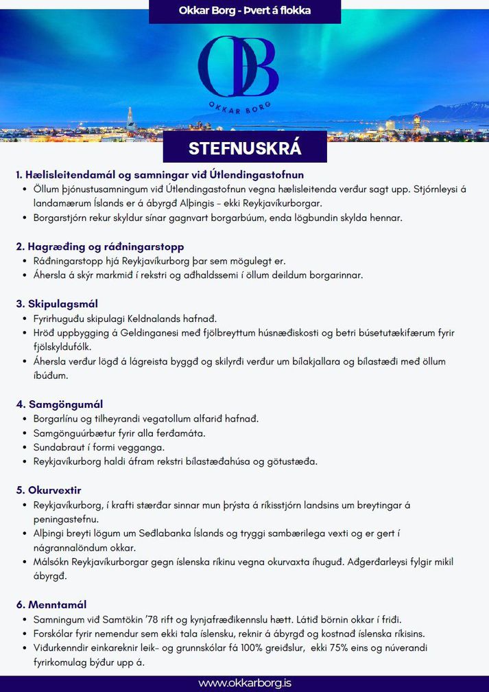 Í fréttatilkynningu, sem Sigfús Aðalsteinsson, forsvarsmaður Íslands, þvert á flokka, sendir, segir að undanfarið hafi fjölmargar áskoranir borist til forsvarsmanna félagsskaparins um að stofna stjórnmálaflokk, sem hafi að markmiði gagngerar breytingar á hælisleitendamálum og leggi áherslu á að tekið sé mark á vilja borgarbúa. „Krafan hefur verið skýr: að taka þessi mál föstum tökum og af alvöru.“ Reykjavíkurborg sé stór og mikilvæg breyta í málaflokknum, auk annarra mála sem þar séu í algjörum ólestri. Af þeim ástæðum hafi þeir tekið ákvörðun um að verða við þessari beiðni og bjóða fram í sveitarstjórnarkosningunum í Reykjavík næsta vor. Hér að neðan má sjá stefnuskrá flokksins: 160 meðmæli til að bjóða fram í Reykjavík Gengið verður til sveitarstjórnarkosninga þann 16. maí næstkomandi. Til að bjóða fram þarf að skila inn framboðslista til yfirkjörstjórnar sveitarfélagsins fyrir klukkan 12 á hádegi 36 dögum fyrir kjördag, þ.e. 10. apríl. Gögn sem þarf að skila með framboði: Tilkynning um framboð, þar sem fram koma upplýsingar um heiti stjórnmálasamtakanna. Framboðslisti, ásamt undirrituðu samþykki frambjóðenda fyrir því að fara í framboð. Tiltaka þarf nafn frambjóðenda, lögheimili, kennitölu og stöðu eða starfsheiti. Frambjóðendur þurfa að eiga lögheimili í sveitarfélaginu. Á framboðslistum þurfa að vera a.m.k. jafn mörg nöfn og kjósa á í sveitarstjórn og ekki fleiri en tvöföld sú tala. Í Reykjavík eru þetta því að lágmarki 23 og að hámarki 46. Upplýsingar um umboðsmenn listans, ásamt samþykki þeirra. Meðmæli frá kjósendum í sveitarfélaginu. Í mörgum sveitarfélögum verður rafræn meðmælasöfnun í boði. Lágmarksfjöldi meðmælenda er: í sveitarfélagi með 101–500 íbúa 10 meðmælendur, í sveitarfélagi með 501–2.000 íbúa 20 meðmælendur, í sveitarfélagi með 2.001–10.000 íbúa 40 meðmælendur, í sveitarfélagi með 10.001–50.000 íbúa 80 meðmælendur, í sveitarfélagi með 50.001 og fleiri íbúa 160 meðmælendur. Hámarkstala er tvöföld tilskilin lágmarkstala, þ.e. 320 meðmælendur í Reykjavík.