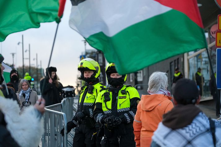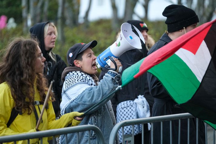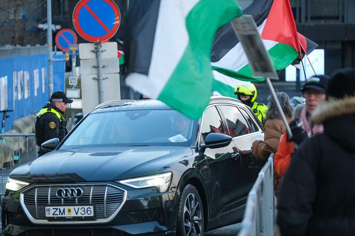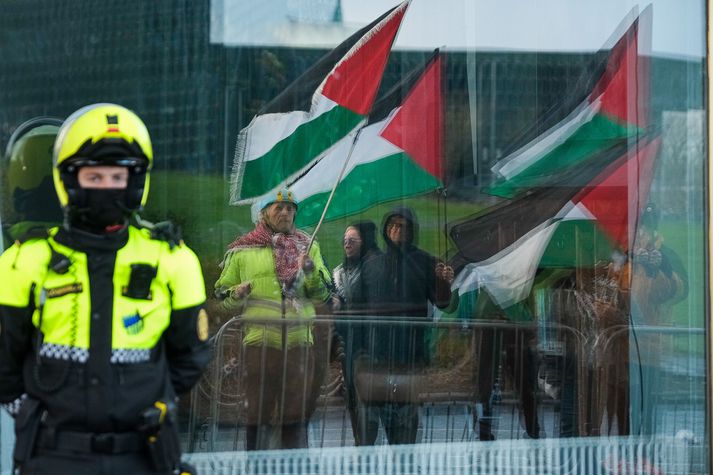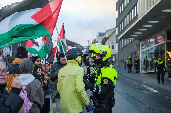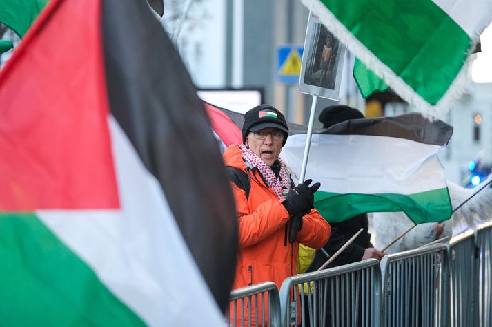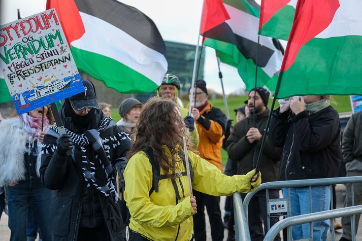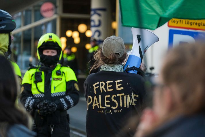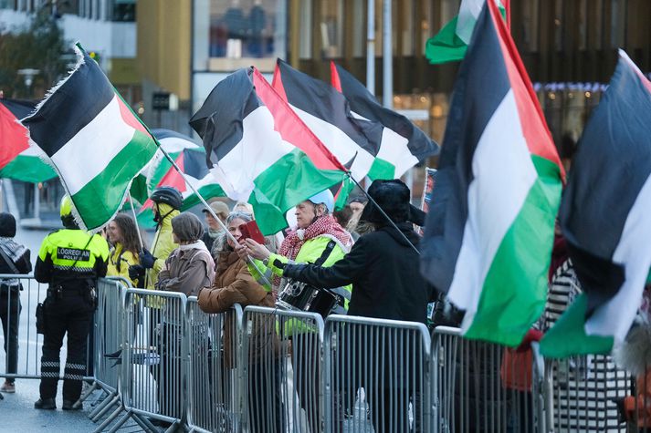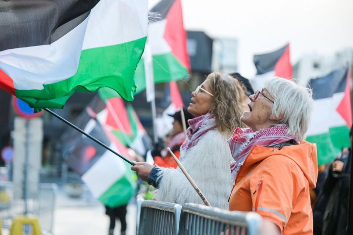 Samkvæmt skýrslu sem kom út í september hafa fjögur af fimm skilyrðum alþjóðalaga um þjóðarmorð verið uppfyllt; Ísraelsmenn hafi myrt meðlimi hóps, valdið þeim alvarlegum líkamlegum og andlegum skaða, komið á skilyrðum til að tortíma hópnum og komið í veg fyrir fæðingar. Konur og karlar mótmæla, stundum oft í viku. Vísir/Anton Brink Rúmlega 67 þúsund Palestínumenn verið drepnir í aðgerðum Ísraela. Flestir eru almennir borgarar og er áætlað að um 18 þúsund börn hafi verið drepin í aðgerðunum. Þá ríkir hungursneyð á Gasa vegna þess að Ísrael hefur meinað flutning hjálpargagna á svæðið. Sjá einnig: Tvö ár liðin frá árásum Hamas á Ísrael Samninganefndir Hamas og Ísraela eiga í óformlegum viðræðum í Sharm el-Sheikh í Egyptalandi um frið á svæðinu. Unnið er eftir friðaráætlun Donalds Trumps Bandaríkjaforseta og hófust fundarhöld síðdegis í gær. Hamas eru sagðir hafa fallist á nokkur atriði í áætluninni en önnur munu vera til umræðu á fundunum. Lögreglan hefur girt af svæðið við fund ráðherranna. Vísir/Anton Brink Trump forseti sagðist á blaðamannafundi í Hvíta húsinu í gærkvöldi vera bjartsýnn á framhaldið. Fjöldi fólks hefur í þessi tvö ár mótmælt aðgerðum Ísraela á Íslandi og kallað eftir sterkari viðbrögðum stjórnvalda. Stjórnvöld kynntu í september um aðgerðir gegn Ísrael. Fríverslunarsamningur Íslands og annarra EFTA-ríkja við Ísrael verður ekki uppfærður og tveir ísraelskir ráðherrar verða settir í farbann, sem felur í sér að þeir mega ekki ferðast til Íslands og mega ekki fara um íslenska lofthelgi. Þá verða vörur frá hernumdum svæðum Ísraela merktar, auk þess sem farið verður í aðrar aðgerðir. Palestínska fánanum er veifað við fund ráðherra. Vísir/Anton Brink Lögregla og mótmælendur eiga í samræðum. Vísir/Anton Brink Mótmælendur kalla eftir frjálsri Palestínu. Vísir/Anton Brink Hanna Katrín Friðriksson atvinnuvegaráðherra mætir til fundar. Vísir/Anton Brink