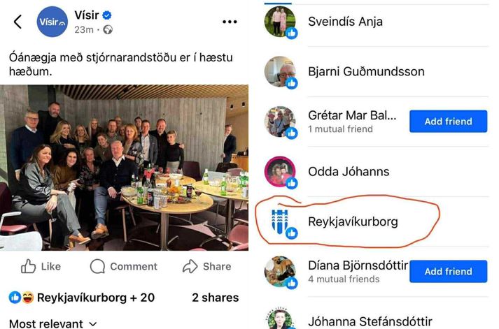Vísir greindi í gær frá niðurstöðum skoðanakönnunar, sem bentu til þess að landinn væri ekki ánægður með stjórnarandstöðuna, sem samanstendur af Sjálfstæðisflokki, Framsókn og Miðflokki. Eins og gengur var fréttinni deilt á samfélagsmiðlinum Facebook og þar fékk færslan „læk“ frá Reykjavíkurborg. Glöggir netverjar komu auga á „lækið“Skjáskot Athugulir notendur Facebook bentu Vísi á lækið og Magnea Gná Jóhannsdóttir, borgarfulltrúi Framsóknar, vakti athygli á málinu á Instagram. „Allt „eðlilegt“ við þetta læk Reykjavíkurborgar. Borgin hefur gleymt því að hún er borg allra íbúa líka þeirra sem kjósa ekki ríkisstjórnina,“ sagði hún. Mannleg mistök Eva Bergþóra Guðbergsdóttir, samskiptastjóri Reykjavíkurborgar, segir í samtali við Vísi að um mannleg mistök hafi verið að ræða. Nokkur fjöldi starfsmanna borgarinnar hafi aðgang að Facebook-aðgangi hennar og ekki sé vitað að svo stöddu hver þeirra var að verki í gær. Farið verði yfir ferla í kjölfar málsins. Þá bendir hún á að „lækið“ hafi aðeins fengið að standa í augnablik og starfsmenn hafi brugðist hratt við því. „Ég myndi segja að þetta sé mjög óheppilegt og okkur þykir þetta miður. Ég geri ráð fyrir því að þarna hafi enginn ásetningur verið að baki.“ Ekki í fyrsta skiptið Eva Bergþóra gengst við því að þetta sé ekki í fyrsta skipti sem starfsmaður „lækar“ óvart færslu á Facebook í nafni borgarinnar. Blaðamann rekur til að mynda minni til þess þegar frétt var flutt af skýrslu réttarmeinafræðings við aðalmeðferð í Gufunesmálinu svokallaða í ágúst. Þá smellti Reykjavíkurborg „læki“ á mynd af einum þeirra sem var síðar dæmdur fyrir manndráp í málinu og efnisgreinina „Réttarmeinafræðingur, sem framkvæmdi réttarkrufningu á Hjörleifi Hauki Guðmundssyni, sagði dánarorsökina hafa verið skaða á öndunarfærum Hjörleifs og að ofkæling hafi ekki bætt úr skák.“ Telja verður að mistök hafi verið gerð þegar þessi færsla var „lækuð“ í nafni borgarinnar.Skjáskot