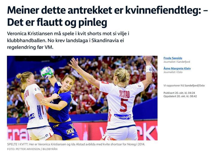 Norska handboltakonan Veronica Kristiansen er í hópi margra íþróttakvenna sem vilja ekki sjá hvítar stuttbuxur í sinni íþrótt. Kristiansen er jafnframt í hópi þeirra kvenna sem eru þvingaðar í að spila þessum óvinsælu hvítu stuttbuxum. Í sömu stöðu í hverjum mánuði „Ég hata hvítar stuttbuxur. Ég skil svo sem alveg að þær líti vel út. Við erum aftur á móti konur og lendum í ákveðnum kringumstæðum í hverjum mánuði. Það er því ekki gaman fyrir okkur að spila í hvítum buxum,“ sagði Veronica Kristiansen við NRK. Umræðan um hvítu stuttbuxurnar í kvennaboltanum hefur verið lengi í gangi. Margar þjóðir og mörg félög hafa hlustað á konurnar en svo er ekki staðan í handboltanum. Skiptu yfir í hvítar stuttbuxur Kristiansen er nýkomin til baka eftir að hafa eignast sitt annað barn í janúar. Hún spilar með ungverska liðinu Györ sem hefur spilað þar í grænum buxum en félagið skipti nýverið yfir í hvítar buxur. „Við höfum sagt það svo lengi að við viljum ekki spila í hvítum buxum en það fór ekki lengra en það,“ sagði Kristiansen. „Fyrir mig sjálfa þá er þetta vandræðalegt og niðurlægjandi. Tíðahringurinn er eitthvað sem þú stjórnar ekki. Gerið þið það, í burtu með þessar hvítu stuttbuxur,“ sagði Kristiansen. Eitthvað sem enginn vill Norski landsliðsfyrirliðinn Henny Reistad tekur undir þetta. „Ég er ekki aðdáandi hvítu stuttbuxnanna heldur. Ef það er eitthvað sem enginn vill, þá á að hlusta á það. Þetta getur verið mjög óþægilegt fyrir okkur,“ sagði Henny Reistad. Frétt hjá norska ríkisútvarpinu um málið. NRK Sport Nú hafa handboltasambönd Noregs, Svíþjóðar og Danmerkur líka skrifað saman bréf og sent Alþjóðahandboltasambandinu, IHF. Samböndin heimta reglubreytingu hjá IHF fyrir HM kvenna sem fer fram í Þýskalandi og Hollandi. Öll lið þurfa að vera bæði með ljósar og dökkar stuttbuxur í sínu búningasetti. Blæðir í gegnum buxurnar „Okkar reynsla segir það að sú regla að þurfa að vera í ljósum stuttbuxum sé tákn um kvenhatur,“ sagði Randi Gustad, forseti norska sambandsins. „Óöryggið sem fylgir því hvort að það blæði í gegnum stuttbuxurnar þínar eða ekki er mjög óþægilegt fyrir konur í handbolta,“ sagði Gustad.