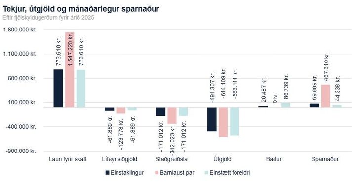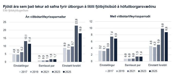 Getur tekið einstæða foreldra allt að átján ár að safna fyrir íbúð Hólmfríður Gísladóttir skrifar 23. október 2025 09:57 Það getur reynst einstæðum foreldrum á leigumarkaði afar erfitt að komast í eigið húsnæði. Getty Það getur tekið einstaklinga á leigumarkaði ellefu ár að safna fyrir útborgun í litla íbúð á höfuðborgarsvæðinu og átján ár fyrir einstæða foreldra. Þetta segir í nýrri mánaðarskýrslu Húsnæðis- og mannvirkjastofnunar. Þar segir einnig að fyrir barnlaust par tæki það tæp tvö ár. Miðað við forsendur greiningar HMS myndi tíminn styttast nokkuð ef séreignarsparnaði væri ráðstafað til kaupanna en þá myndi það taka einstakling sjö ár að safna fyrir útborgun, einstætt foreldri tæp níu ár og barnlaust par eitt og hálft ár. HMS „Líkt og sjá má á myndinni að ofan tekur það allar fjölskyldugerðir lengri tíma að safna fyrir útborgun í dag en það tók þær árin 2017, 2019 og 2021. Þetta skýrist að hluta til af því að hámarksveðsetningarhlutfall fyrstu kaupenda var lækkað úr 90% niður í 85% árið 2022. Fyrstu kaupendur þurfa því að safna hærra hlutfalli af kaupverði íbúða til þess að geta keypt sér íbúð í dag samanborið við fyrir 2022,“ segir í skýrslu HMS. Þá hafði það ekki síður áhrif hversu mikið húsnæðisverð hefur hækkað og að laun hafi ekki náð að halda í við verðhækkanir á fasteignamarkaði. Í töflunni hér fyrir neðan má sjá þær forsendur sem miðað er við. HMS Útgjöld samanstanda af neysluútgjöldum og húsaleigu og þá er miðað við 40 til 70 fermetra íbúð fyrir einstakling en 60 til 90 fermetra íbúð fyrir einstætt foreldri og barnlaus hjón. Gert er ráð fyrir að einstaklingar fái húsnæðisbætur og einstæð foreldri húsnæðis- og barnabætur. „Miðað við framangreindar forsendur má áætla að einstaklingar geti lagt um 70 þúsund krónur til hliðar á mánuði, barnlaus pör um 467 þúsund krónur og einstæð foreldri einungis 44 þúsund krónur.“ Áætlað verð á fermetrann eru 851 þúsund krónur. Hér má finna skýrslu HMS. Fasteignamarkaður Húsnæðismál Fjármál heimilisins Börn og uppeldi Mest lesið Heimilin þurfi að undirbúa sig fyrir að það reyni á svigrúm þeirra Neytendur Þrír Kaupþingsstjórar sektaðir í Lúxemborg eftir fimmtán ára málaferli Viðskipti erlent Fasteignamarkaðurinn „kaupendamarkaður“ að mati fasteignasala Viðskipti innlent Getur tekið einstæða foreldra allt að átján ár að safna fyrir íbúð Viðskipti innlent Áföll í vinnu: Erfitt að sinna vinnu og jafnvel heimilishaldi Atvinnulíf Kæra FIFA fyrir miðasölubrask fyrir HM á næsta ári Viðskipti erlent Seldu fyrir 634 milljónir og græddu 182 Viðskipti innlent Svona lögðu Kínverjar framtíðina undir sig Viðskipti erlent Tengiltvinnari fyrir taugatrekkta Samstarf Finnur þægilegu heimatilfinninguna þegar hann lendir í Keflavík Atvinnulíf Fleiri fréttir Bara tala kynnti „Bare si det“ til leiks í Noregi Getur tekið einstæða foreldra allt að átján ár að safna fyrir íbúð Fasteignamarkaðurinn „kaupendamarkaður“ að mati fasteignasala Hagnaður minnkar um 1,5 milljarða milli ára Skynjar kvíða og ótta meðal starfsmanna Gengi Eimskips lækkar vegna bilunarinnar Fleiri hundruð kröfur og líklegt að óeðlilegum greiðslum verði rift Seldu fyrir 634 milljónir og græddu 182 Selja Adalvo og stjórnandi frá Alvotech fylgir Hanna María nýr forstöðumaður hjá ELKO Úrvinnslusjóður svarar Sorpu Eigandi Remax ákærður fyrir markaðsmisnotkun Grunnlán nær nú aðeins til helmings kaupverðs Íslandsbanki bætist í hópinn og gerir hlé á verðtryggðum lánveitingum Skipti bús Magnúsar tekin upp sextán árum frá þroti Ragnhildur til Datera Lagaleg óvissa og kaupendur byrjaðir að fá nei frá bankanum Steypti ég mér í algjöra glötun með lántökunni fyrir þremur árum? Lánveitendum vex Vaxtamálið í augum Gera hlé á veitingu verðtryggðra íbúðalána Gætu þurft að draga úr framleiðslu á Grundartanga Boeing 777-fraktþotur bætast í flota Atlanta Nathan & Olsen og Ekran verða Nathan Þórunn seld og tuttugu sagt upp Telja menningarframlag vinna gegn yfirlýstum tilgangi sínum Flugumferðarstjórar verði að sætta sig við sömu launahækkanir og aðrir Segir ótækt að fámennur hópur geti lokað landinu Hefur áhyggjur af stöðu Sýnar og boðar fjölmiðla til samráðs Nokkrum sagt upp eftir afkomuviðvörun Sýnar Origo kaupir Kappa Sjá meira