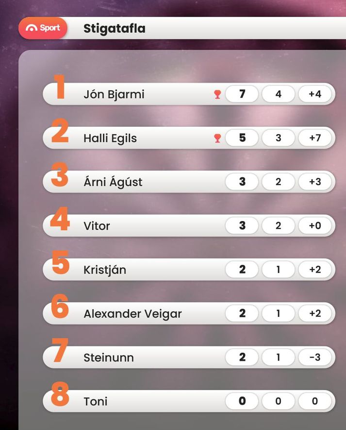 „Stressið, spennan, vá! Þetta var æðislegt,“ sagði Halli í viðtali eftir keppnina sem sjá má hér að neðan. Klippa: Halli Egils bestur í Grindavík Adrenalínið var á fullu hjá Halla sem var vel studdur og mátti ítrekað heyra sungið: „Búnt á skenkinn, Halli Egils á vegginn“ kyrjaði hópur manna í Kvikunni, þar sem mótið fór fram í beinni útsendingu á Sýn Sport. „Maður vill hafa hávaðann á bakvið sig og söngvana. Þetta er æðislegt,“ sagði Halli. Stórbrotin frammistaða: „Ég gerði bara engin mistök“ Halli sýndi bestu frammistöðu sem sést hefur í sögu Úrvalsdeildarinnar og sópaði Árna Ágústi Daníelssyni út í úrslitunum með meðalskor upp á 90 stig og meistaraleg útskot. „Ég gerði bara engin mistök. Það gekk allt upp hjá mér. Árni er erfiður andstæðingur. Hann er búinn að hafa tak á mér og vann mig [á föstudaginn] 7-3. En núna tók ég á hann og svo á ég hann í fyrsta leik á síðasta kvöldinu í undankeppninni,“ sagði Halli. Áður hafði hann unnið Halla Birgis 3-2 í átta manna úrslitum og sópað Jóni Bjarma Sigurðssyni, sigurvega fyrsta undankvöldsins, í undanúrslitum. „Eiginlega keppni í heppni“ „Þetta er svo stutt format. Best af fimm. Þetta er eiginlega bara keppni í heppni. Svipað og ef við myndum spila körfuboltaleiki 2x10 mínútur. Ég er mjög ánægður,“ sagði Halli Egils en viðtalið við hann og frammistöðu hans í úrslitunum má sjá hér að ofan. Hver keppandi tekur þátt í tveimur undankvöldum og nú er tveimur kvöldum af fjórum lokið. Því hafa sumir keppendur þegar lokið sinni undankeppni, aðrir keppt á einu kvöldi og enn aðrir eiga eftir að stíga á stokk. Átta efstu komast svo áfram og eiga möguleika á að vinna titilinn. Þetta eru átta efstu eftir tvö undankvöld af fjórum. Jón Bjarmi er efstur með sjö stig en er búinn með bæði undankvöld sín líkt og Steinunn. Taflan sýnir stig, unna leiki og +/- í leggjum.