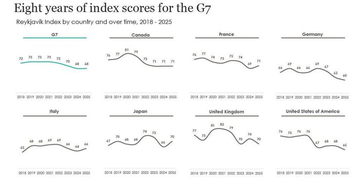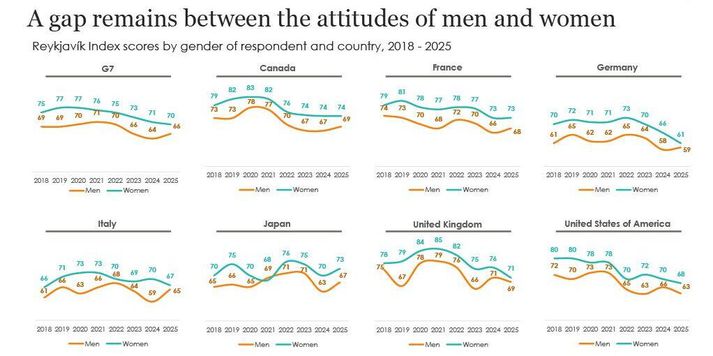 Þetta má lesa úr vísitölunni Reykjavik Index for Leadership 2025-2026 sem gefin var út í dag. Henni er ætlað að meta samfélagsleg viðhorf einstaklinga til leiðtogahlutverka karla og kvenna í 23 ólíkum starfsgreinum. Þar eru 100 stig sögð endurspegla að allt samfélagið telji konur og karla jafn hæf til að sinna leiðtogahlutverkum á ólíkum sviðum í samfélaginu. Vísitalan er gefin út árlega og var birt í dag á Heimsþingi kvenleiðtoga, Reykjavík Global Forum, sem fram fer í Hörpu. Þróunin í G7-ríkjunum frá árinu 2018. 100 stig eru sögð endurspegla að allt samfélagið telji konur og karla jafn hæf til að sinna leiðtogahlutverkum á ólíkum sviðum í samfélaginu.Reykjavík Global Forum Viðhorf til kvenna í leiðtogastörfum í G7-ríkjunum Kanada, Frakklandi, Þýskalandi, Ítalíu, Japan, Bretlandi og Bandaríkjunum mælist nú 68 stig líkt og árið í fyrra. Þar áður sást lækkun en á árinu 2018 mældust G7-ríkin með 72 stig á kvarðanum og hafa mest verið með 73 stig. Þetta kemur fram í tilkynningu frá Reykjavík Global Forum. Viðhorf versnað meðal ungs fólk í Bandaríkjunum og Þýskalandi Mælt viðhorf til kvenna í leiðtogastörfum í Þýskalandi og Bandaríkjunum hefur versnað, sérstaklega meðal ungs fólks á aldrinum 18 til 34 ára. Á sama tíma hefur viðhorf batnað í Japan og Ítalíu sem bendir til þess að fleiri íbúar þar telji konur og karla jafn hæf til að gegna forystu nú en árið á undan, að sögn Reykjavík Global Forum. Munur mælist á afstöðu karla og kvenna í G7-ríkjunum. Afstaða karla er hér sýnd með brúnum lit og afstaða kvenna í grænu.Reykjavík Global Forum Viðhorf batnað í Kenía og Nígeríu Annars staðar hefur viðhorf til kvenna í leiðtogastöðum batnað milli ára. Til að mynda hefur Kenía farið úr 52 stigum í 56 og Nígería úr 57 stigum í 59. Vísitalan er þróuð af alþjóðlega rannsóknarfyrirtækinu Verian í samstarfi við Reykjavík Global Forum. Hún byggir á svörum úr könnun sem er lögð fyrir 1.000 manns í hverju ríki á aldrinum 18 til 65 ára. „Kynslóðamunur er mjög sýnilegur í niðurstöðunum, yngra fólk telur síður kynin jafn hæf til forystu en foreldrar þeirra. Konur meta konur almennt hæfari í leiðtogastörf en karlar, en bæði kynin mæta vissum menningarlegum hindrunum á ákveðnum sviðum. Karlar eru taldir síður hæfir til forystu á sviði umönnunar barna og konur síður hæfar að sinna leiðtogahlutverki á sviði varnar- og öryggismála, verkfræði og geimvísinda,“ segir Michelle Harrison, forseti Verian Group, í tilkynningu. Hanna Birna Kristjánsdóttir, stofnandi og stjórnarformaður Reykjavík Global Forum.Vísir/Vilhelm Hanna Birna Kristjánsdóttir, stofnandi og stjórnarformaður Reykjavík Global Forum, segir að mælikvarðinn endurspegli átta ára samfellda gagnasöfnun. „Viðhorf fólks innan samfélaga breytast hægt en örugglega, og Reykjavík Index veitir vissa yfirsýn sem gerir okkur kleift að sjá bæði í hvaða átt og á hvaða hraða breytingarnar eiga sér stað. Þótt Ísland standi enn efst samkvæmt vísitölunni bendir hún á að jafnvel hér á heimavelli hafi einkunnin lækkað, úr 91 árið 2022 í 86 í ár. Það sýnir svart á hvítu að árangur í jafnréttismálum er aldrei tryggður og má aldrei telja sjálfgefinn. Framfarir krefjast stöðugrar athygli og pólitísks vilja, jafnvel á Íslandi,“ segir Hanna Birna í tilkynningu.