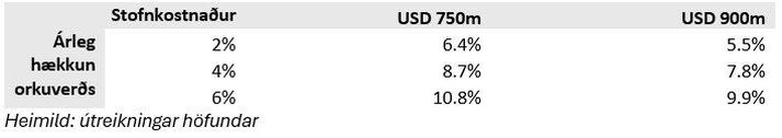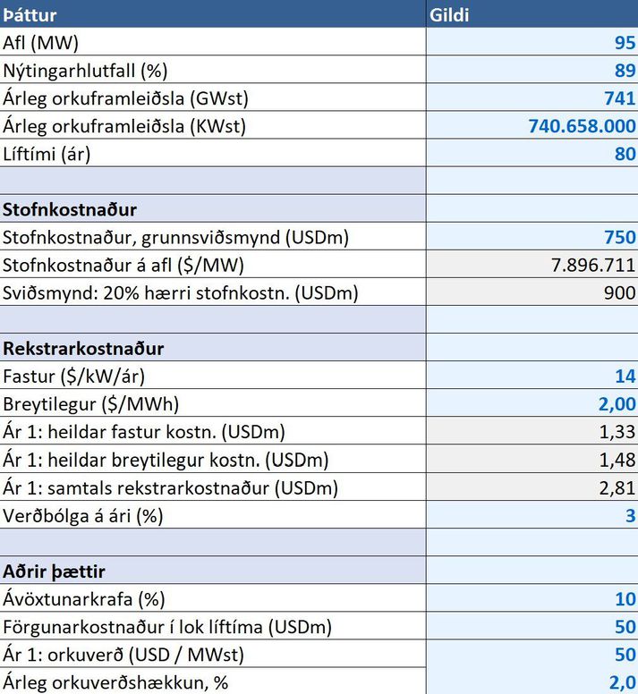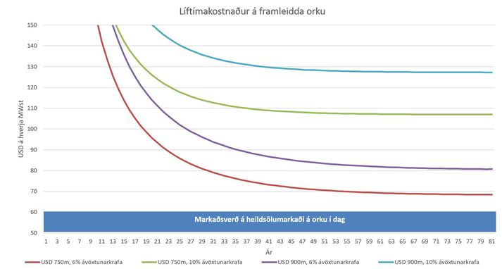 Hvammsvirkjun er fyrirhuguð virkjun Landsvirkjunar í Þjórsá, neðan við Búrfellsstöð. Fyrirhugað uppsett afl er 95MW og metin orkuframleiðsla á ári í kringum 740 GWst. Blásið hefur um virkjunaráformin (sjá t.d. hér og hér) og nýlega féll gerðardómur í máli tengdu virkjuninni. Í dómnum var fjallað um endurgjald fyrir vatnsréttindi sem Landsvirkjun skal borga íslenska ríkinu. Burtséð frá því hvað endurgjaldið var ákveðið lágt (0,85% af stofnkostnaði Hvammsvirkjunar, sem vekur upp spurningar um hvort íslenska ríkið sé í raun að niðurgreiða virkjunina) þá er það stofnkostnaðarmatið sjálft sem er áhugavert því það vekur upp alvarlegar spurningar um hvort Hvammsvirkjun sé arðbær fjárfesting. Hvað kostar Hvammsvirkjun? Tæpa 100 milljarða. Í gerðardómnum (sem því miður hefur ekki enn verið birtur á netinu) segir í 219. málsgrein (feitletrun bætt við): Með hliðsjón af framangreindu er það mat gerðardómsins að rétt sé að miða við hlutfallið 0,85% af stofnkostnaði Hvammsvirkjunar sem þannig verður lagt til grundvallar. Sóknaraðili hefur reiknað stofnkostnað Hvammsvirkjunar sem 84.000.000.000 króna miðað við verðlag í ágúst 2022. Á þeim grundvelli verður endurgjald fyrir afnot vatnsréttinda varnaraðila í 65 ár vegna Hvammsvirkjunar 714.000.000 krónur. Þá fjárhæð ber að framreikna til gjalddaga sem slegið er föstu af hálfu gerðardómsins að sé 90 dögum eftir útgáfu virkjunarleyfis vegna Hvammsvirkjunar. Þar sem nefnd fjárhæð stofnkostnaðar miðast við verðlag í ágúst 2022 ber að framreikna hana miðað við breytingar á byggingarvísitölu frá þeim tíma til gjalddaga en í ágúst var vísitalan 108,3 stig. Eðlilegt er að miða við þá vísitölu þar sem útreikningar sóknaraðila hafa tekið mið af henni auk þess sem þessi vísitala var lögð til grundvallar í fyrirliggjandi fordæmum,… 84 milljarða króna stofnkostnaðurinn árið 2022 er nú orðinn tæpir 100 milljarðar króna m.v. núverandi byggingarvísitölu. Svo það er það sem Hvammsvirkjun kostar. Og það er þessi hái stofnkostnaður sem gerir Hvammsvirkjun, að öllum líkindum, óarðbæra. Í stuttu máli Það er best að gefa þér niðurstöðuna strax lesandi góður: Líftímakostnaður orku frá Hvammsvirkjun er of hár til að hún sé samkeppnishæf við marga aðra orkugjafa. Ávöxtun fjárfestingar Landsvirkjunar í Hvammsvirkjun er of lág að gefnum raunhæfum forsendum. Nokkrir reikningar Líftímakostnaður er sá kostnaður sem fellur til vegna einhvers mælt yfir allan líftíma viðkomandi vöru eða þjónustu. Líftímakostnaður er, í stuttu máli, stofnkostnaður þess sem byggt er til þess að framleiða eitthvað að viðbættum (núvirtum) rekstrarkostnaði. Líftímakostnaður bíls fyrir heimilið er kostnaðurinn við að kaupa bílinn að viðbættum rekstrarkostnaði (rafmagnið, bensínið, tryggingarnar, o.s.frv.) uns bílnum hefur verið fargað (förgunarkostnaður er meðtalinn í líftímakostnaði). Í tilfelli virkjana er líftímakostnaður reiknaður á hverja orkueiningu sem framleidd er. Hann er venjulega mældur í USD á hverja megawattstund (USD/MWst) eða kílówattstund (USD/kWst). Alþjóðlegur samanburður er gerður hér síðar í greininni við aðra orkuöflunarkosti og því verður líftímakostnaður Hvammsvirkjunar hér reiknaður í USD/MWst. Langmest (ca. 90%) af líftímakostnaði vatnsaflsvirkjana fellur til við stofnkostnað, þ.e. þegar þær eru byggðar. ISK 100 milljarða stofnkostnaður Hvammsvirkjunar eru um USD 750 milljónir. Aðrar forsendur, þ.m.t. árlegur rekstrarkostnaður (uppsafnaður núvirtur rekstrarkostnaður er, aftur, aðeins um 10% af líftímakostnaði vatnsaflsvirkjana) má sjá í eftirfarandi töflu. Tafla 1: Grunnforsendur Hvammsvirkjunar Heimild: Landsvirkjun, höfundur Það er góð regla þegar fjárfestingar eru skoðaðar að gera nokkrar sviðsmyndir. Hér verður stuðst við fjórar sviðsmyndir: Grunnsviðsmynd: USD 750m stofnkostnaður, 10% óvoguð ávöxtunarkrafa Bjartsýn sviðsmynd: USD 750m stofnkostnaður, 6% óvoguð ávöxtunarkrafa 20% hærri stofnkostnaður (USD 900m), 6% óvoguð ávöxtunarkrafa 20% hærri stofnkostnaður (USD 900m), 10% óvoguð ávöxtunarkrafa Það skal tekið fram að 6% er lág óvoguð ávöxtunarkrafa. Til samanburðar eru 30 ára bandarísk ríkisskuldabréf í kringum 4,7% en þeim fylgir langtum minni áhætta en hugsanleg fjárfesting í Hvammsvirkjun. Auðvelt væri að finna fjárfestingarkosti, t.d. í fasteignum, sem eru með minni áhættu en Hvammsvirkjun en gæfu af sér hærri ávöxtun en 10% (óvogað). Því er eðlilegt að ætli Landsvirkjun að finna fjármagn, sem ekki er niðurgreitt af hinu opinbera, til að fjárfesta í Hvammsvirkjun verði virkjunin að skila a.m.k. 10% ávöxtun á fest fjármagn (óvogað). Séu lán tekin til að fjármagna fjárfestinguna eykst áhættan enn frekar og ávöxtunarkrafan þar með líka. Eftir sem áður er 6% ávöxtunarkrafa notuð hér til að sýna m.a. hversu óraunhæf fjárfestingin í raun er. Næsta mynd sýnir hvernig líftímakostnaður orkunnar frá Hvammsvirkjun þróast eftir því sem árin líða. Líftímakostnaðurinn fellur hratt í byrjun því eftir því sem árin líða dreifist stofnkostnaðurinn yfir á fleiri ár. Í stuttu máli er bjartsýna sviðsmyndin (USD 750 milljóna stofnkostnaður, 6% óvoguð ávöxtunarkrafa) að skila líftímakostnaði upp á ca. USD 70/MWst. Versta sviðsmyndin sem hér er sett upp (USD 900m stofnkostnaður, 10% ávöxtunarkrafa) skilar líftímakostnaði upp á nærri USD 130/MWst. Mynd 1: metinn líftímakostnaður Hvammsvirkjunar eftir stofnkostnaði og ávöxtunarkröfu Heimild: útreikningar höfundar Er þetta hár líftímakostnaður? Já, það er hann. Það má t.d. bera þennan líftímakostnað við 