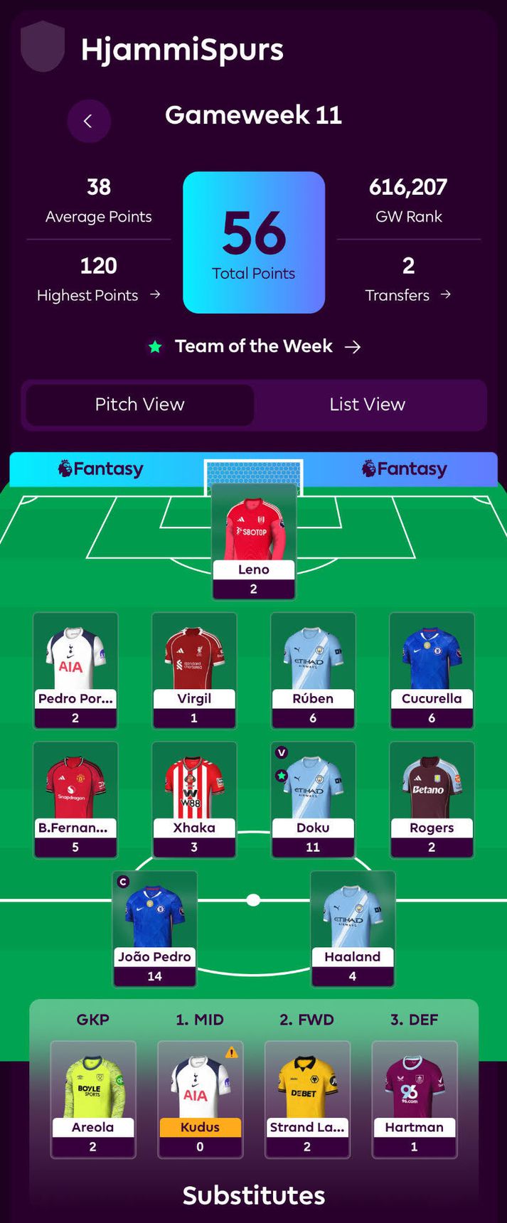 Hjammi með mikla reynslu: „Kannski ekkert sérstakt í tuttugu tilraunum“ Sindri Sverrisson skrifar 14. nóvember 2025 17:46 Hjammi var með Joao Pedro sem fyrirliða í síðustu umferð og það skilaði 14 stigum. Samsett/Getty/Sýn Sport Skemmtikrafturinn Hjálmar Örn Jóhannsson er þrautreyndur fantasy-spilari og viskubrunnur um ensku úrvalsdeildina í fótbolta. Strákarnir í Fantasýn hlaðvarpinu rýndu í liðið hans og vilja að hann nýti landsleikjahléið vel til breytinga. Albert Þór Guðmundsson var með einn besta fantasy-spilara landsins í vetur, Gunnar Ormslev, sem gest í síðasta þætti Fantasýn og má hlusta á þáttinn hér að neðan. Í þættinum var lið Hjálmars, eða Hjamma, sérstaklega tekið fyrir en þessi gallharði Spursari ku vera á sínu tuttugasta tímabili í leiknum: „Hann nefndi við mig að hann hefði ekki náð neitt sérstökum árangri. Ég held að besta sætið hans hingað til sé sirka 150 þúsund í heiminum. Það er svo sem allt í lagi en kannski ekkert sérstakt í tuttugu tilraunum. Magn umfram gæði,“ sagði Albert léttur. Lið Hjamma í síðustu umferð í fantasy-leik ensku úrvalsdeildarinnar.fantasy.premierleague.com „Ég vil hvetja hann til að nota þessa chipsa sem hann á. Jafnvel íhuga wild card í þessari viku þó að síðasta hafi gengið vel,“ sagði Albert og var greinilega ekkert sérstaklega hrifinn af síðustu viðskiptum Hjamma. „Það er ekki hægt að sitja á þessum chipsum endalaust. Það þarf að fara að nota eitthvað af þessu og ég myndi nota wild card,“ sagði Albert en hægt er að hlusta á umræðuna hér að ofan og er rætt um lið Hjamma eftir 1:19:30 klukkustund af þættinum. Hægt er að hlusta á alla þætti Fantasýn með því að smella hér. Hægt er að skrá sig í draumadeildarleik ensku úrvalsdeildarinnar með því að smella hér. Enski boltinn Fantasýn Mest lesið Rekinn úr húsi í Breiðholtinu en fyrst fór ruslatunnan á flug Körfubolti „Ég skulda tannlækninum afsökunarbeiðni“ Sport Heimir um Ronaldo: „Hans kjánaskapur að ráðast á okkar mann“ Fótbolti Flutt á sjúkrahús eftir höfuðhögg í Meistaradeildinni Fótbolti „Kom fyrstur út úr leikmannagöngunum með augnaráð sem hefði getað drepið“ Fótbolti Mikil spenna í Færeyjum enda HM-sætið enn möguleiki Fótbolti „Ég var bara millimetrum frá því að lamast“ Sport Notaði eiginmanninn sem héra og vann sitt fyrsta maraþon Sport Mark Cuban mættur aftur Körfubolti Sögulegt bardagakvöld á Ásbrú: „MMA er ekki ólöglegt“ Sport Fleiri fréttir Hjammi með mikla reynslu: „Kannski ekkert sérstakt í tuttugu tilraunum“ Stefnir Manchester United vegna „kynferðislegs og líkamlegs ofbeldis“ Fantasýn: Bara nítján stigum frá toppnum á Íslandi Segir Liverpool „fá ekkert“ út úr því að nota Mo Salah svona Fyrrum United-maður sakaður um að hrækja á stuðningsmenn Úlfarnir komnir með nýjan þjálfara „Ráðafólk fótboltans verður að hlusta á áhyggjur kvenna“ Yfirmaður dómara segir það rétt að dæma markið af Liverpool Aftur brotist inn til Sterling en núna var hann heima „Menn beita öllum brögðum“ Er framherji Brentford óvænt að banka á landsliðsdyrnar hjá Brasilíu? Nagelsmann um Wirtz: Liðsfélagarnir í Liverpool gætu nú aðeins hjálpað honum Kaldasta fagnið í bransanum orðið að vörumerki Liverpool kvartar í dómarasamtökunum „Algjört bull“ eða „rétt ákvörðun“? Mætti sínu gamla liði í fyrsta sinn og skoraði tvö sjálfsmörk Hjörvar sagði González fá símtal: „Ef það gerist þá verður það frábært“ Van Dijk við Hjörvar: „Hvað er sérfræðingur?“ Rooney og Schmeichel fundu til með Liverpool: „Þetta er slæm ákvörðun“ Fjögur mörk, varið víti og Villa upp í sjöunda sætið Öruggur sigur City Færðu auglýsingaskiltin til að trufla löng innköst Arsenal Sjáðu alla dramatíkina og mörkin í enska í gær Sanngjarn heimasigur Tveir í röð hjá West Ham og þægilegt hjá Everton Dramatík í uppbótartíma Amorim fannst vanta hugrekki til að klára leikinn Stefán Teitur og félagar upp í þriðja sætið Tvö mörk í uppbótartíma í ótrúlegum leik Boro bannar Edwards að stýra liðinu í dag Sjá meira