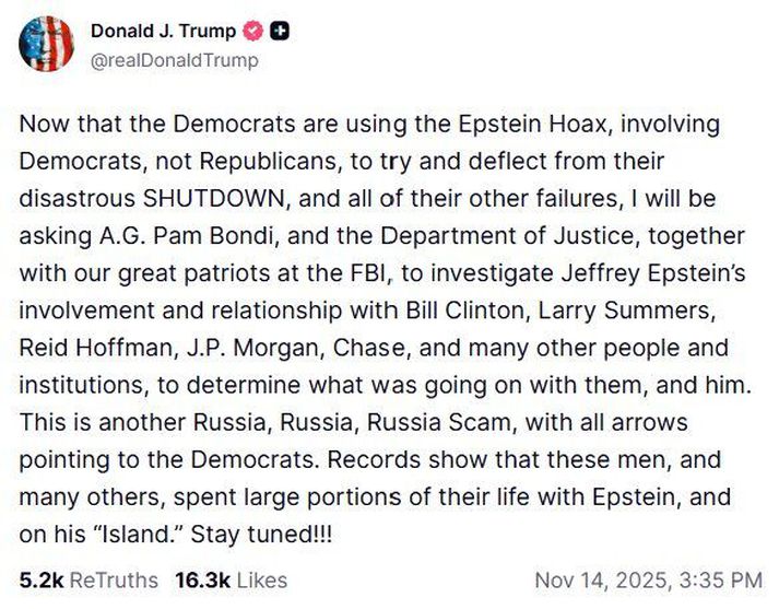 Rannsaka tengsl Epstein við Clinton Jón Ísak Ragnarsson skrifar 14. nóvember 2025 22:25 Donald Trump Bandaríkjaforseti og Pam Bondi dómsmálaráðherra. Getty Dómsmálaráðuneyti Bandaríkjanna hefur fallist á beiðni Donalds Trump Bandaríkjaforseta um að rannsaka tengsl barnaníðingsins Jeffrey Epstein við nokkra háttsetta Demókrata, en þar á meðal eru Bill Clinton fyrrverandi Bandaríkjaforseti. BBC greinir frá, en Donald Trump greindi frá því á samfélagsmiðlum í dag að hann hefði beðið Pam Bondi, dómsmálaráðherra Bandaríkjanna, og bandarísku alríkislögregluna (FBI), um að hefja rannsókn á samskiptum og tengslum Epstein við meðal annars Clinton. Bondi greindi svo frá því á samfélagsmiðlum að hún hefði beðið Jay Clayton, lögfræðing ráðuneytisins, að leiða rannsóknarteymið og að ráðuneytið myndi ráðast í verkefnið undireins og sinna því eins vel og hægt væri. Bill Clinton hefur sjálfur harðlega neitað því að hann hafi vitað af hrottalegum glæpum Epsteins. Mál Jeffrey Epstein hefur aftur verið í kastljósinu í vikunni eftir að meira en 20 þúsund skjöl varðandi rannsókn málsins voru gerð opinber, en þar var nokkrum sinnum minnst á Donald Trump Bandaríkjaforseta. Auk Clintons stendur til að rannsaka sérstaklega tengsl Epstein við bankana JP Morgan og Chase, fyrrverandi fjármálaráðherra Bandaríkjanna Larry Summers, og Reid Hoffman, stofnanda LinkedIn, en hefur verið áhrifamikill fjárhagslegur bakhjarl Demókrataflokksins. Talsmaður JP Morgan & Chase sagði í yfirlýsingu að bankinn harmaði tengsl sín við Epstein og bætti því við að bankinn hefði ekki átt neinn þátt í glæpum hans. Mál Jeffrey Epstein Donald Trump Tengdar fréttir Sagði Trump hafa varið klukkustundum með fórnarlambi sínu Í áður óbirtum tölvupósti sem Jeffrey Epstein sendi Ghislaine Maxwell árið 2011, velti hann vöngum yfir því af hverju Donald Trump, núverandi forseti Bandaríkjanna, hafi aldrei verið nefndur á nafn í þeim rannsóknum sem beindust að Epstein. Hann sagði að Trump hefði varið mörgum klukkutímum með konu sem Demókratar í Stjórnskipunar- og eftirlitsnefnd fulltrúadeildar Bandaríkjaþings skilgreina sem eitt af fórnarlömbum Epsteins. 12. nóvember 2025 14:43 Sögð ætla að leita á náðir Trumps Ghislaine Maxwell ætlar að biðja Donald Trump, forseta Bandaríkjanna, um að milda dóm hennar og sleppa henni úr fangelsi. Að óbreyttu á hún að sitja inni til loka ársins 2037 en Demókratar í dómsmálanefnd fulltrúadeildarinnar hafa sent Trump bréf og sagt honum að þetta standi til. 10. nóvember 2025 12:22 Mest lesið Byrjað að daðra við rasíska samsæriskenningu Innlent Þrír látnir eftir að rútu var ekið á biðskýli Erlent Helgi Pétursson er látinn Innlent Vitinn á Gjögurtá fallinn í sjó fram Innlent Kom ekki til greina hjá starfshópi en nú líkleg niðurstaða Innlent Sprengdu næst stærstu olíudælustöð Rússlands Erlent „Algjört vandræðamál og sorglegt“ Innlent Svona stór er nýja moskítóflugan í samanburði Innlent Klóraði sig til blóðs meðan hann svaf Innlent Herja á umsækjendur um alþjóðlega vernd Innlent Fleiri fréttir Rannsaka tengsl Epstein við Clinton Þrír látnir eftir að rútu var ekið á biðskýli Sprengdu næst stærstu olíudælustöð Rússlands Sautján ára og í leit að peningum fyrir spöngum „Þeir sem leika sér að eldinum munu brenna upp til agna“ Rufu einangrun jaðarhægrisins til að afnema umhverfisreglur Enginn ákærður eftir umdeilt þrjú hundruð manna áhlaup Átján ára látnir svara spurningalista um hæfni þeirra til herþjónustu Vilja ekki feita innflytjendur Embættismenn hafa áhyggjur af sölu F-35 herþota til Sádi Arabíu BBC biður Trump afsökunar en hafnar bótakröfu Eldar í nær öllum hverfum eftir árásir Rússa á Kænugarð Óttast að Úkraínumenn verji Pokrovsk of lengi „Áratugur er ekki langur tími fyrir þá sem lifðu af“ „Ég er sá sem getur fellt hann“ Leiðtogi AfD segir Rússa ekki ógna Þýskalandi en varar við Pólverjum Minnast þess að tíu ár eru frá hryllingnum í París Lætur ráðherra fjúka vegna umfangsmikils spillingarmáls Alríki fjármagnað út janúar 2026 Stríð Trumps við fjölmiðla teygir sig yfir Atlantshafið Vörpuðu milljörðum erfðabreyttra fræja yfir akra Afganistan Sagði Trump hafa varið klukkustundum með fórnarlambi sínu Bruni jarðefna nær hámarki fyrir 2030 standi menn við orð sín Stærsta flugmóðurskip heims komið til Karíbahafsins Bandamenn Starmer óttast hallarbyltingu Tuttugu fórust þegar tyrknesk herflugvél hrapaði Loftmengun í Delí langt yfir öryggisviðmiðum Efnaðir Ítalir sagðir hafa myrt fólk í Sarajevo sér til ánægju Kom til átaka á mótmælum vegna COP30 Hútar hættir árásum á skip og Ísrael Sjá meira